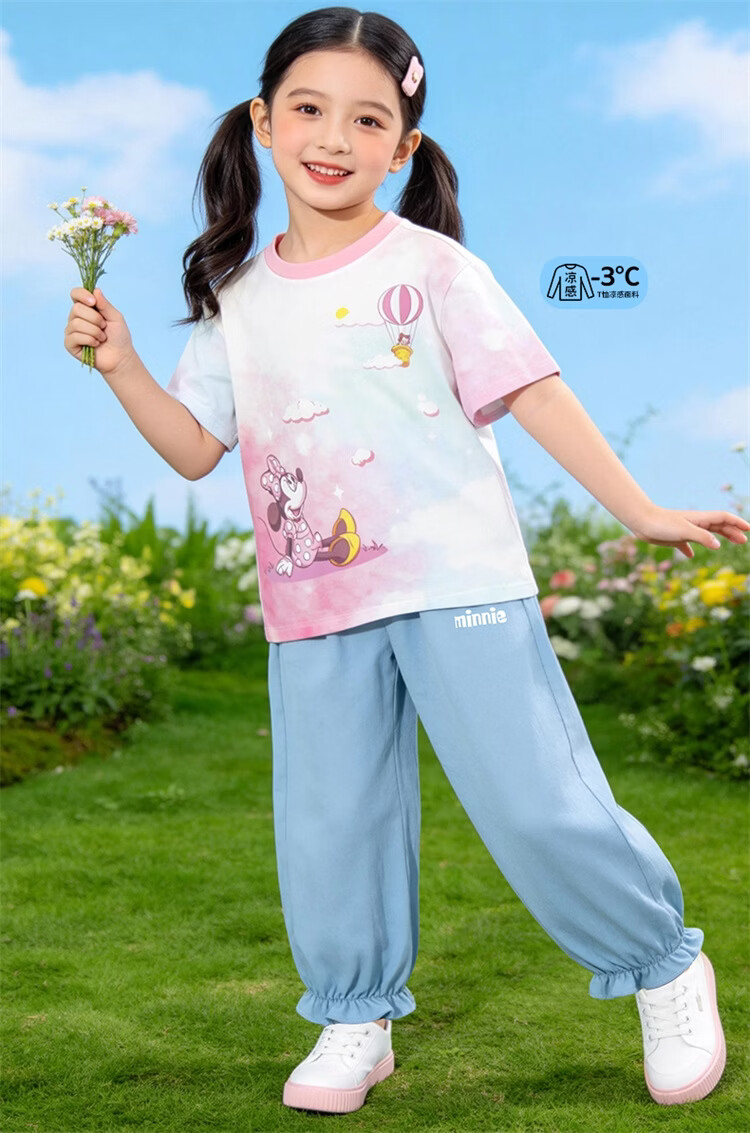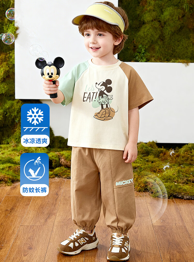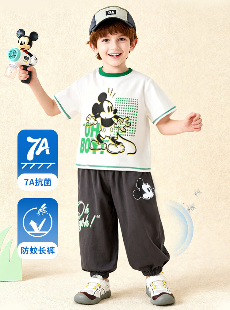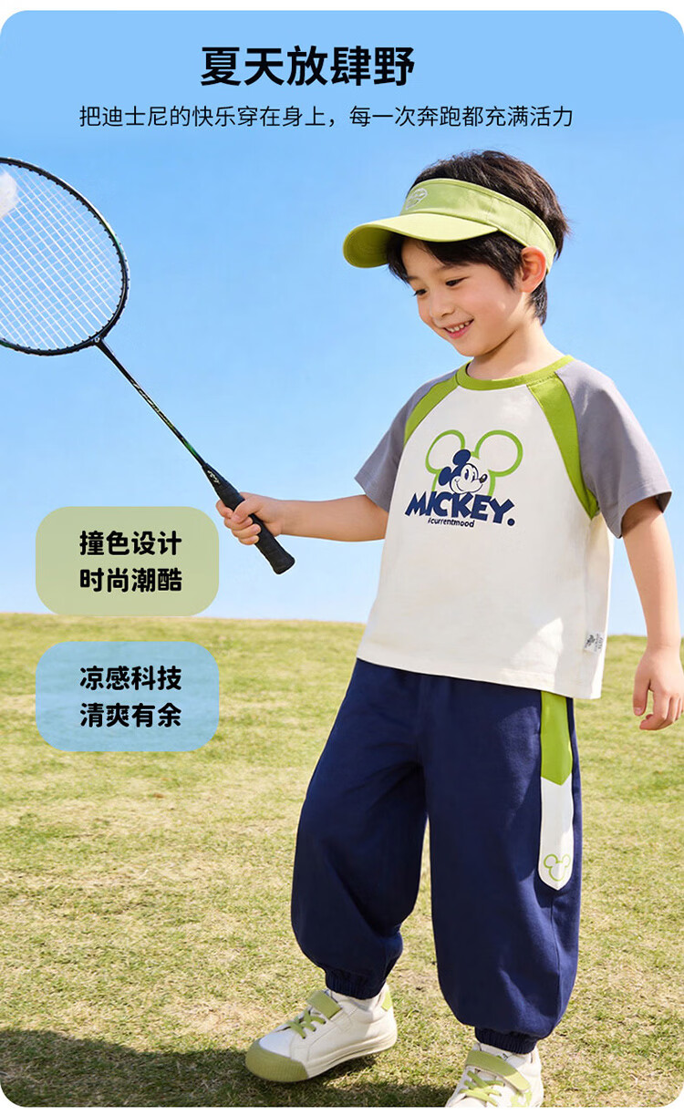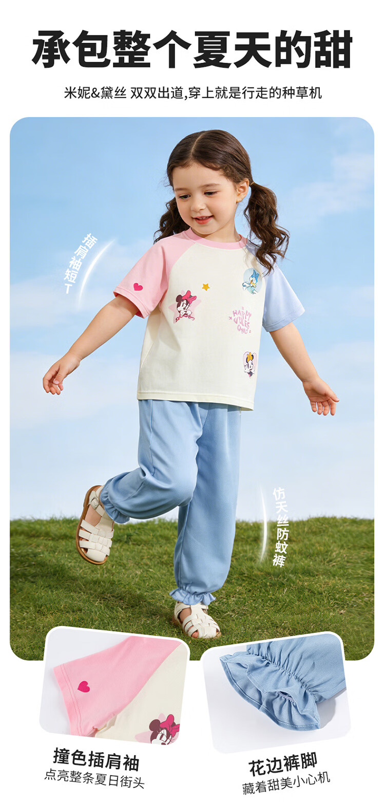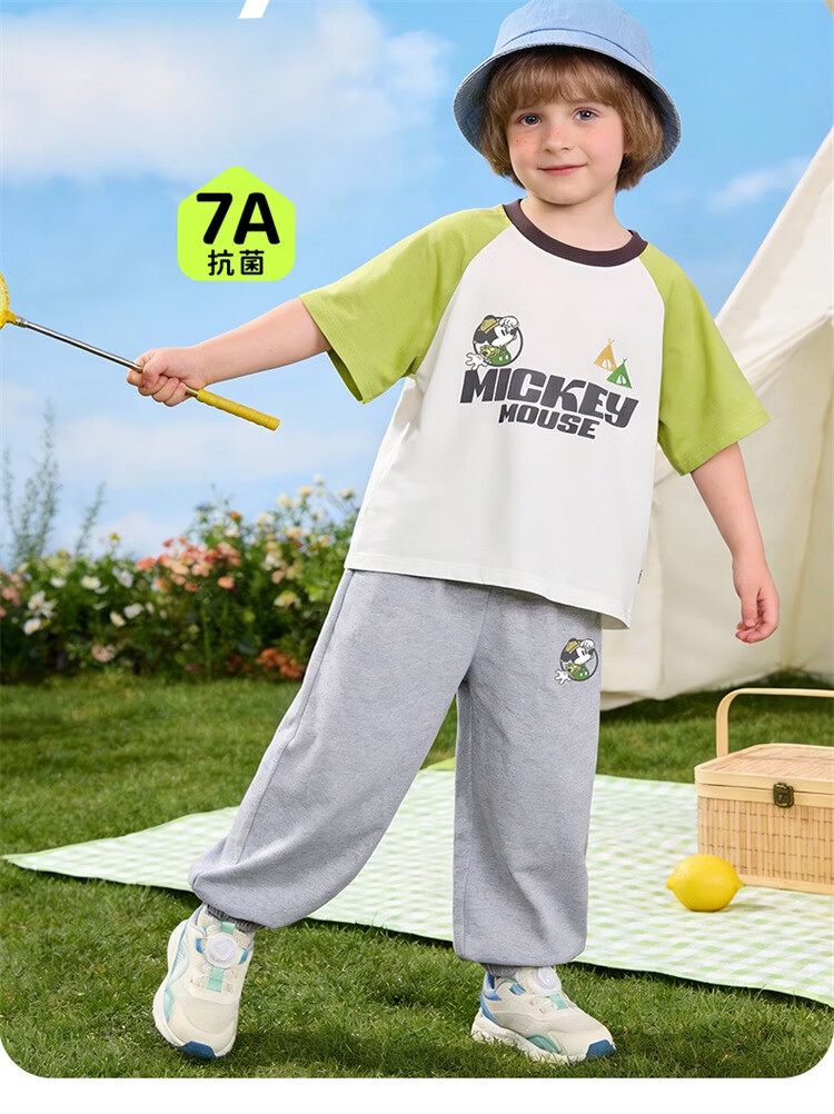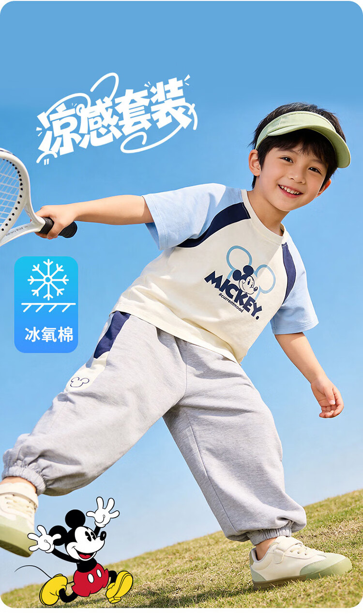 迪士尼儿童舒适凉感休闲短袖长裤套装夏季新款男女童甜美潮流运动套装 碳灰插肩袖套装 100 (建议2-3岁身高90-100cm)