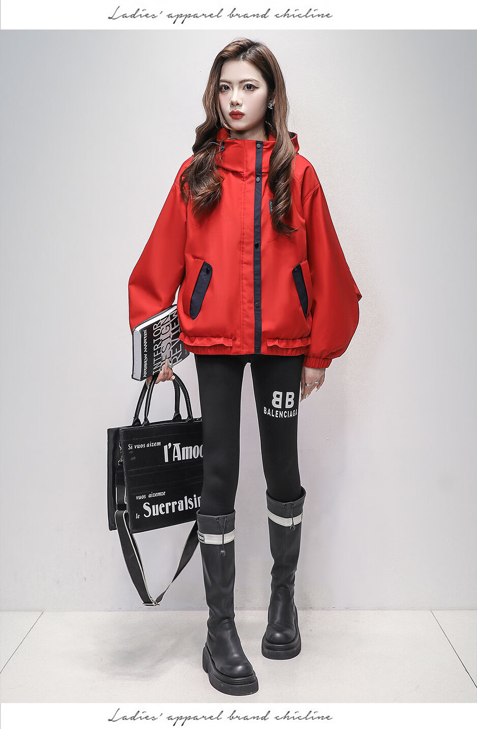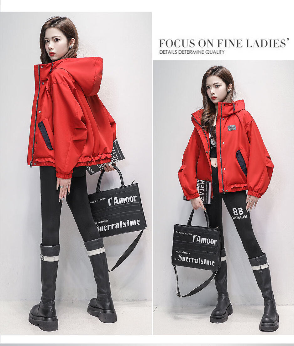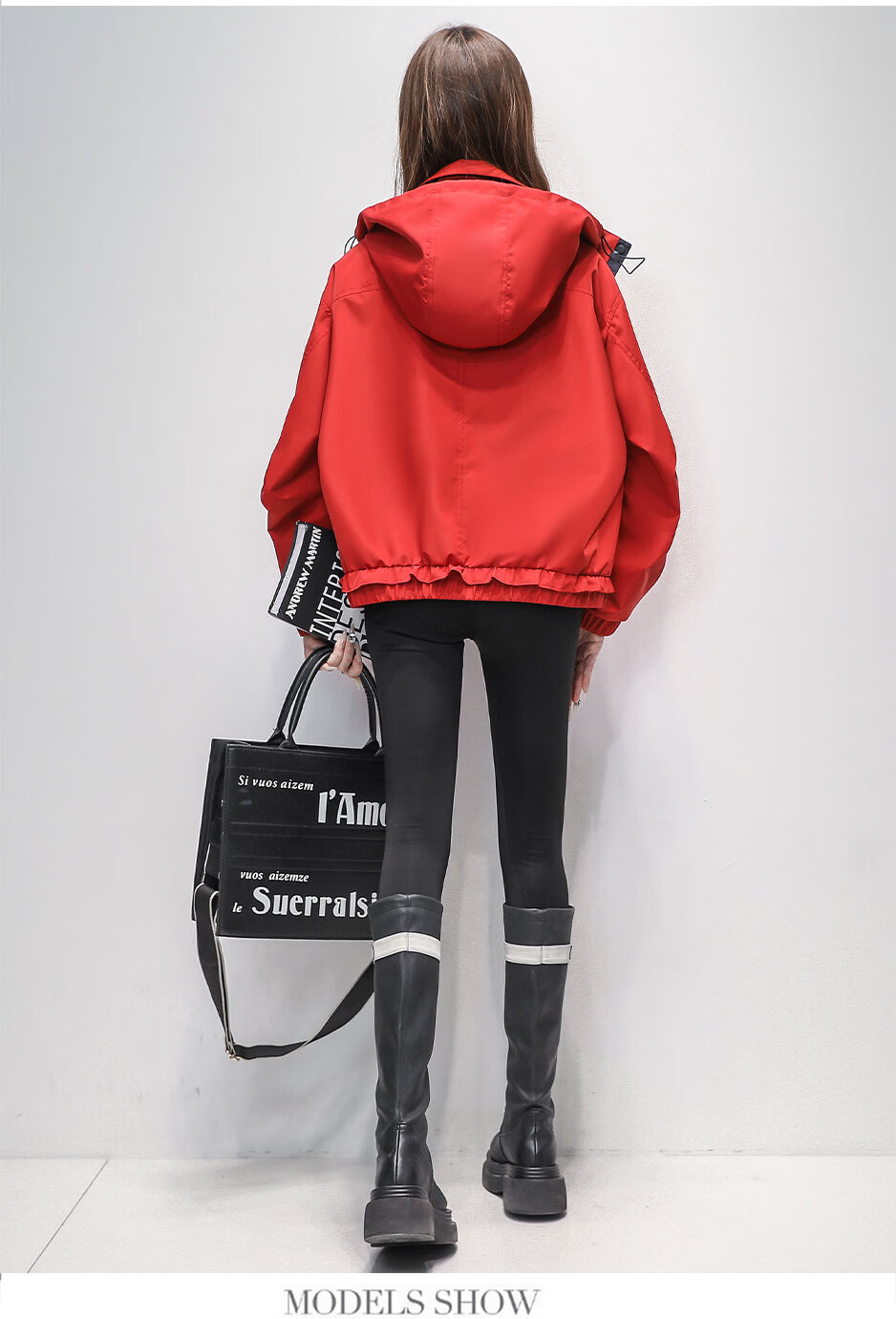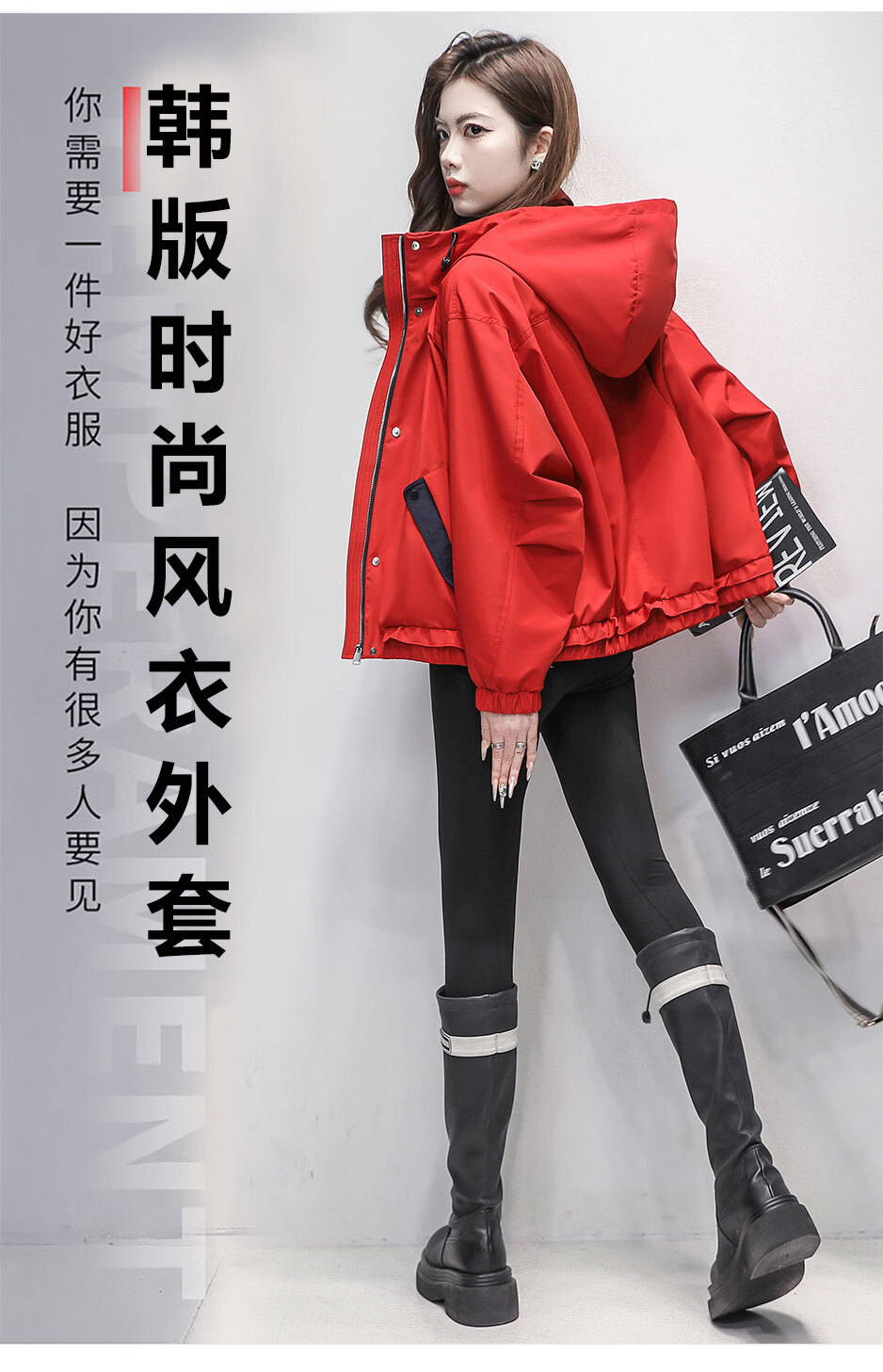 靓丽芭娜(LIANGLIBANA)2026春季新款小个子短款外套女连帽夹克韩版宽松休闲红色风衣外套 红色 薄款 L