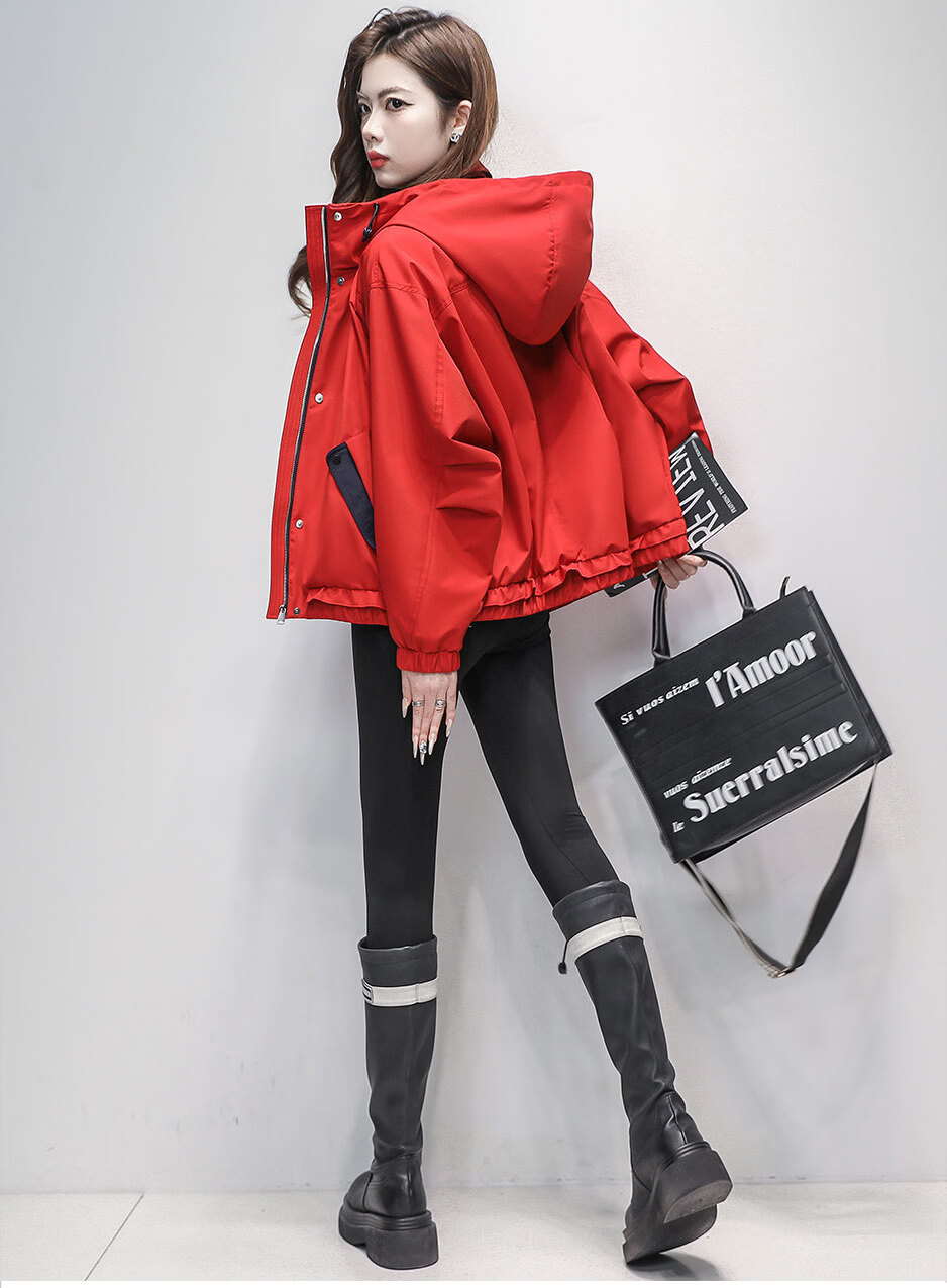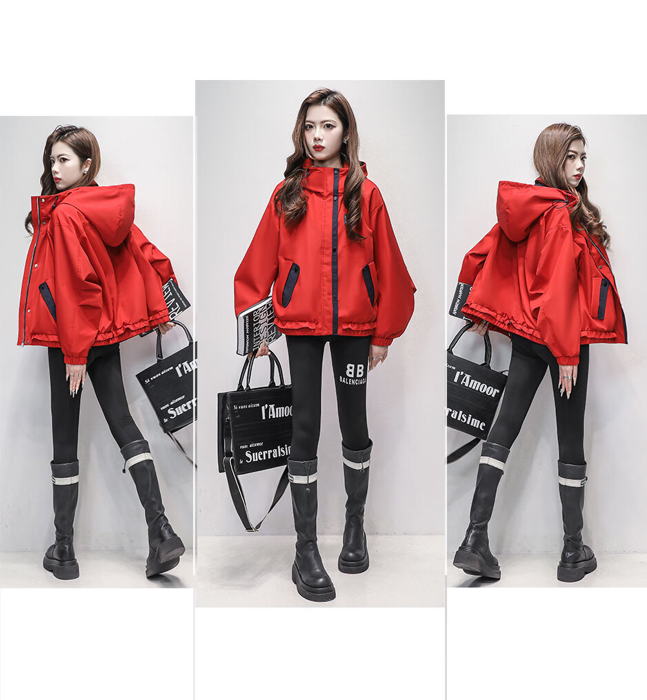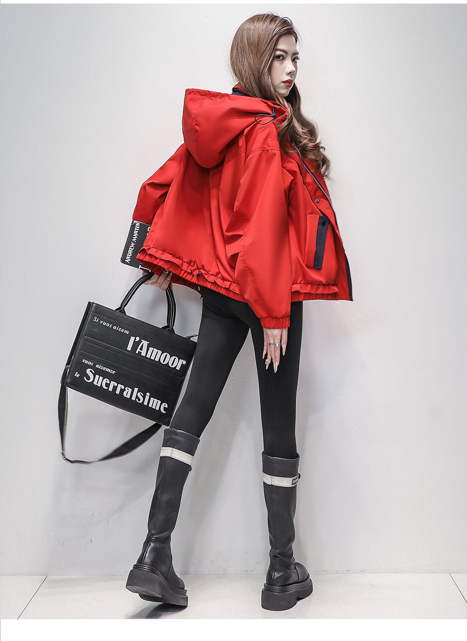 靓丽芭娜(LIANGLIBANA)2026春季新款小个子短款外套女连帽夹克韩版宽松休闲红色风衣外套 红色 薄款 L