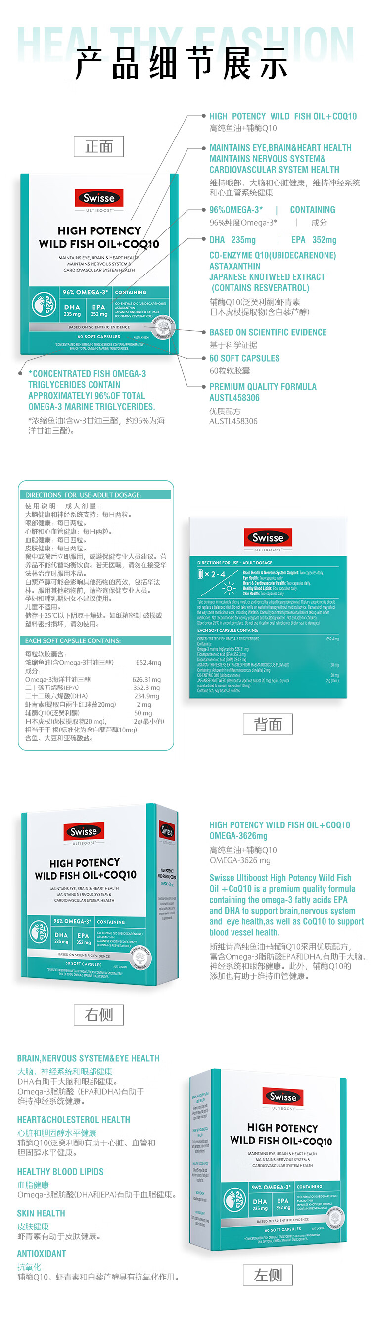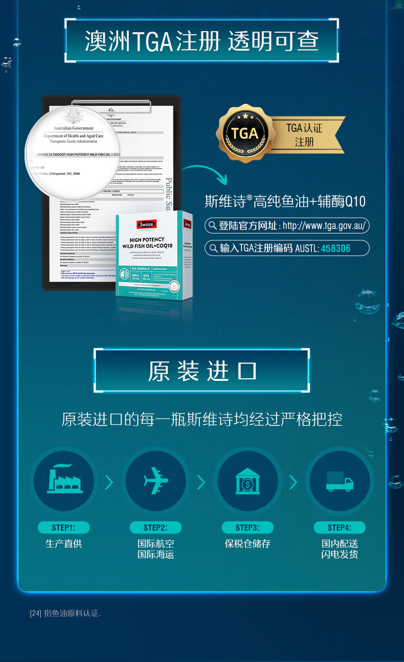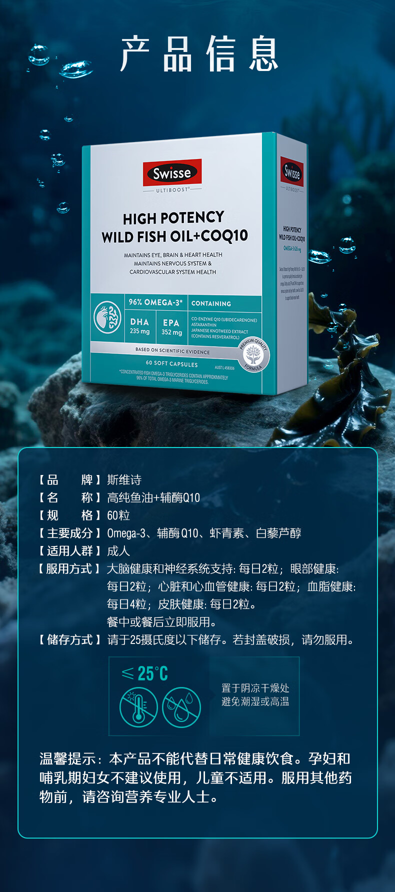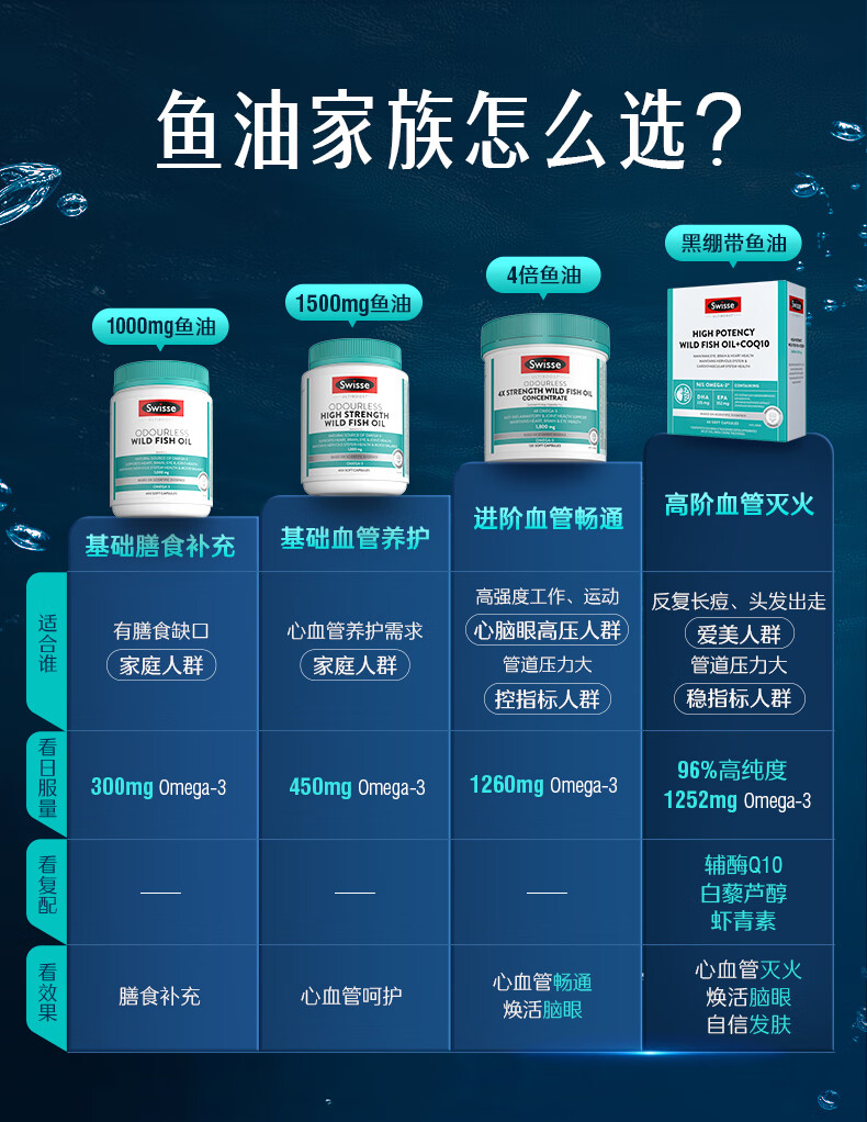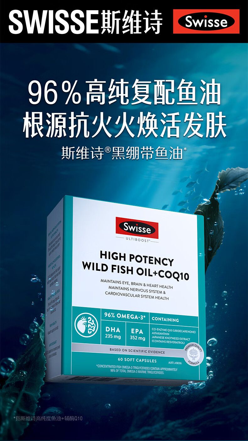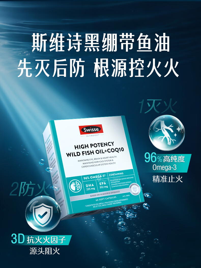 Swisse斯维诗 96%高纯度深海鱼油辅酶Q10软胶囊 黑绷带鱼油60粒 Omega-3