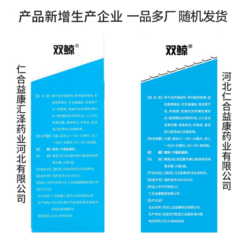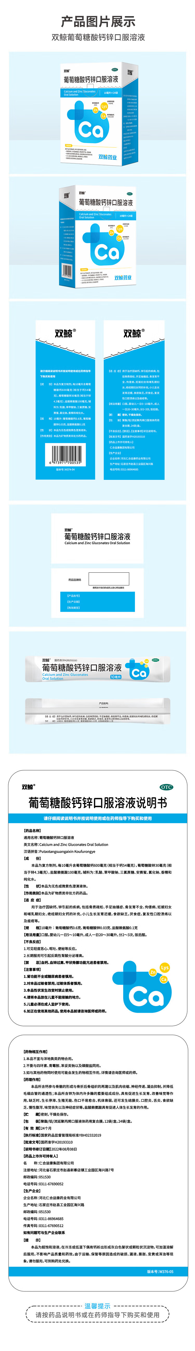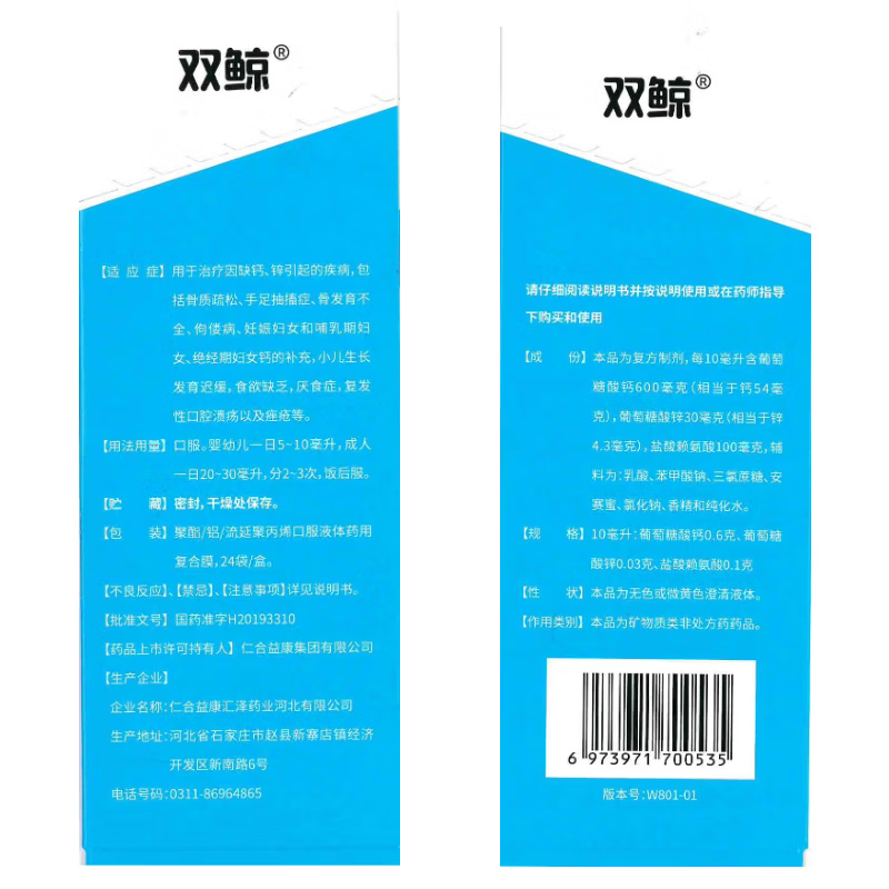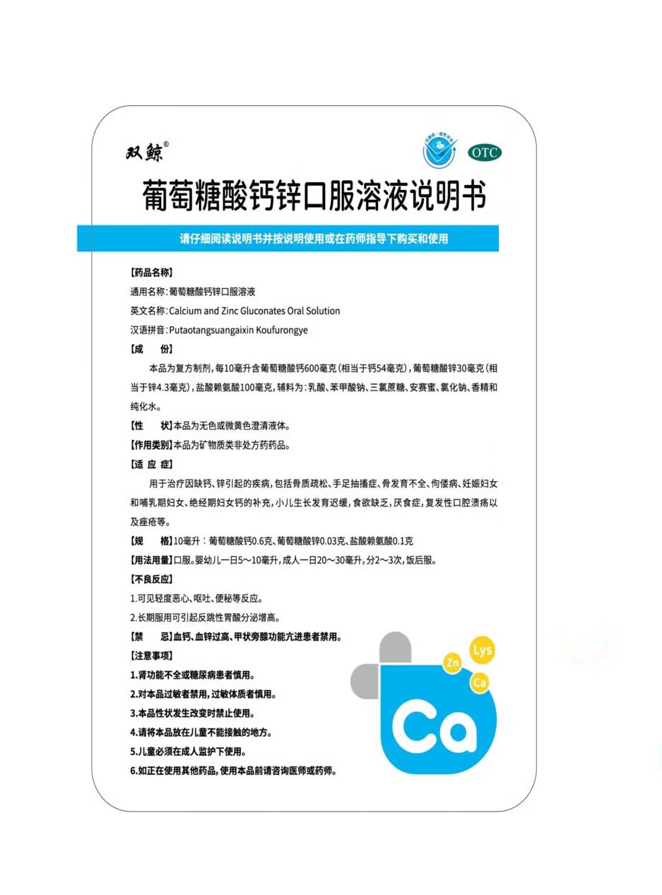 双鲸葡萄糖酸钙锌口服溶液10ml*24袋 治疗缺钙锌引起的厌食 小儿生长发育迟缓 儿童钙液体钙长高青少年补钙