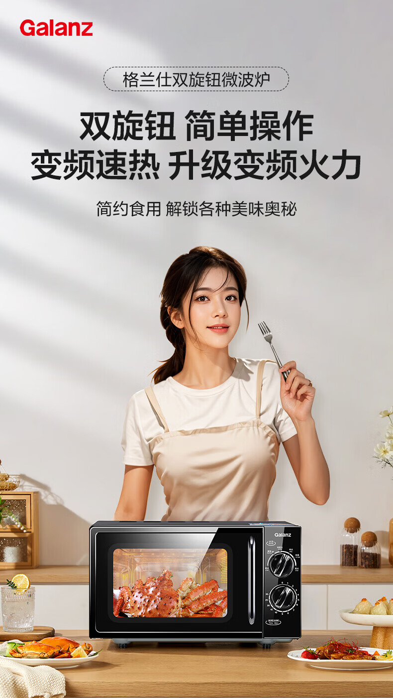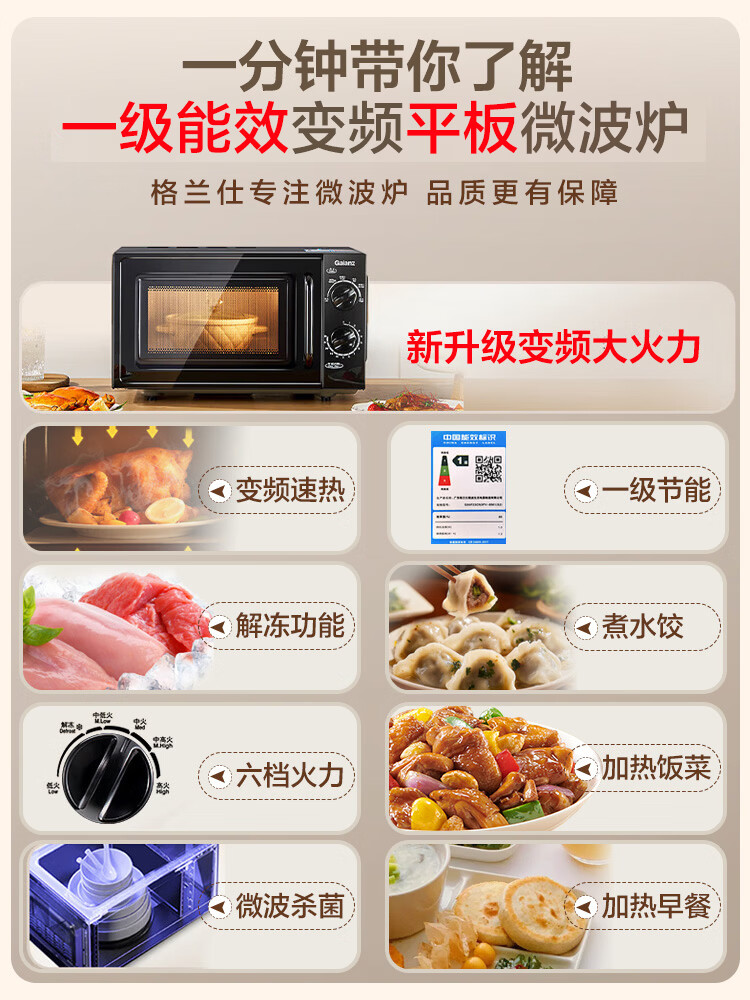 格兰仕变频微波炉家用小型复古20L智能多功能一体机 平板易清洁速热解冻 双旋钮便捷操作 一级能效DG 20L变频平板一级能效