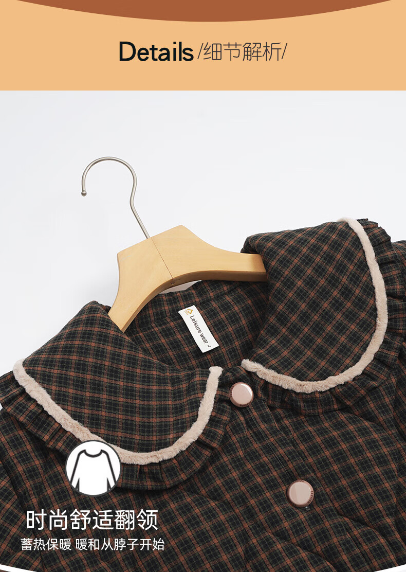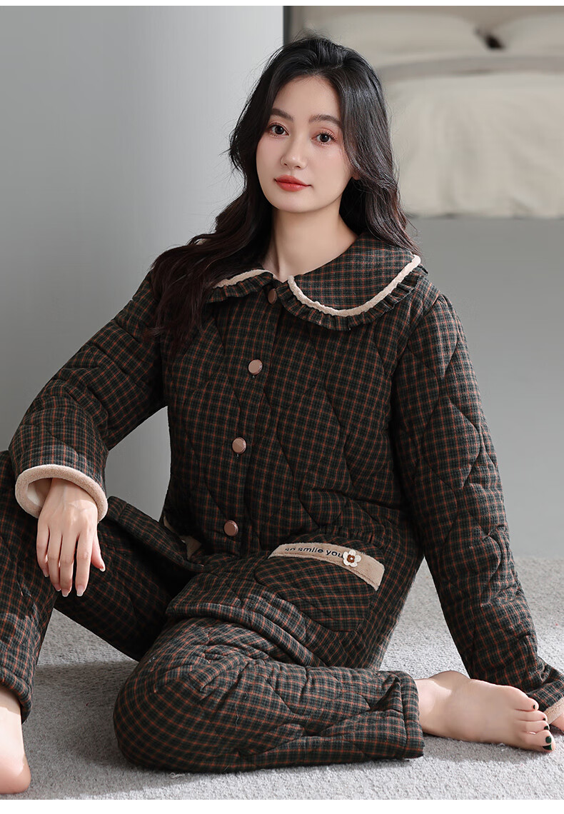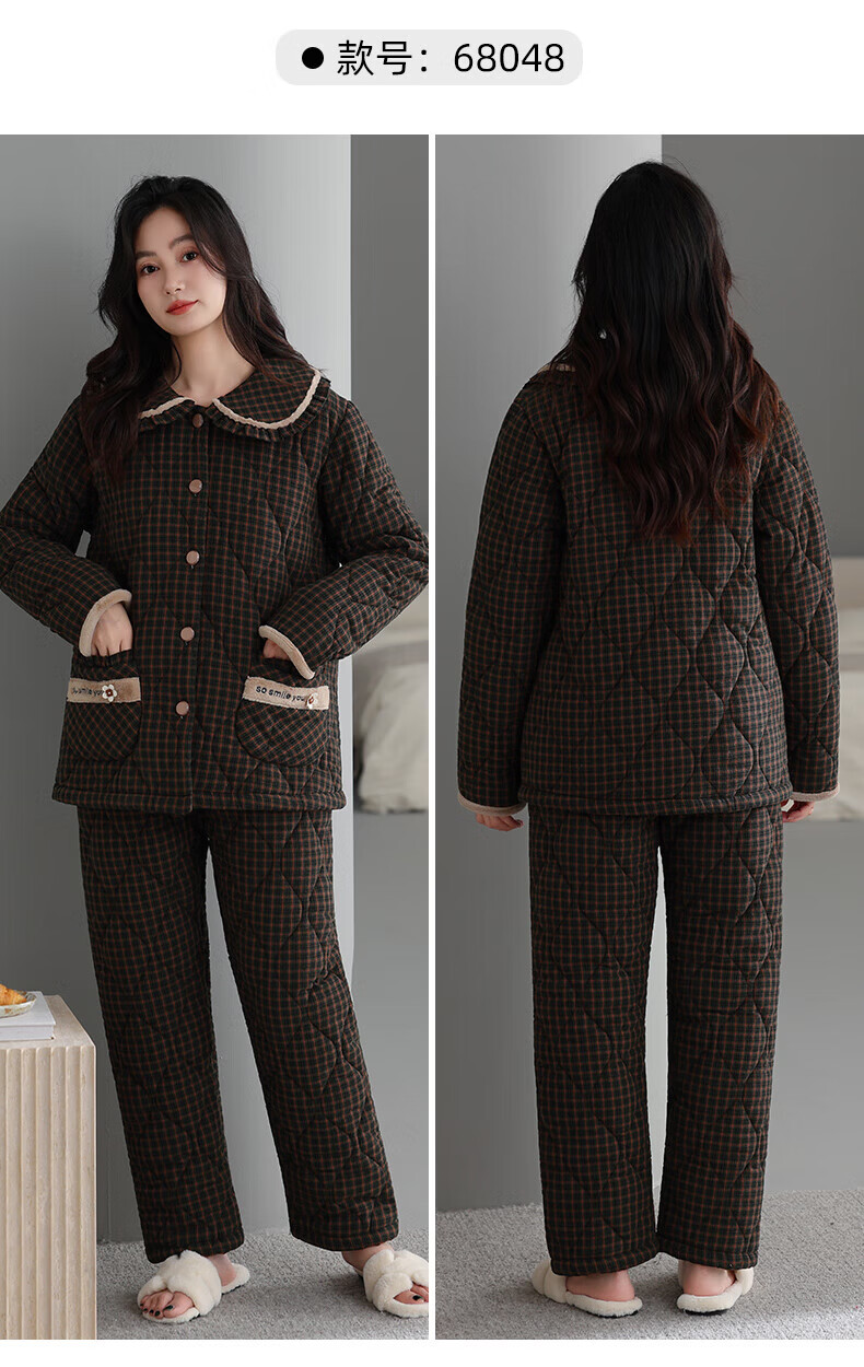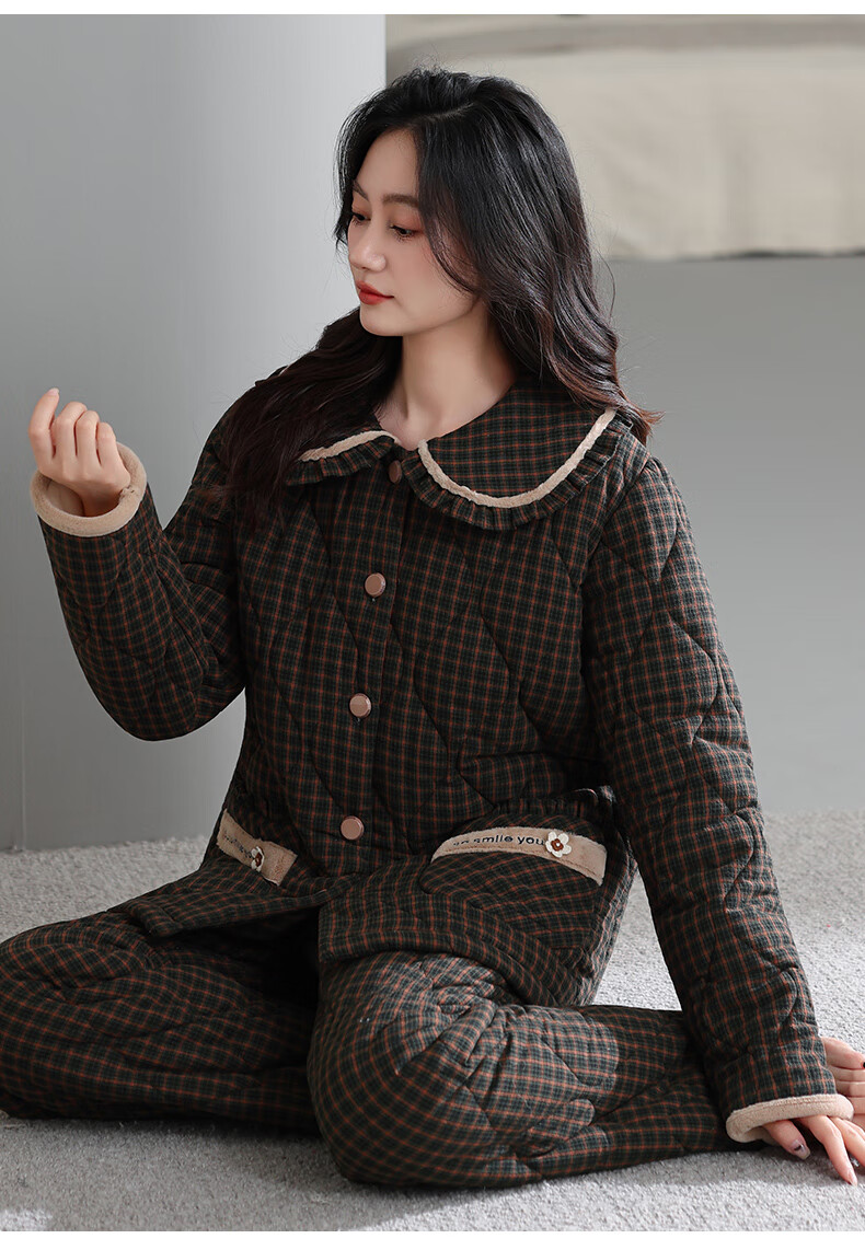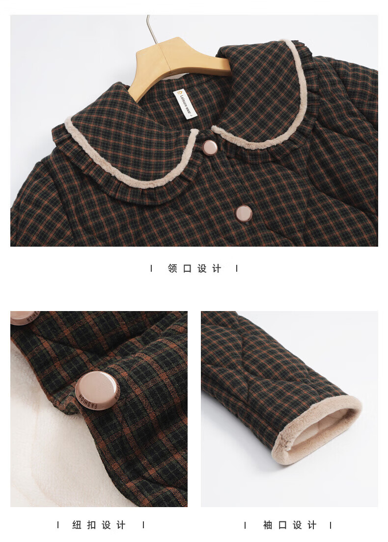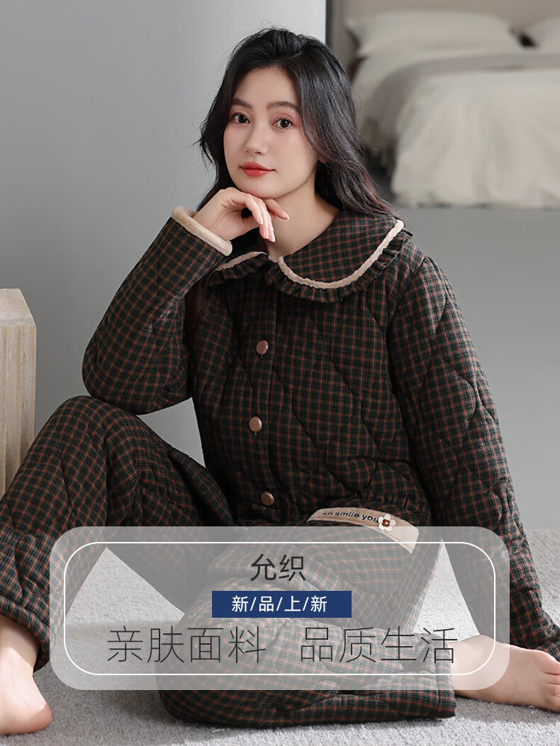 允织睡衣女冬季三层加厚加绒梭织纯棉夹棉袄秋冬款珊瑚绒高级感家居服 68048-黑咖 M (160) :建议90-110斤穿着