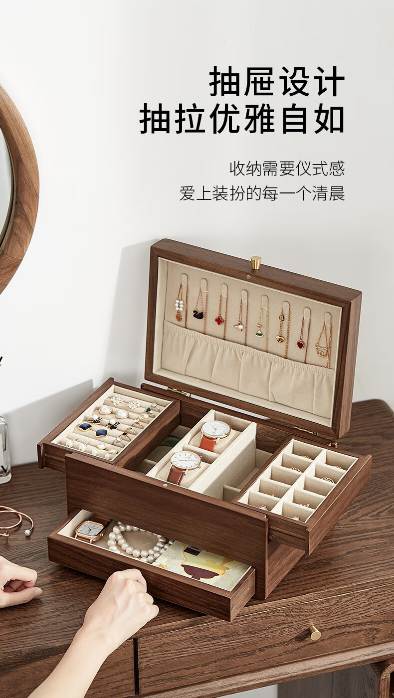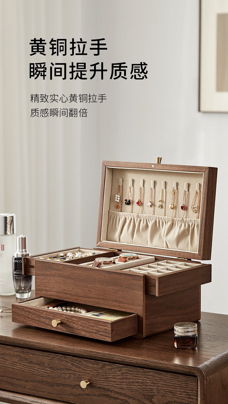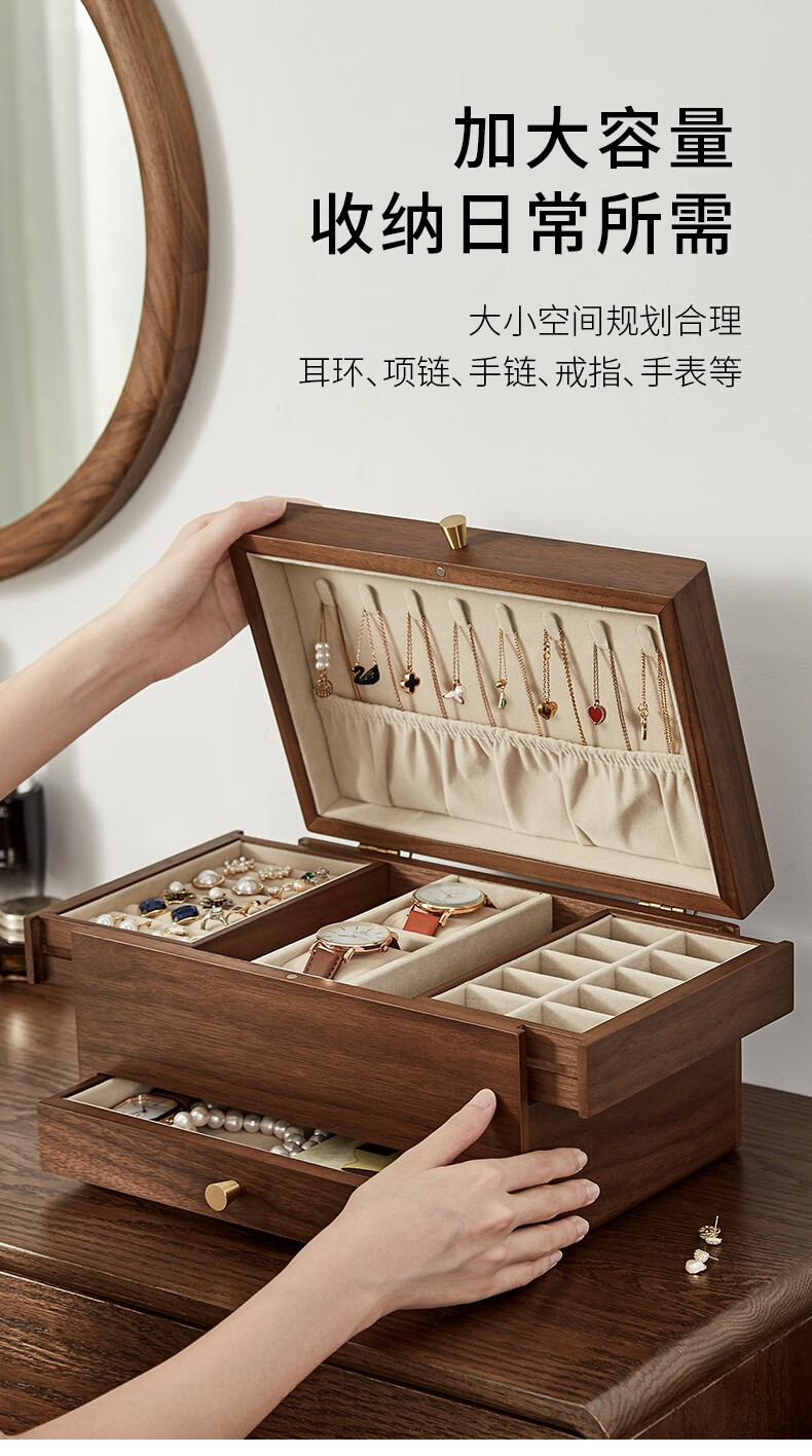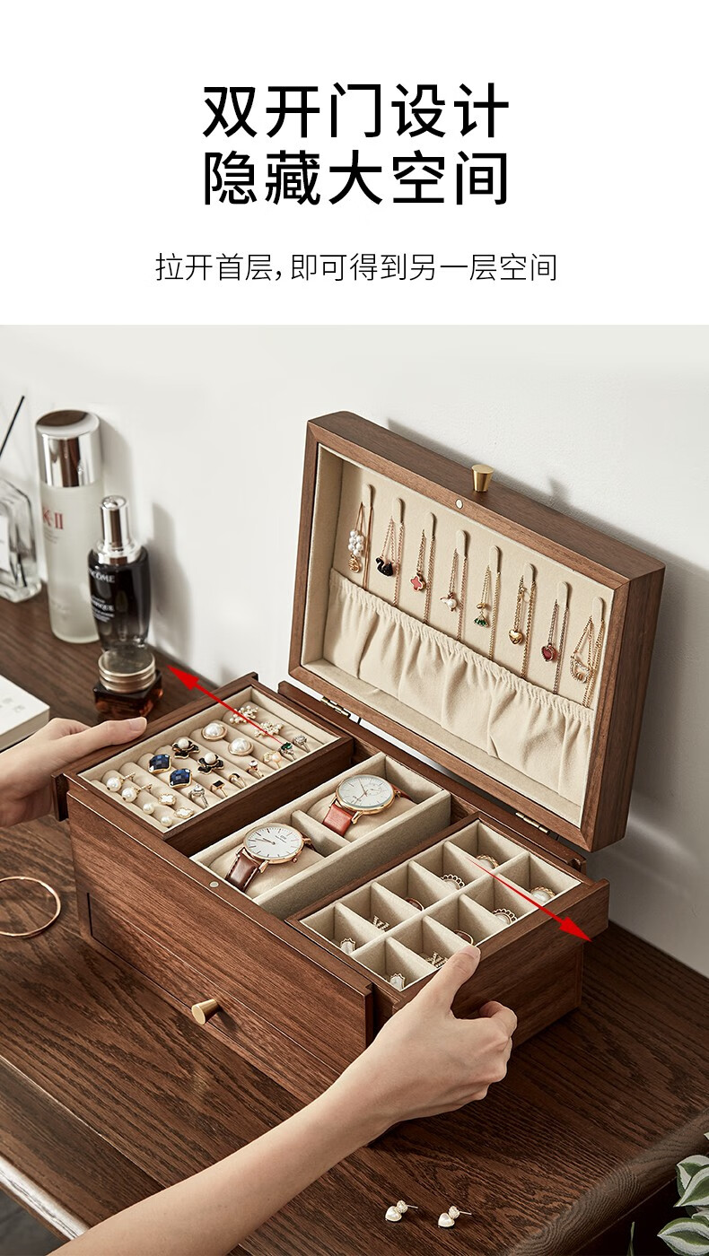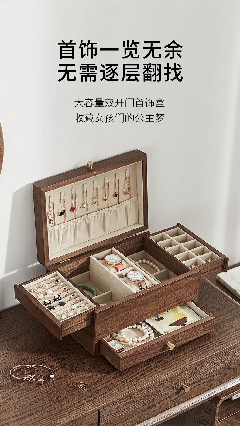 初心胡桃木首饰盒饰品盒生日新婚礼物送女生多层大容量珠宝手镯收纳盒 双开门大容量首饰盒(带镜子)