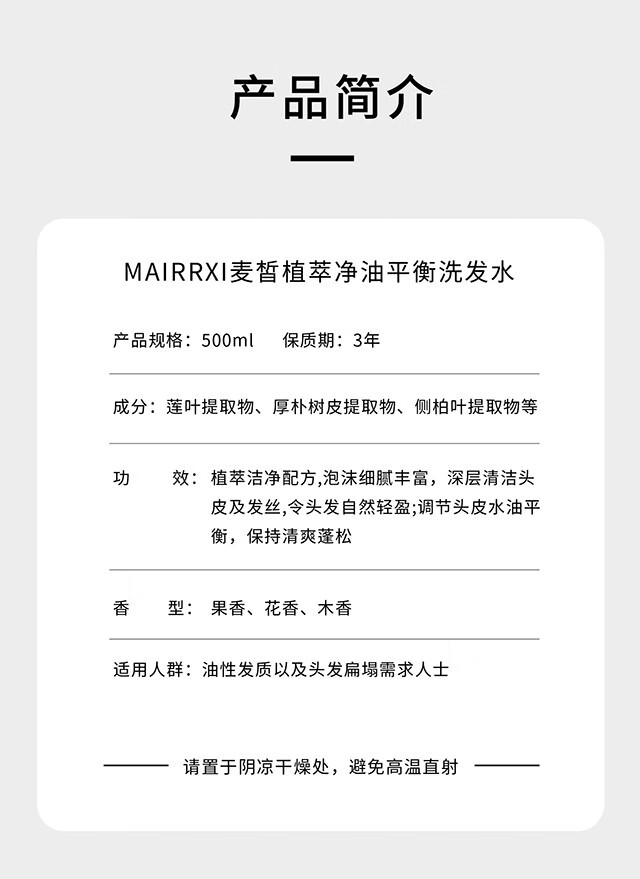 麦皙植萃洗发水保湿护发舒缓头皮控油清爽蓬松留香洗发膏 500ml