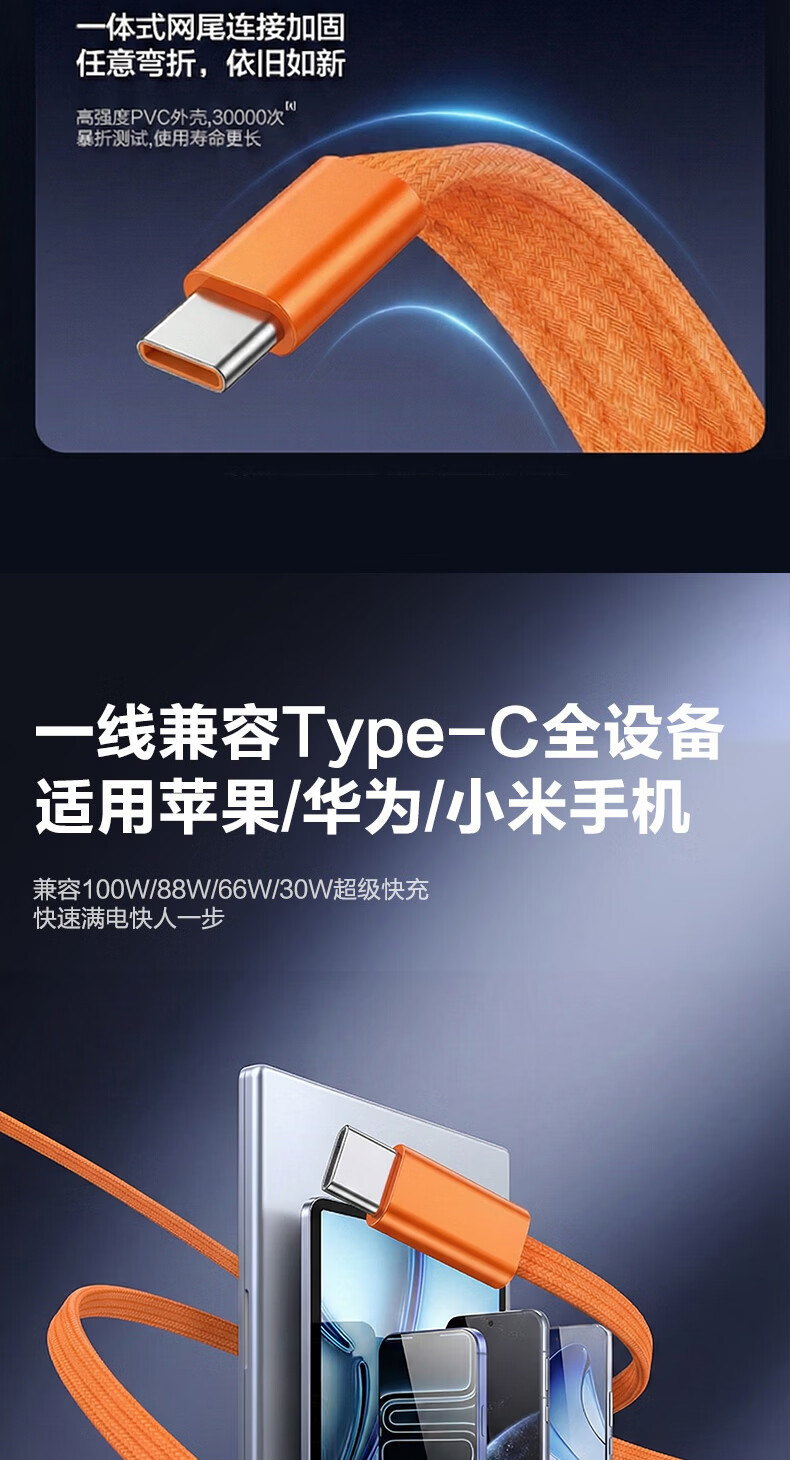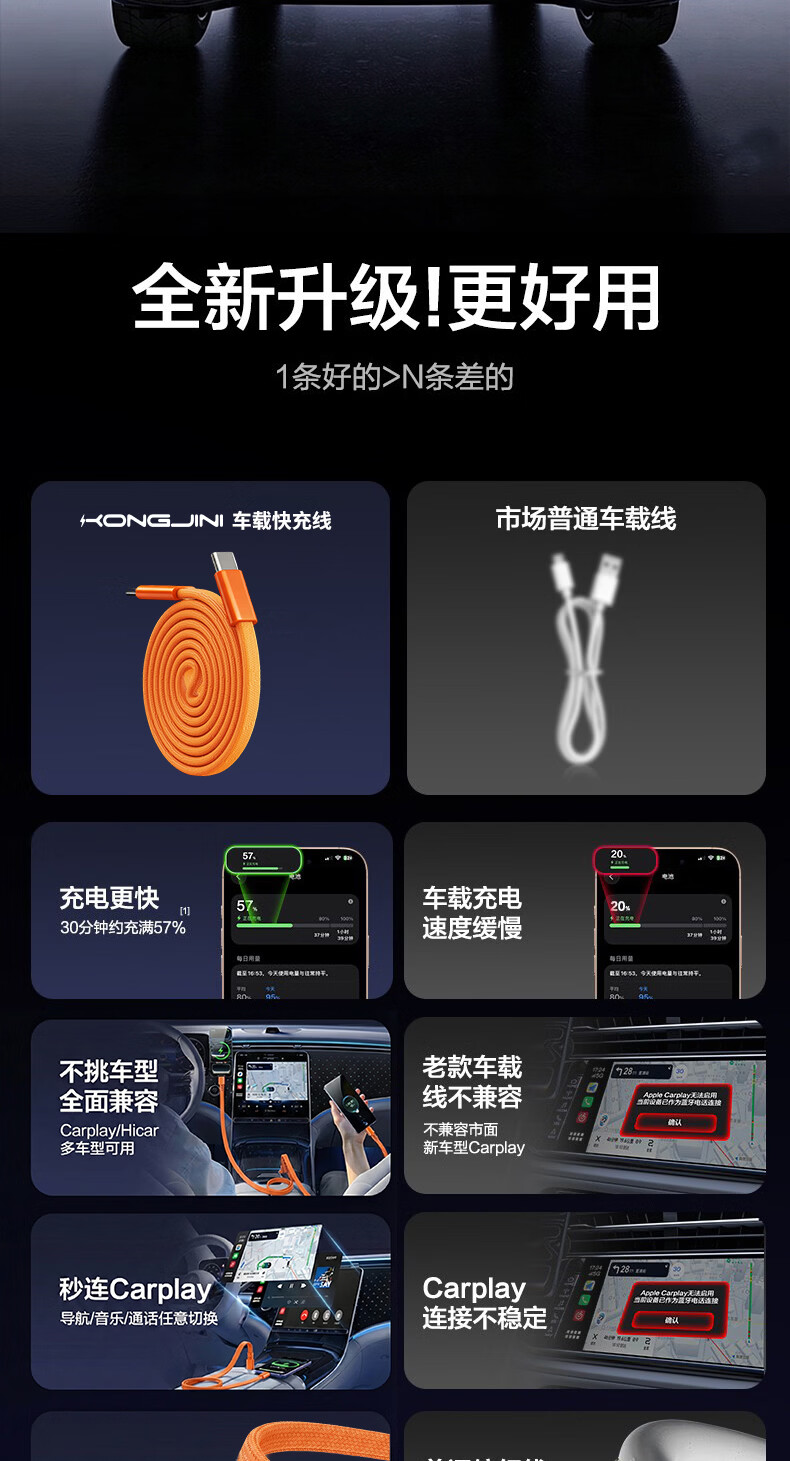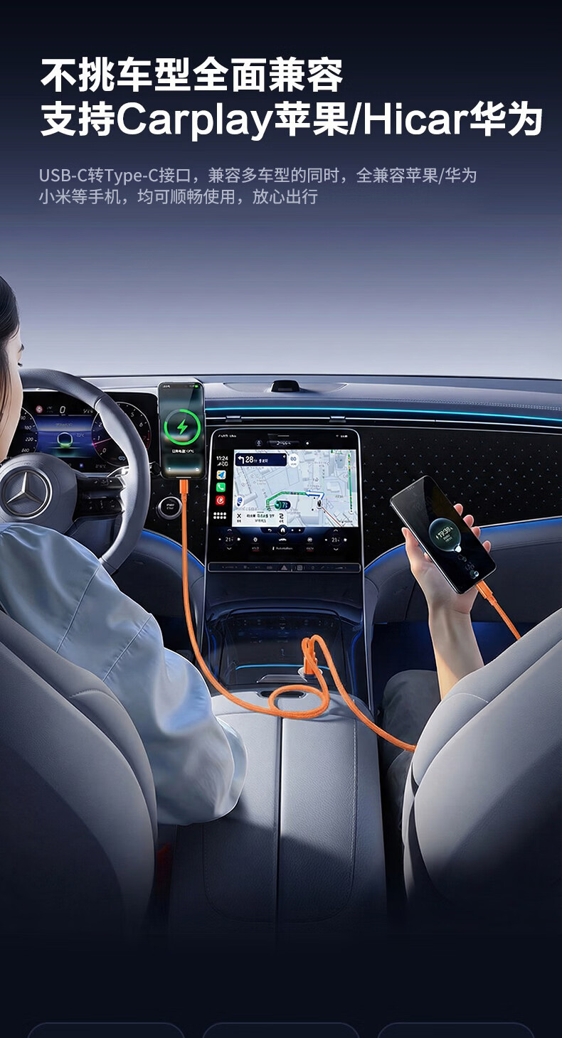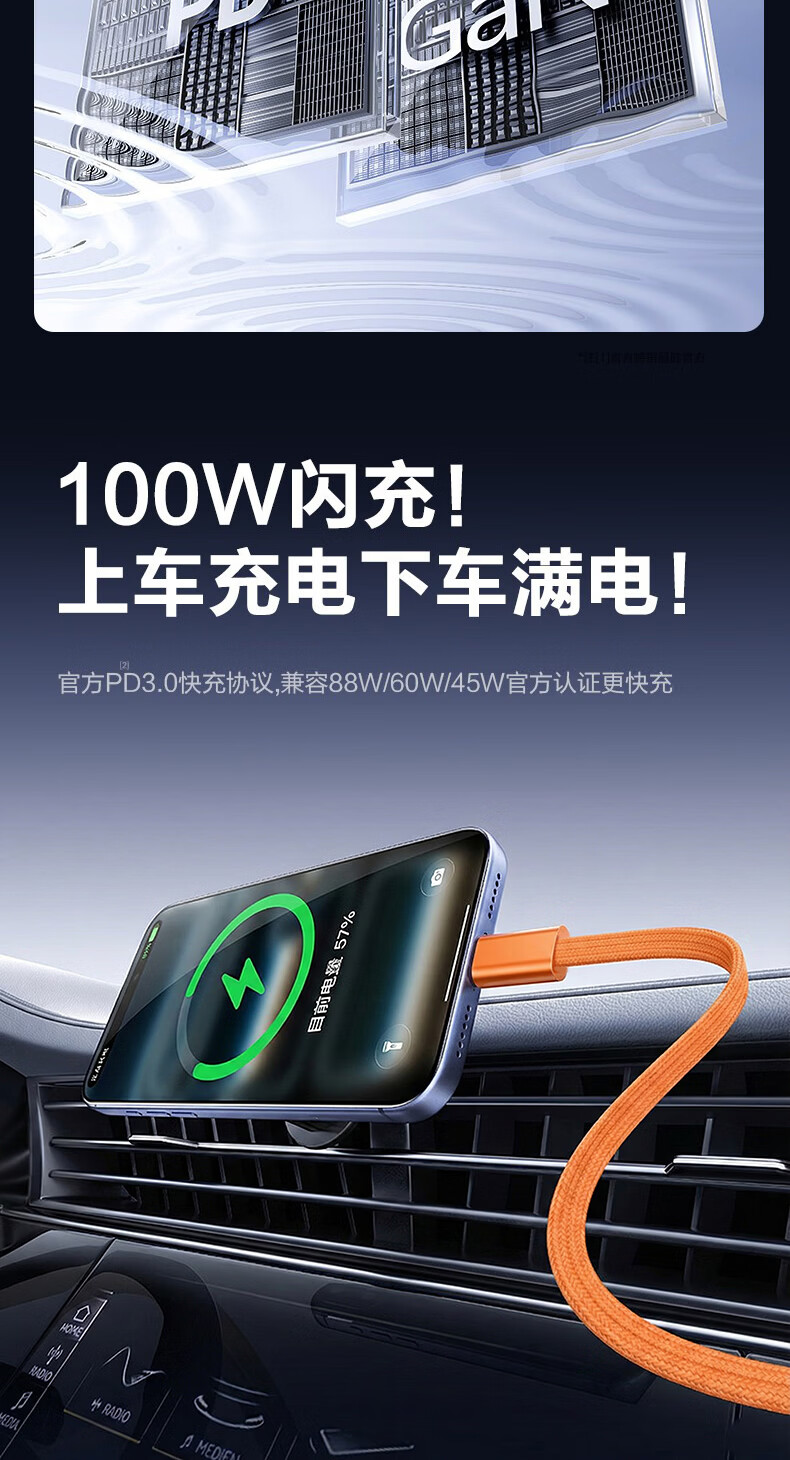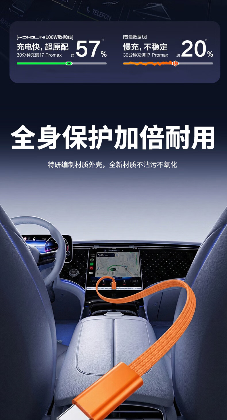 港吉尼(KONGJINI)双头Type-C车载超级快充电数据线PD100W用平板iPad苹果17/16华为手机笔记本专用【赠手机支架】 信息说明:一年内质保免费换新 1m