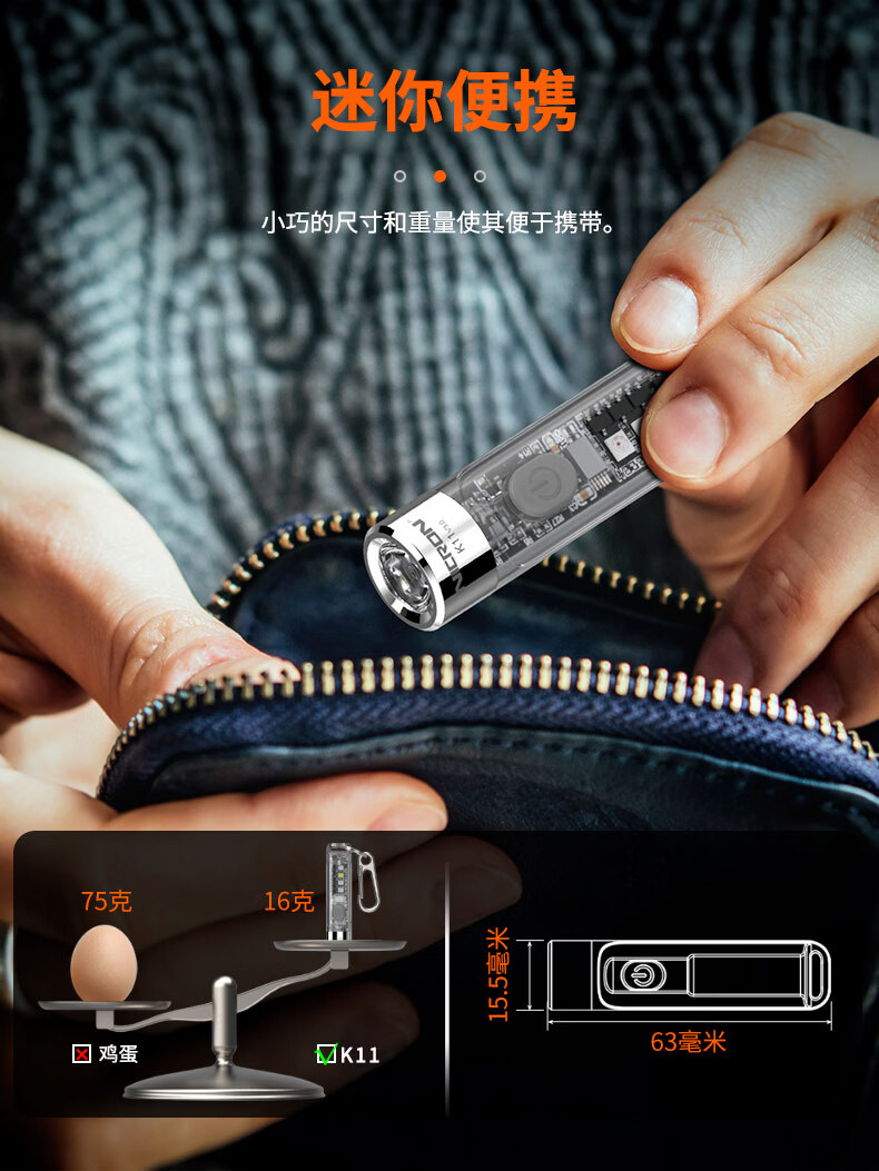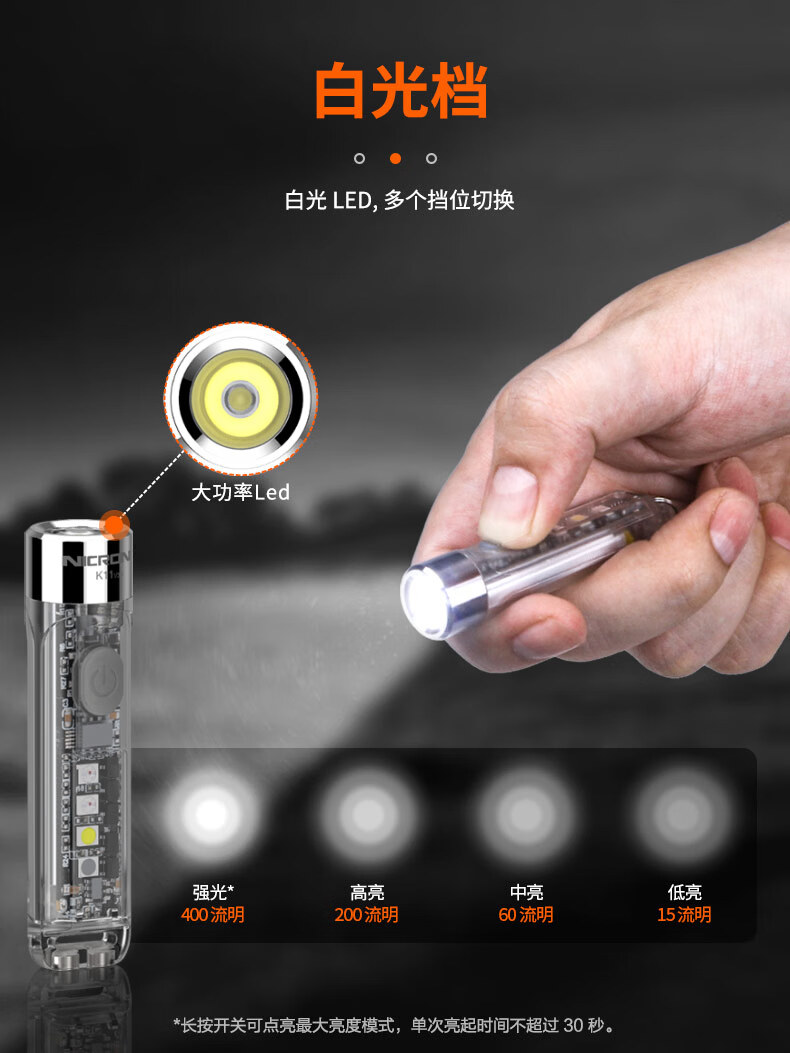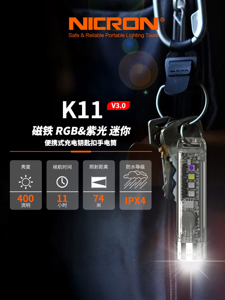 耐朗(NICRON)便携充电钥匙扣手电筒 K11 V3.0 防水强光 轻便可充电磁吸小手电 K11 V3.0【白光400LM+暖紫红蓝辅助光】【手电+USB线】