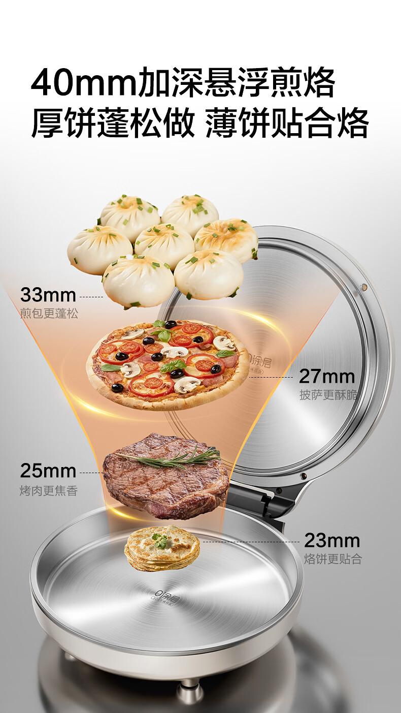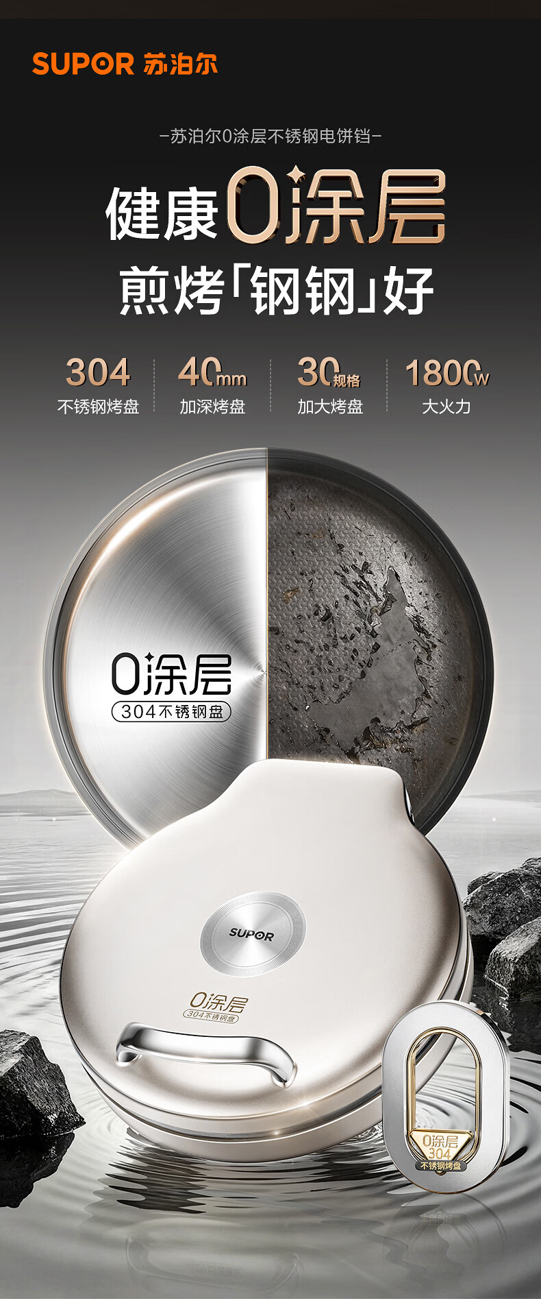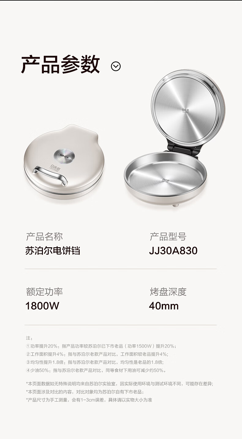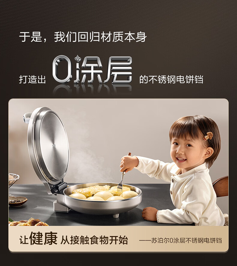 苏泊尔(SUPOR)电饼铛 0涂层304不锈钢 电饼档家用 煎饼锅烤肉锅 烙饼锅早餐机煎烤机 40mm加深 JJ30A830