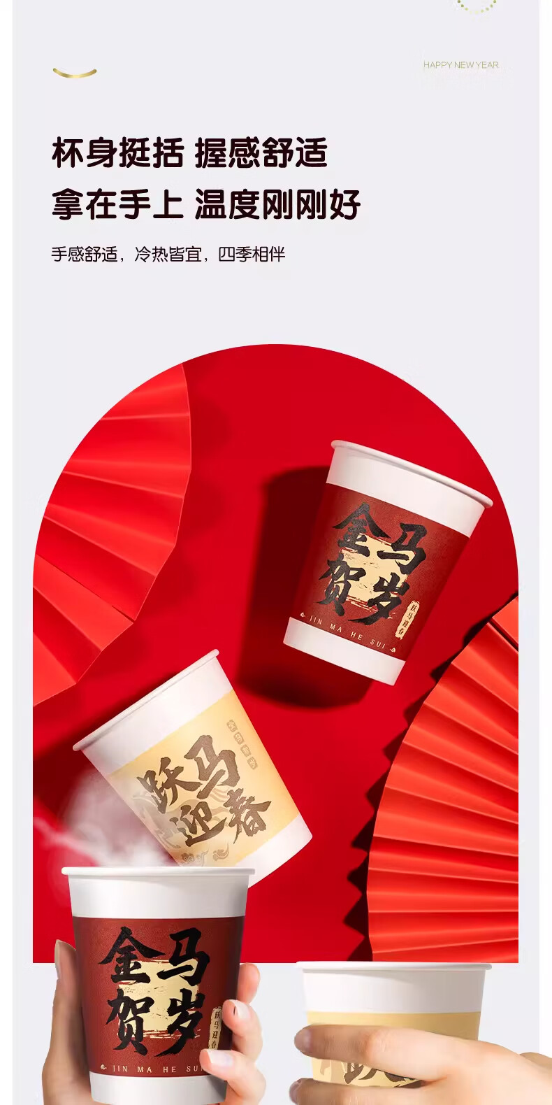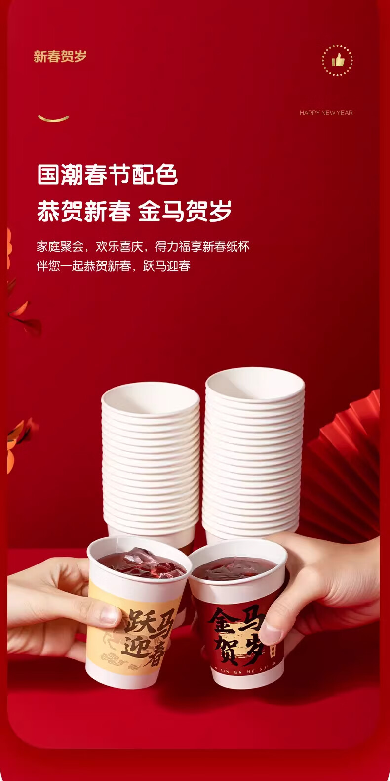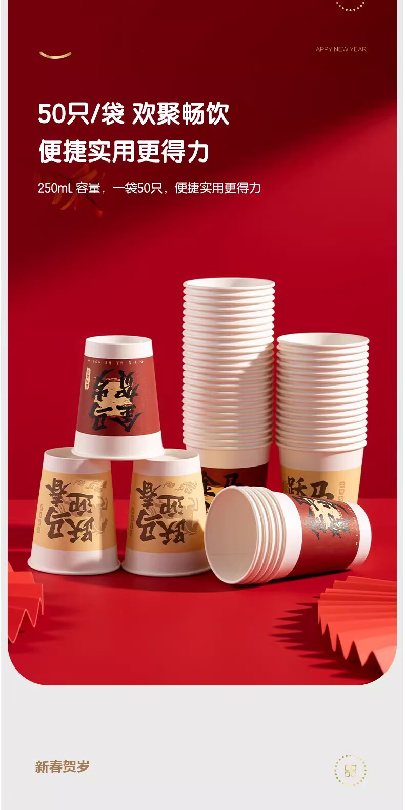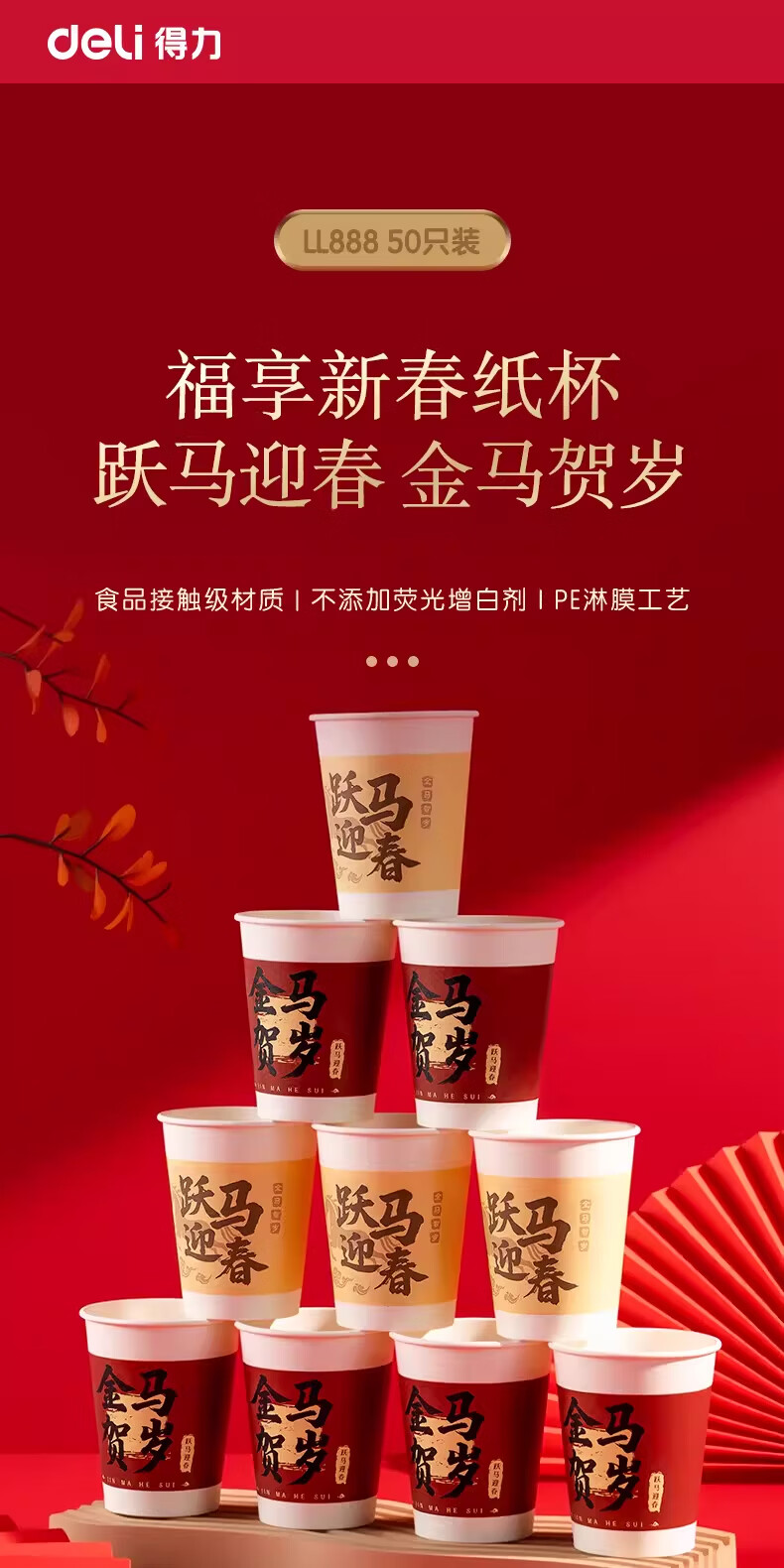 得力新年纸杯一次性红色2026马年茶水杯子加厚食品家用级热饮纸杯结婚 250ml新年加厚款50只装【金马贺春】