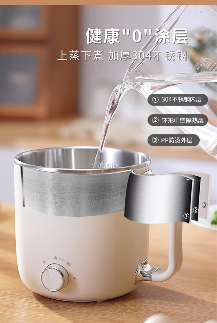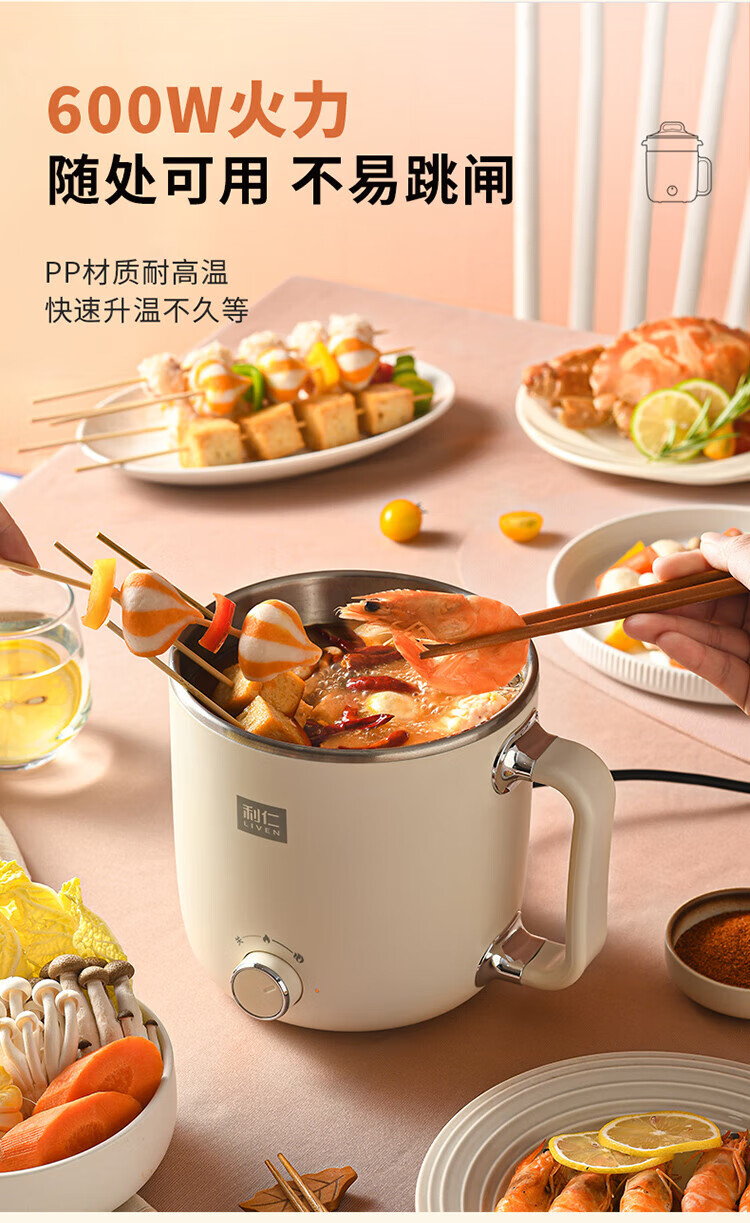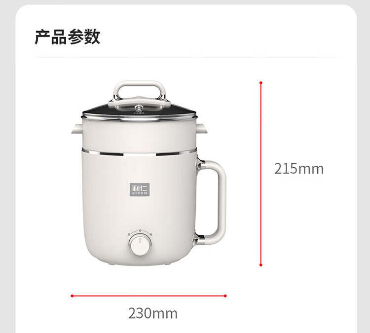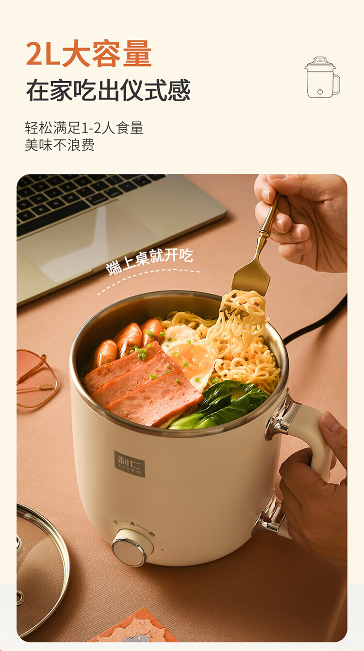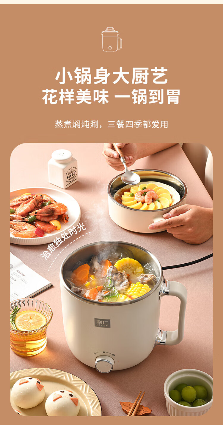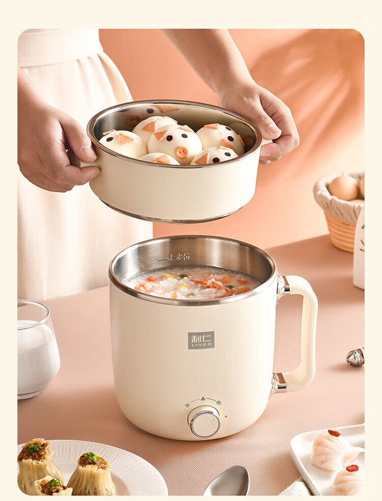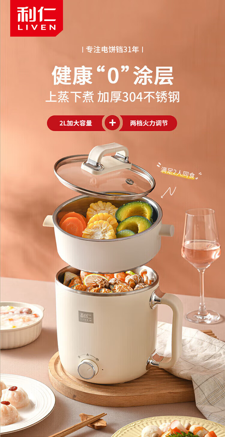 利仁(Liven)电煮锅电热锅304不锈钢0涂层内胆宿舍小电锅电蒸锅学生一体泡面锅多功能小火锅2升带蒸屉DHG-B205