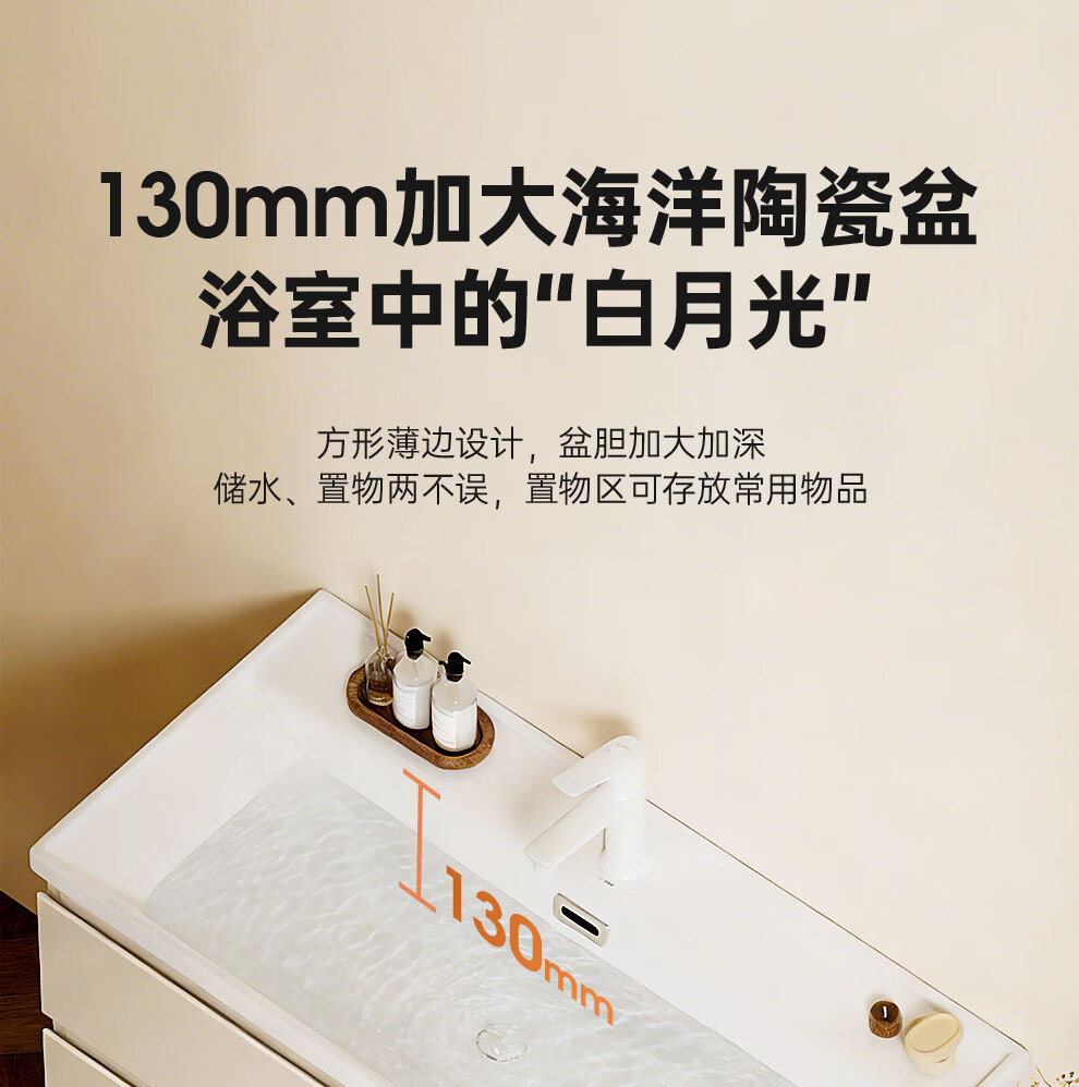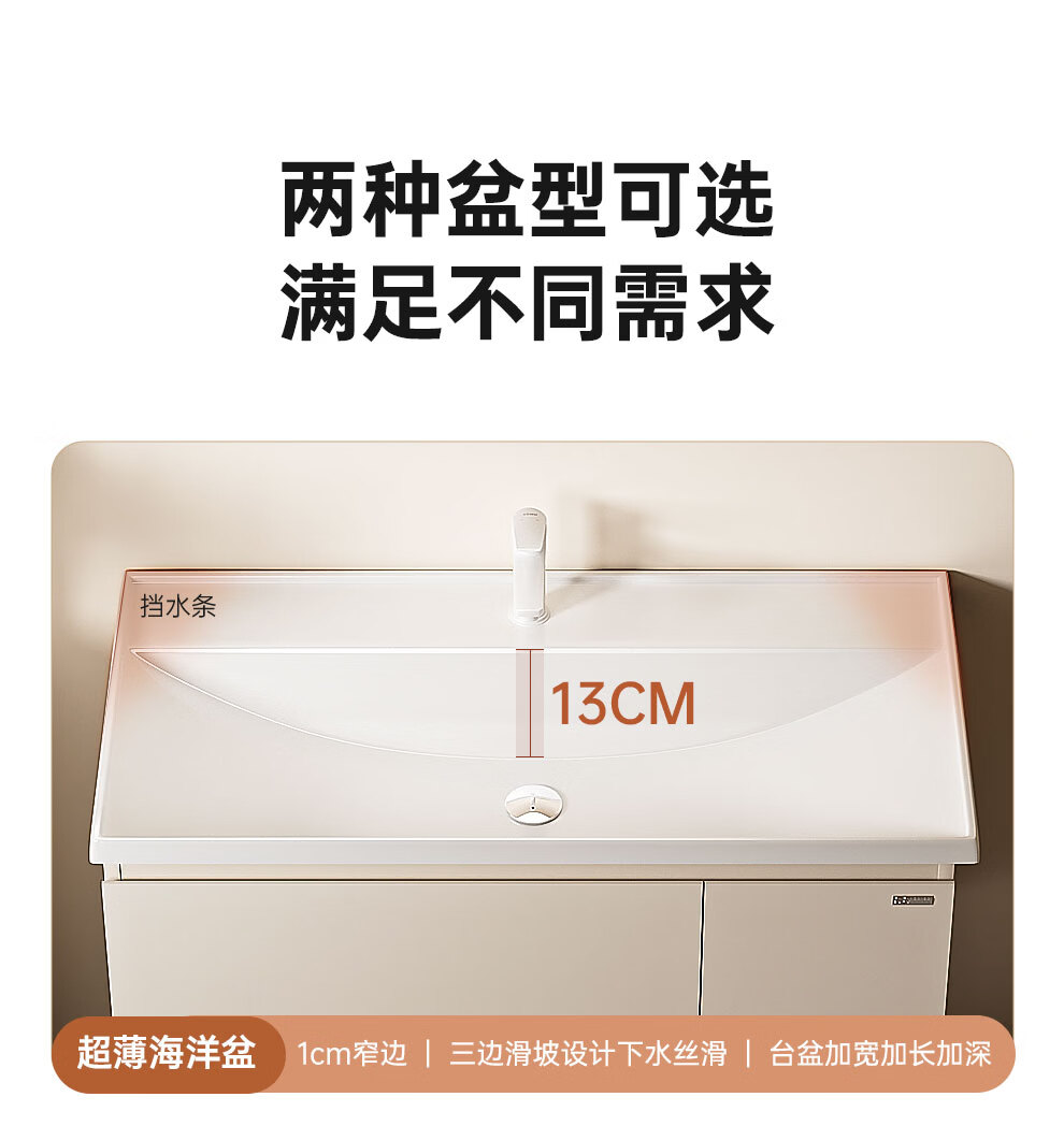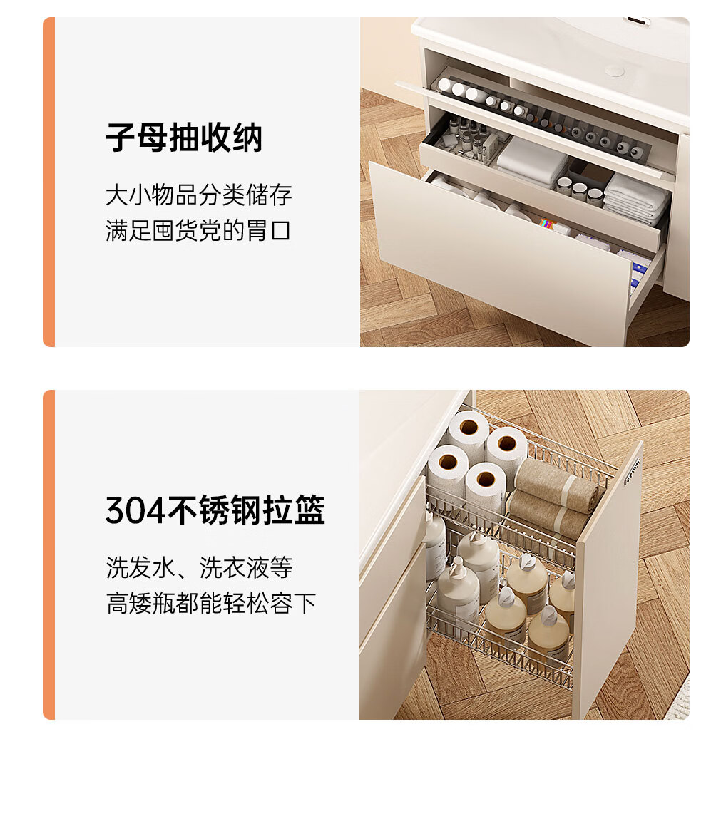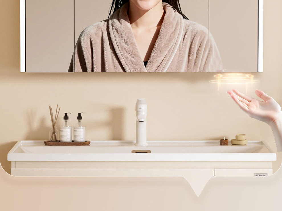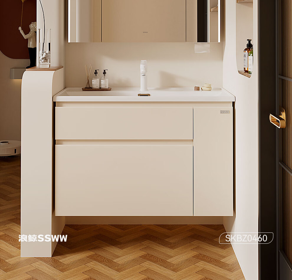 浪鲸(SSWW)卫浴新款日式浴室柜奶油风实木盆柜组合一体不锈钢拉篮浴室柜460 90cm【环绕灯智能美妆镜柜+除雾+海洋盆】 【不含龙头】