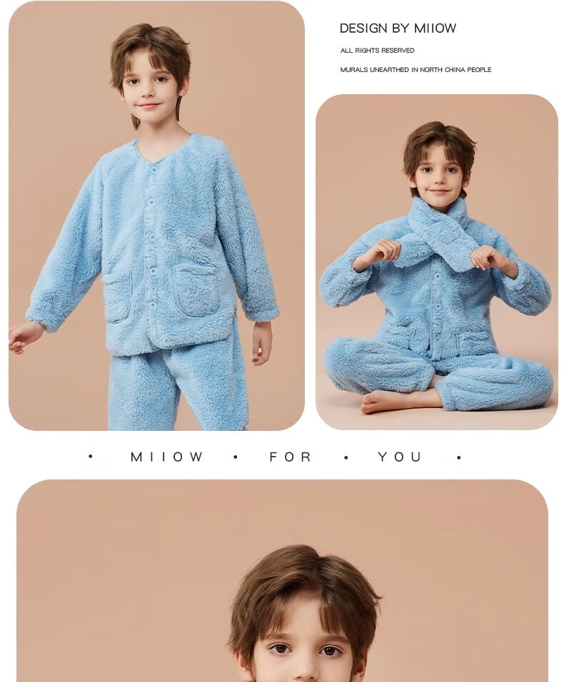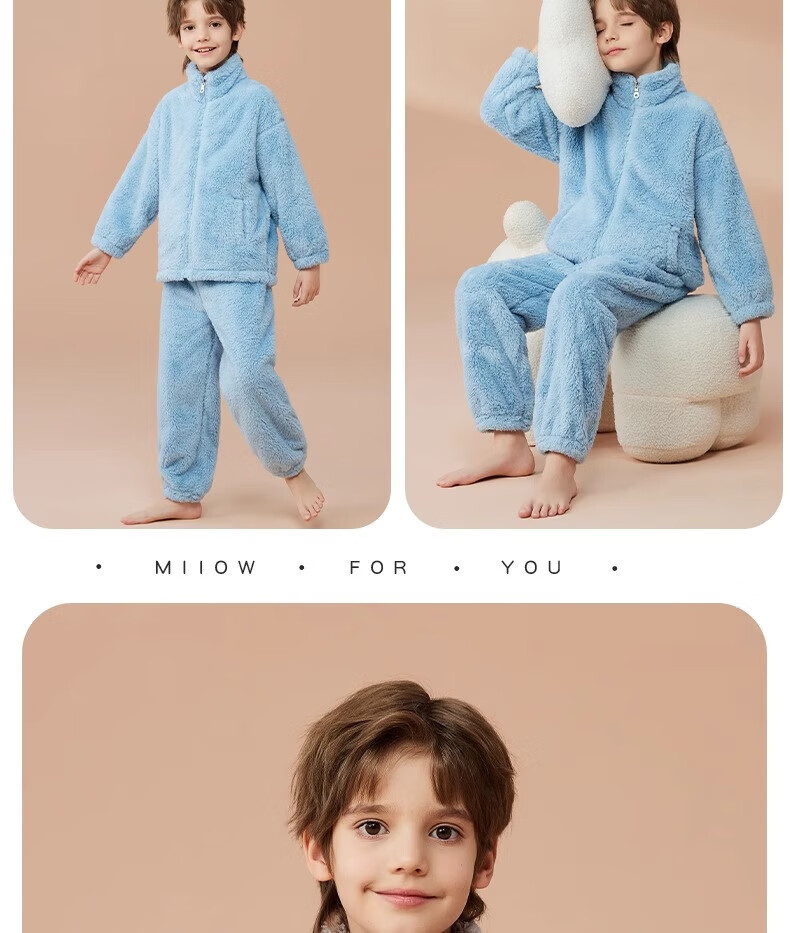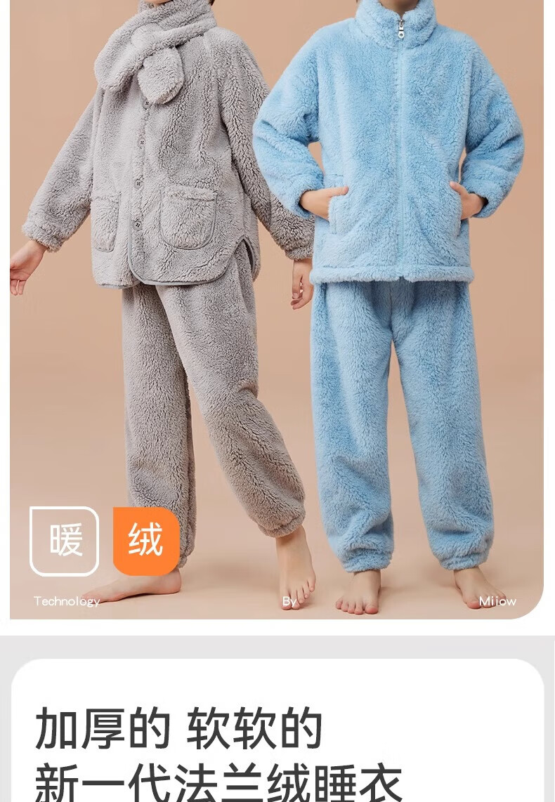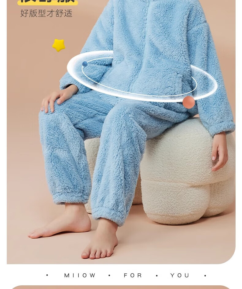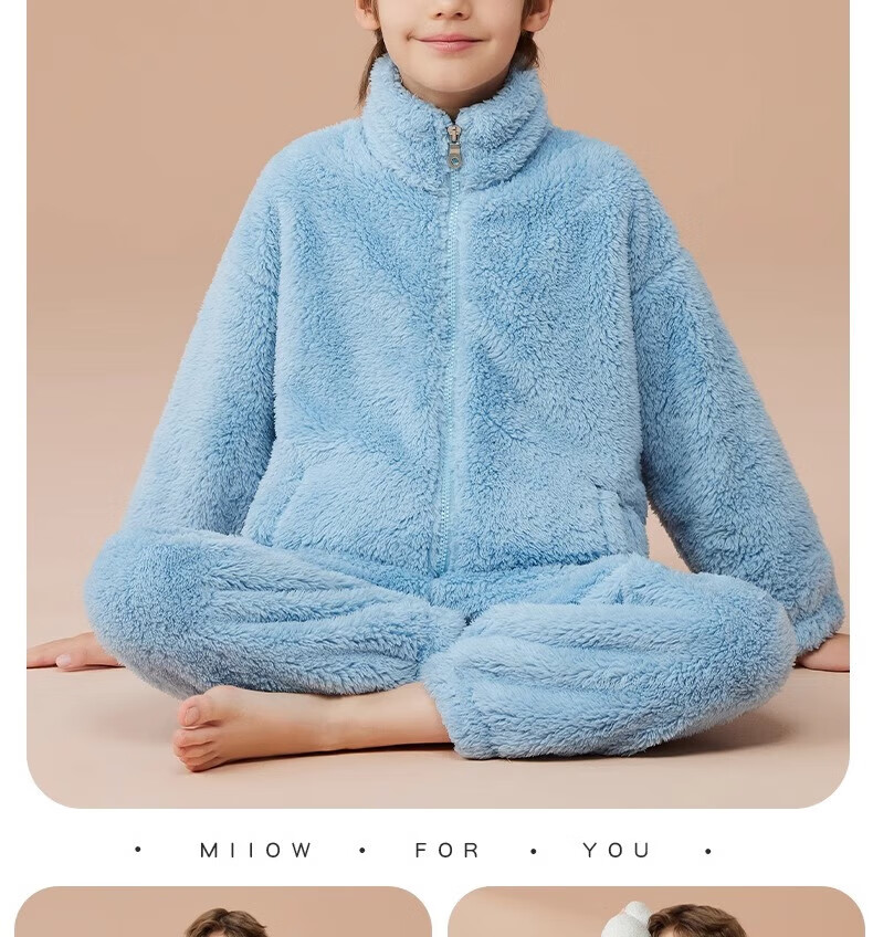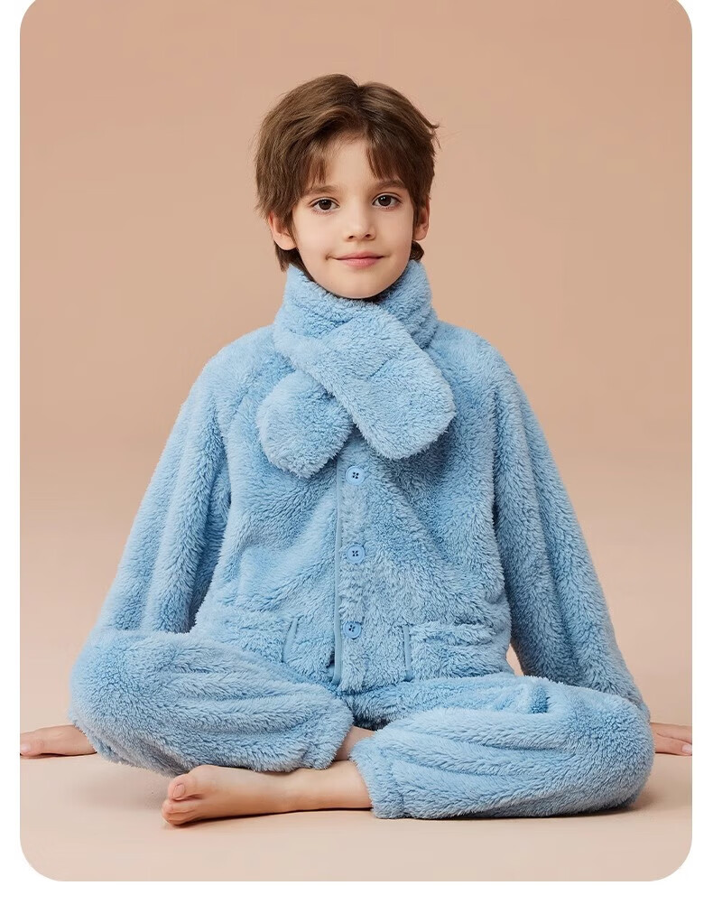 猫人(MiiOW)儿童珊瑚绒睡衣女大童法兰绒青少年家居服秋冬男童保暖睡衣套装 蓝色-可拆卸围脖款 170 建议体重105-120斤