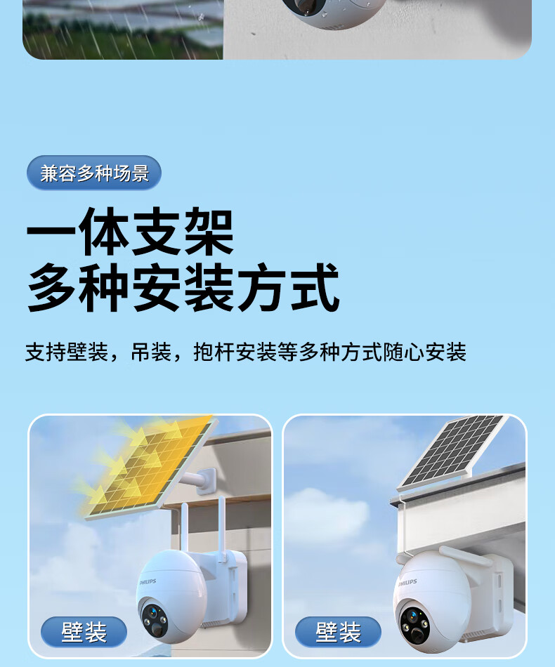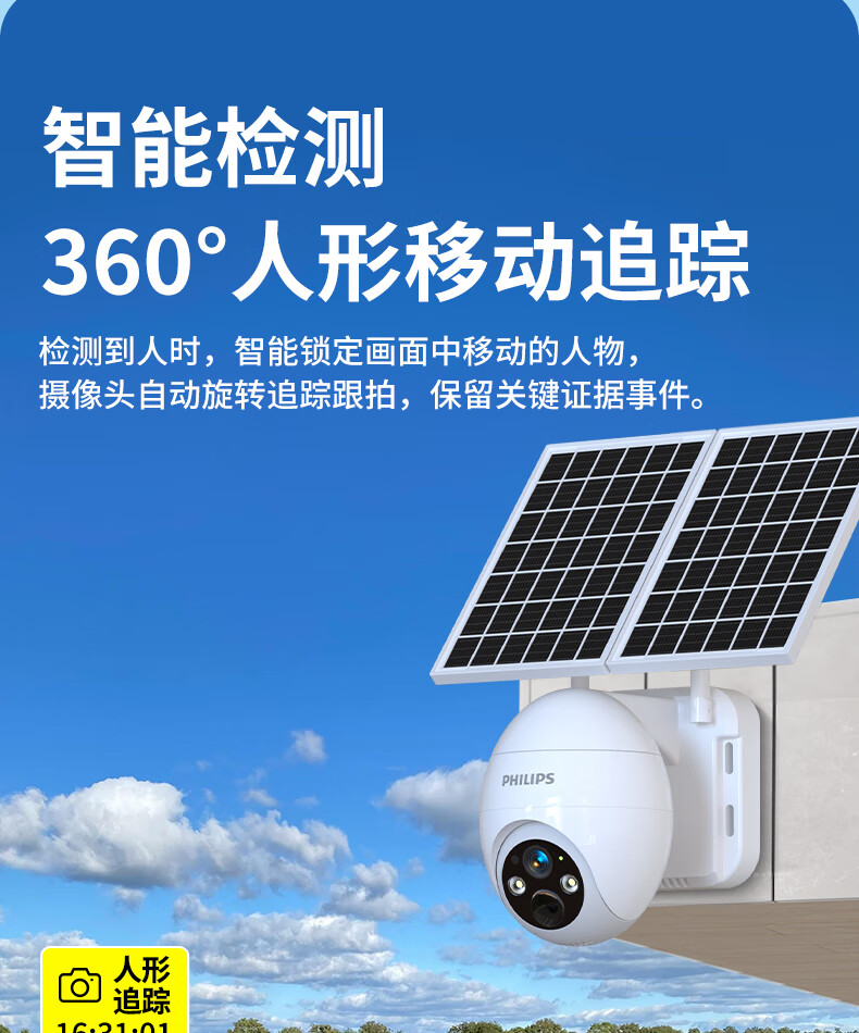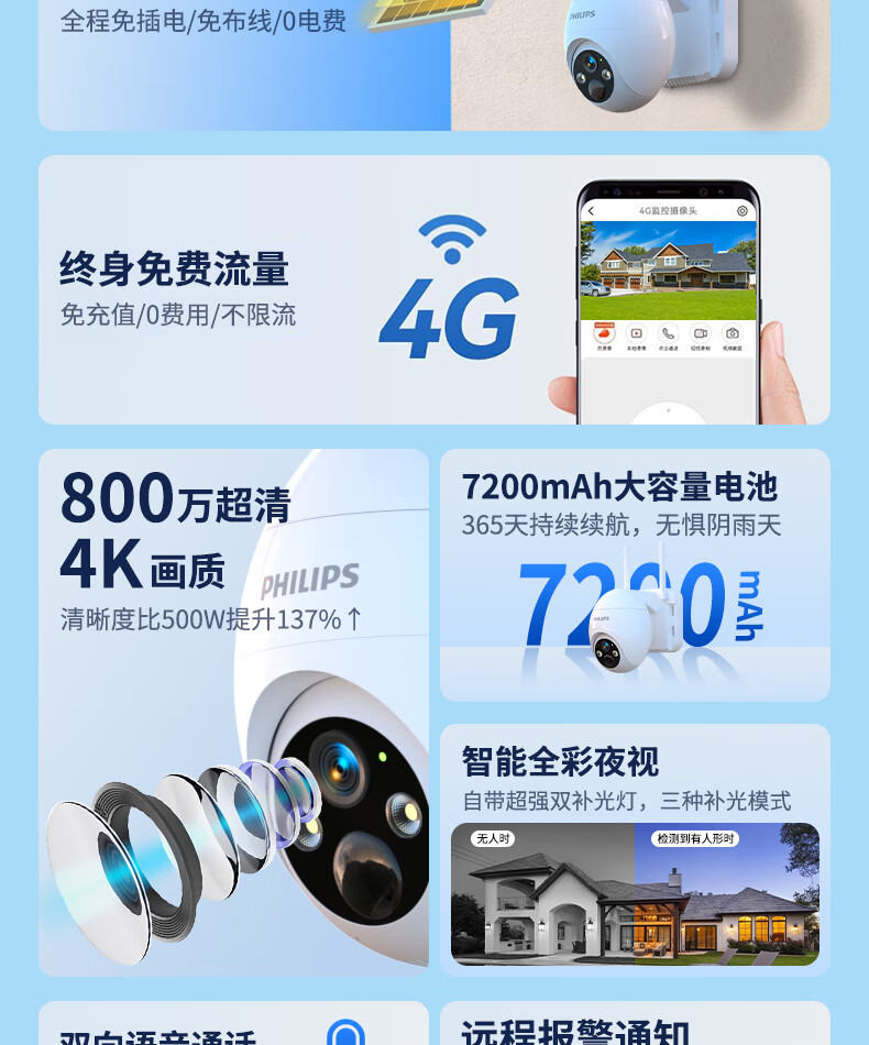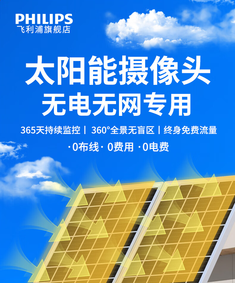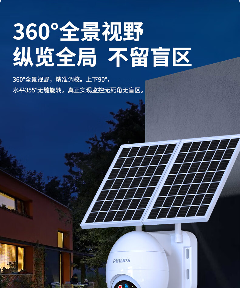 飞利浦太阳能摄像头360度无死角带夜视全景家用终身免流量4g远程无电无网户外防水无线无需连wifi监控 太阳能4G免充值+单板+终身免费流量