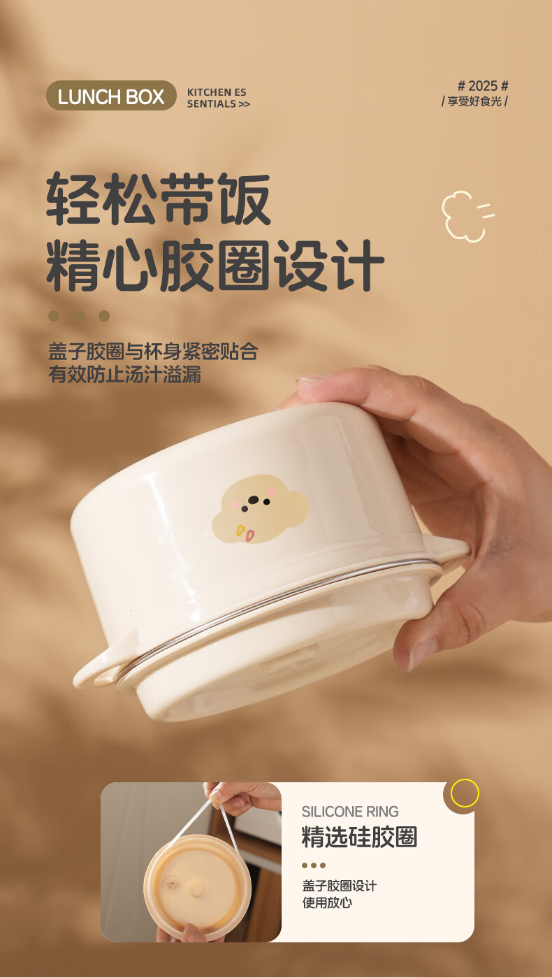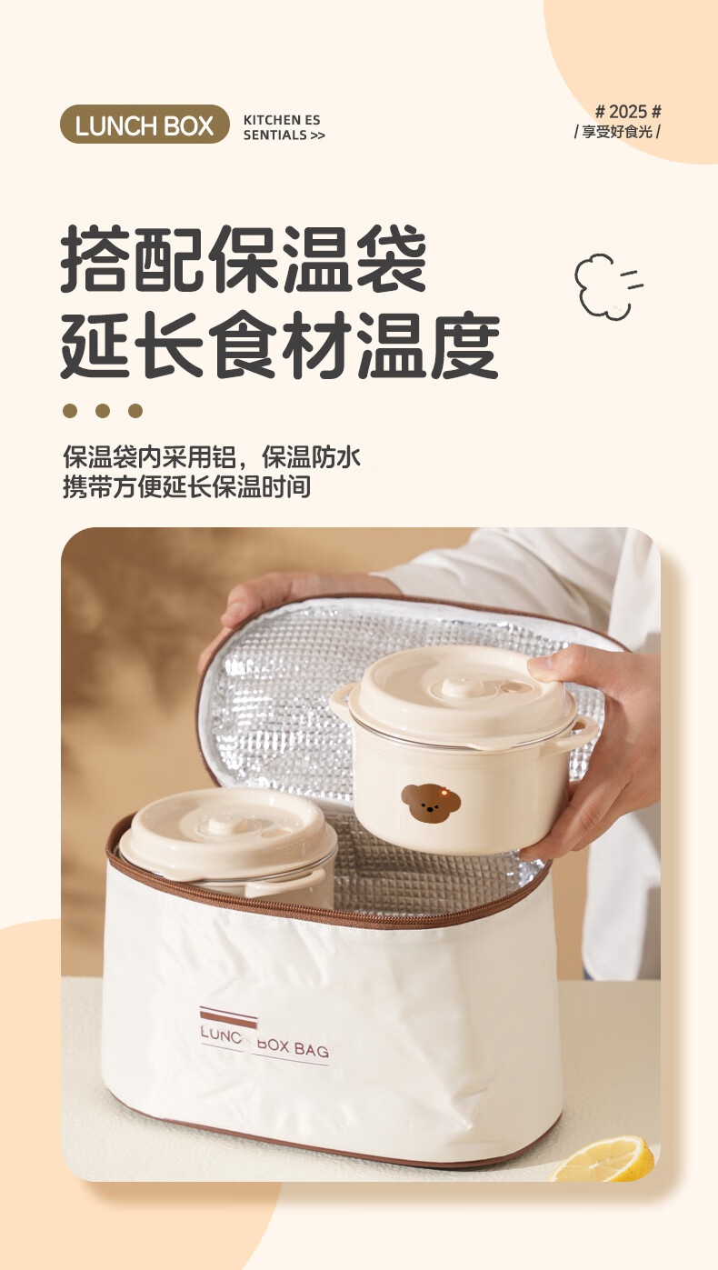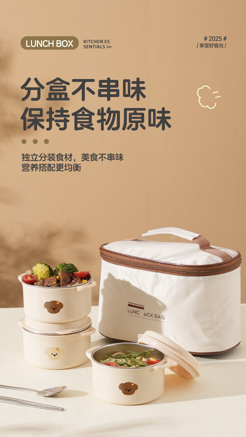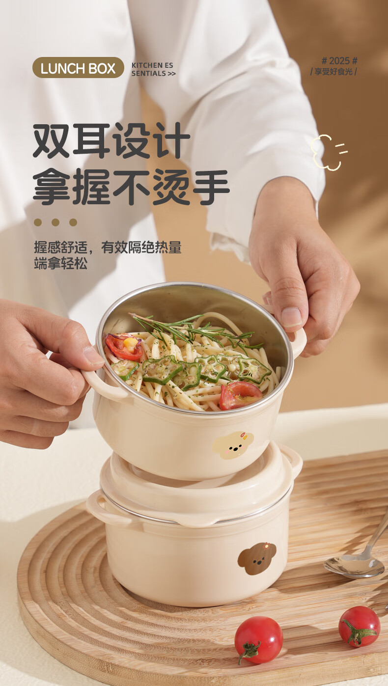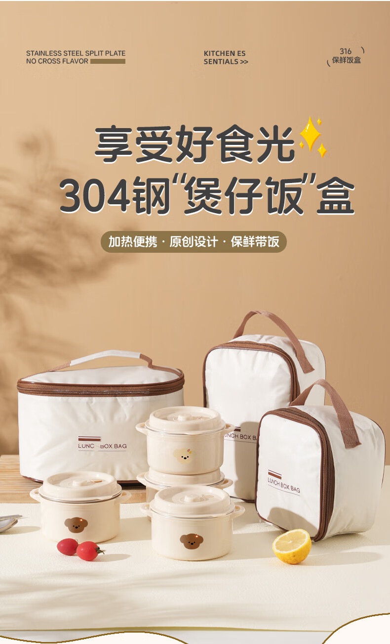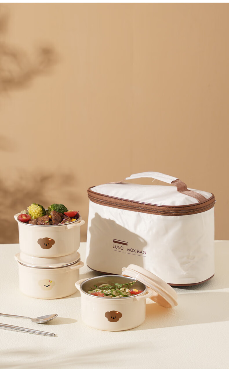 【甄选】不锈钢饭盒双层大容量上班族可微波炉学生带饭便当盒带保 【棕色小狗】1个装 【米色】煲仔饭盒