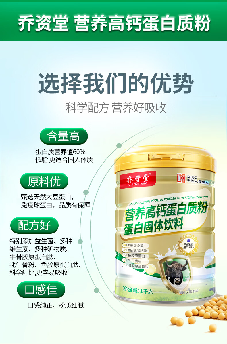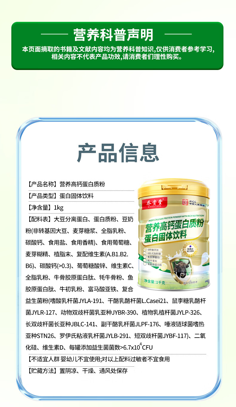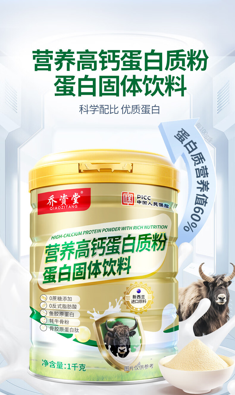 乔资堂1000克营养高钙蛋白质粉0蔗糖补充蛋白质高钙维生素营养品 1000g*2罐 【礼袋装】