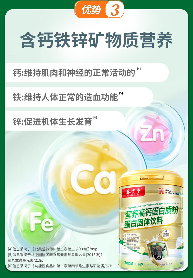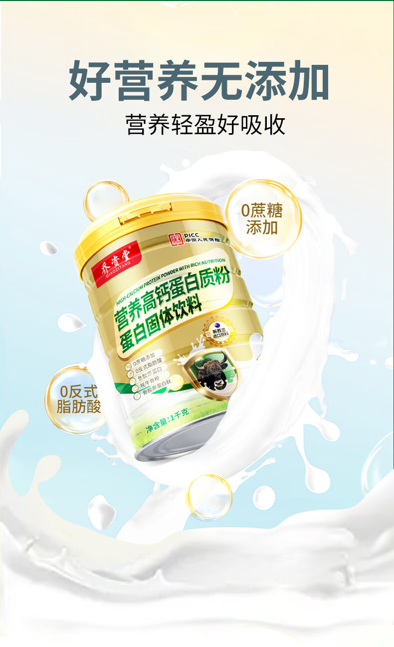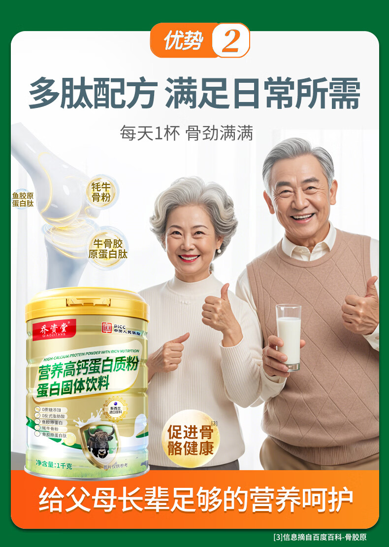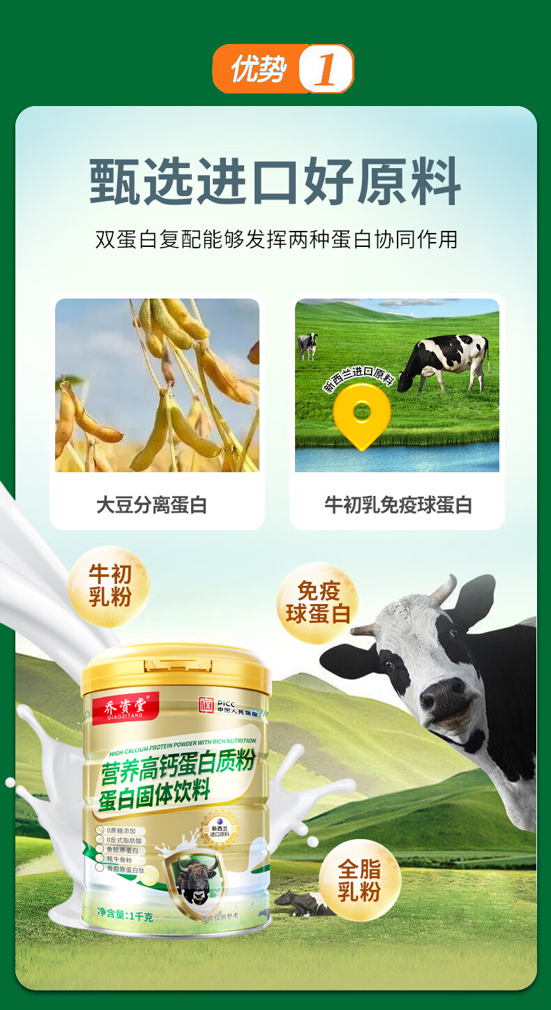 乔资堂1000克营养高钙蛋白质粉0蔗糖补充蛋白质高钙维生素营养品 1000g*2罐 【礼袋装】