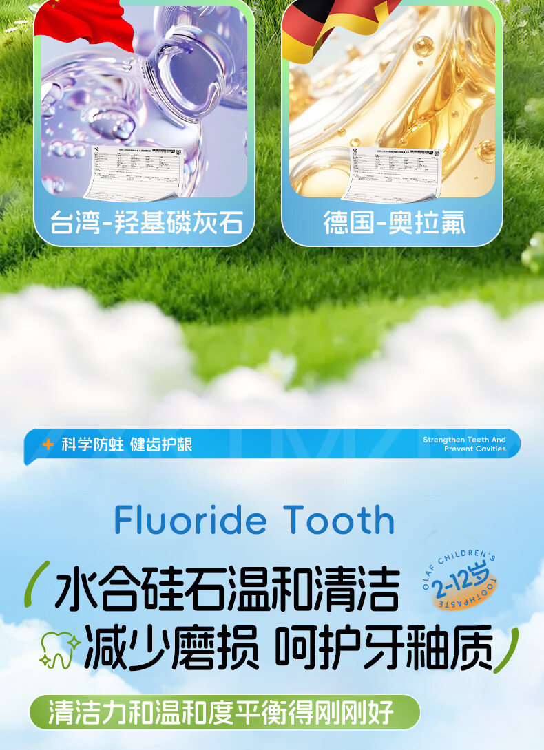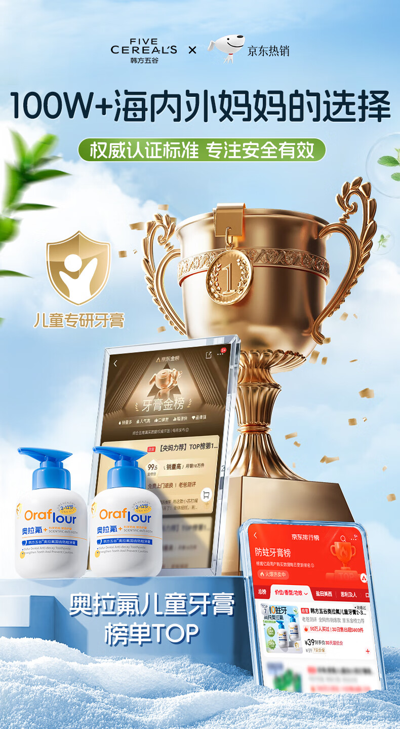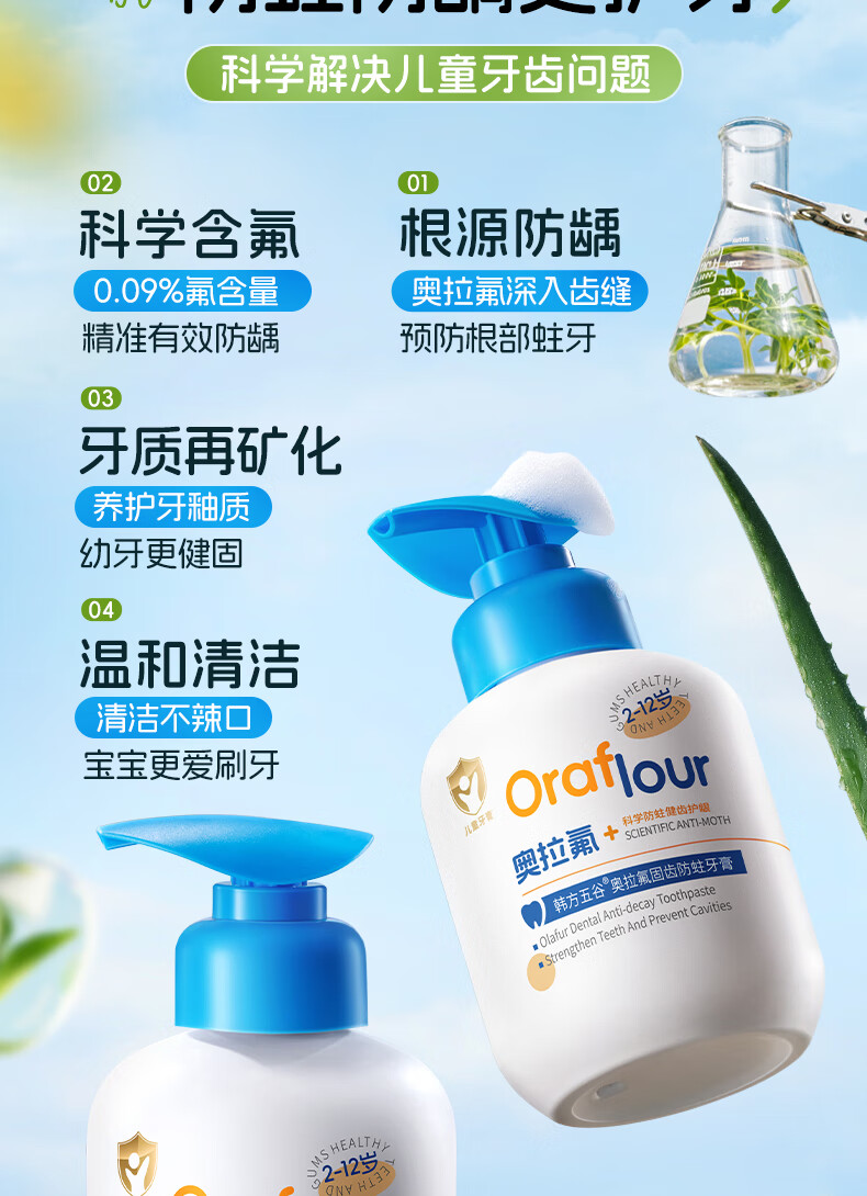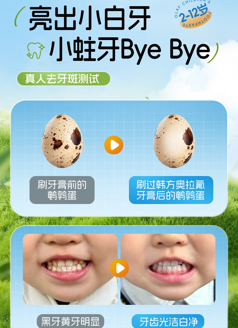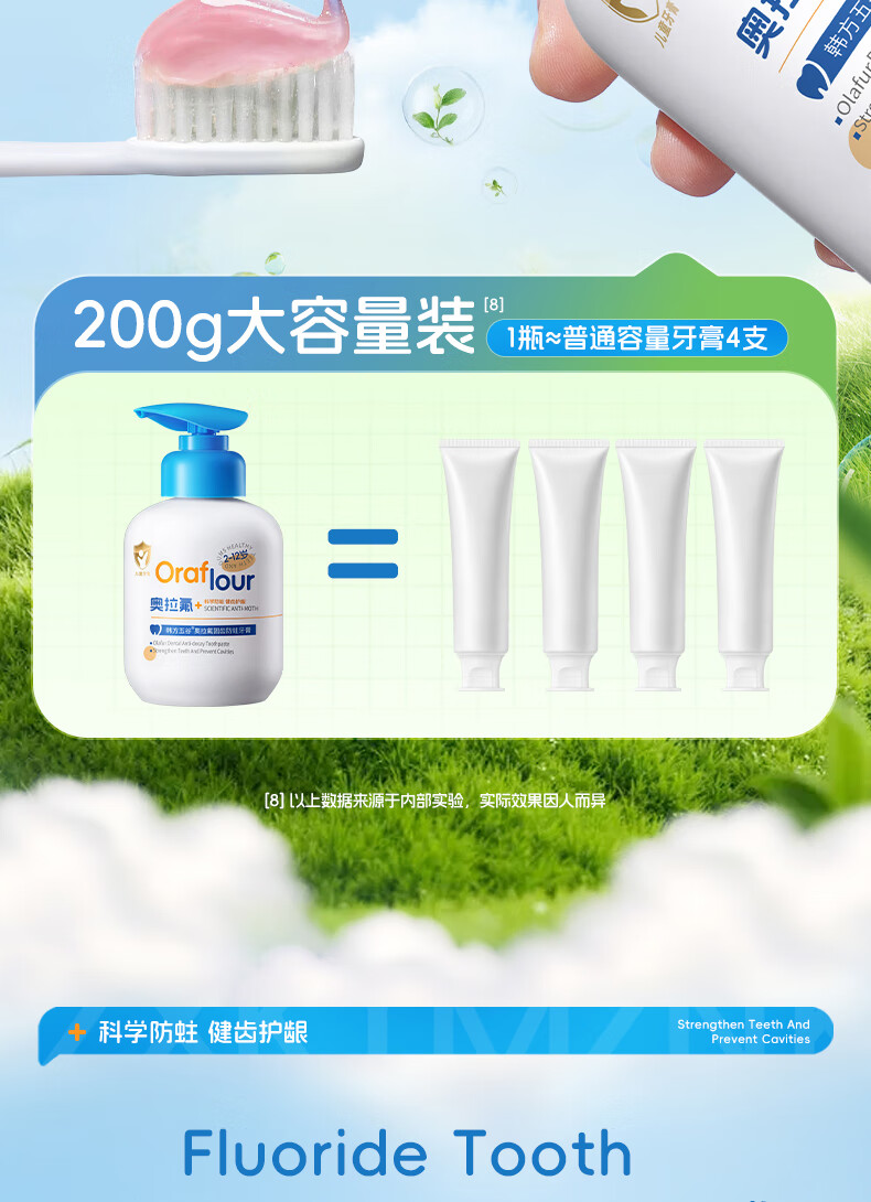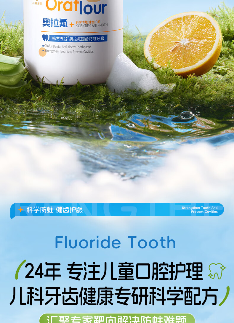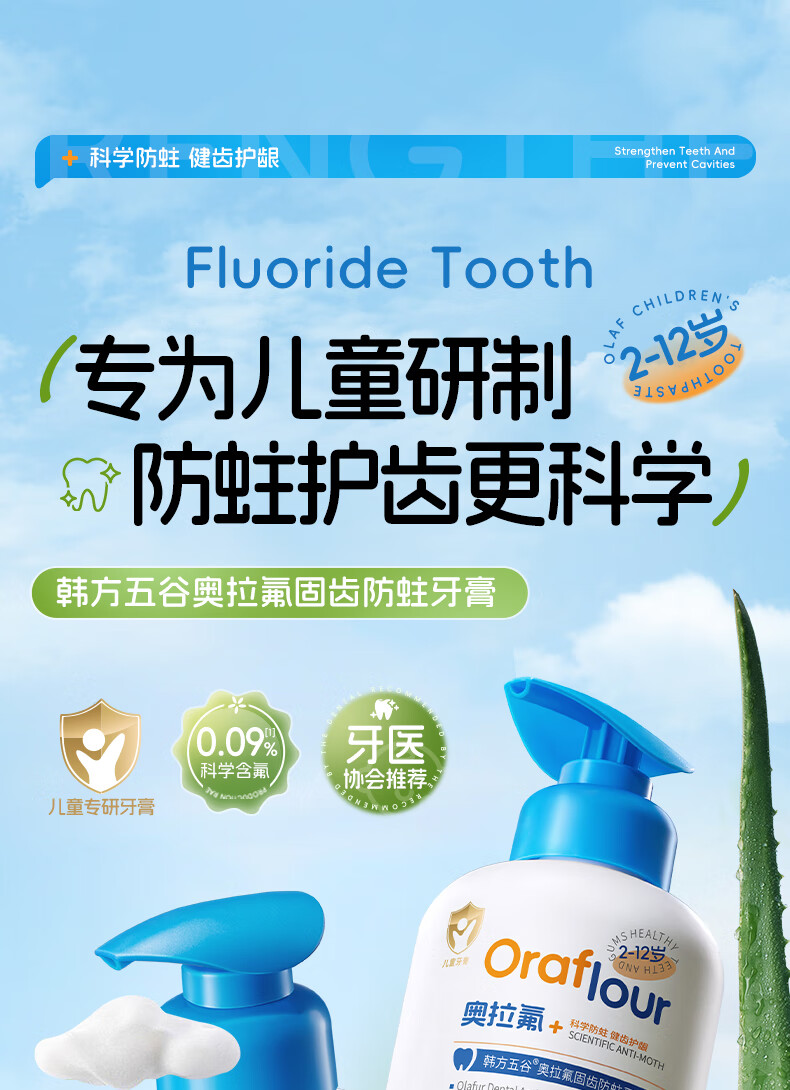 韩方五谷奥拉氟儿童牙膏2-3-6-12岁防蛀含氟去渍清新口气护龈固齿牙膏200g