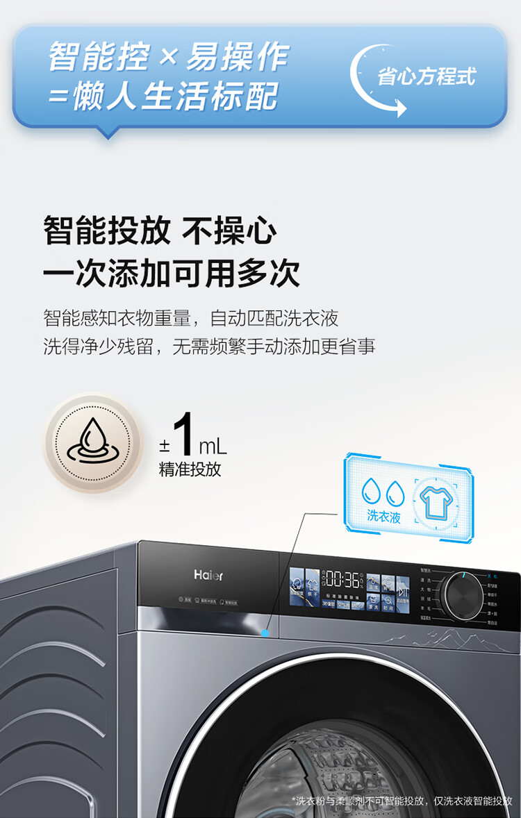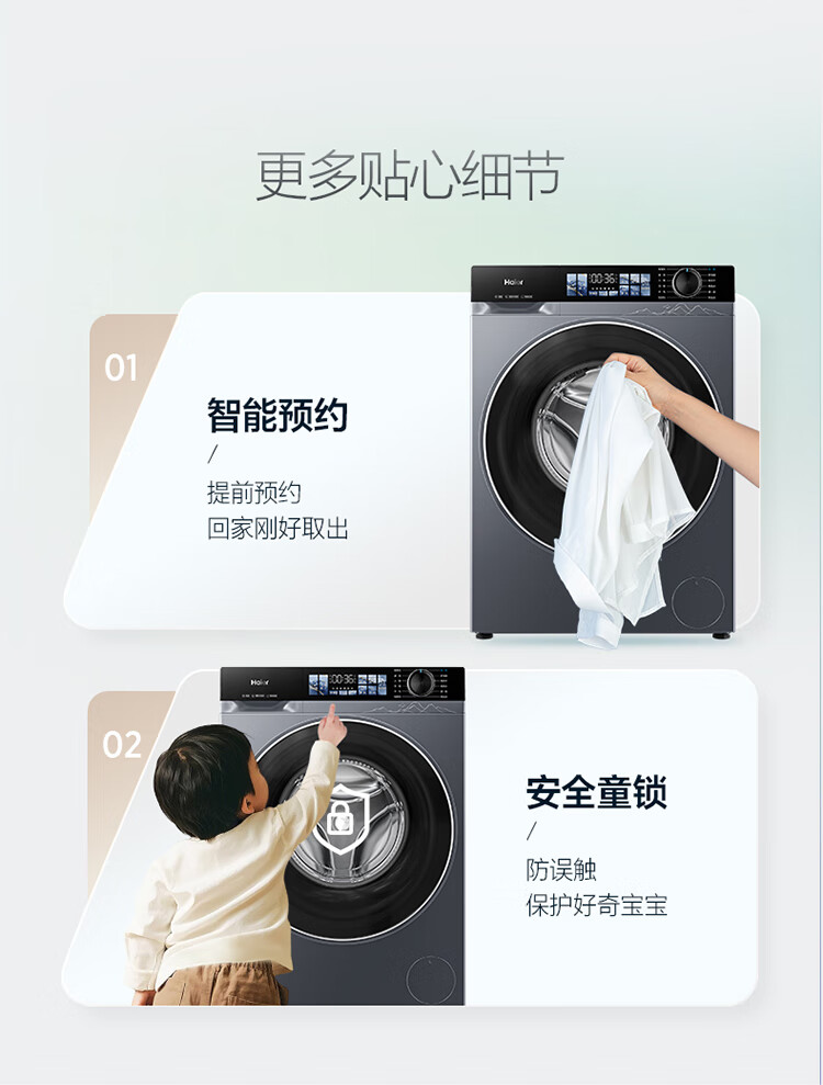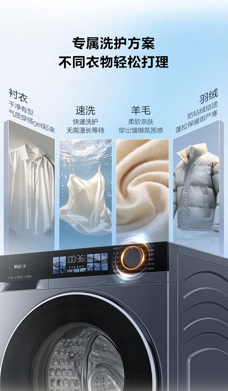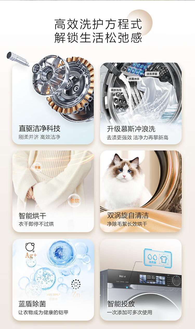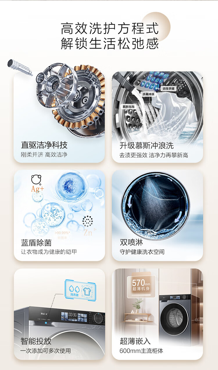 海尔(Haier)10公斤超薄直驱变频滚筒洗衣机全自动智能投放六维减震蓝盾除菌螨清新防皱家用筒自洁双喷淋预约 触控屏+慕斯冲浪洗+智慧洗+羊毛羽绒洗 洗烘一体
