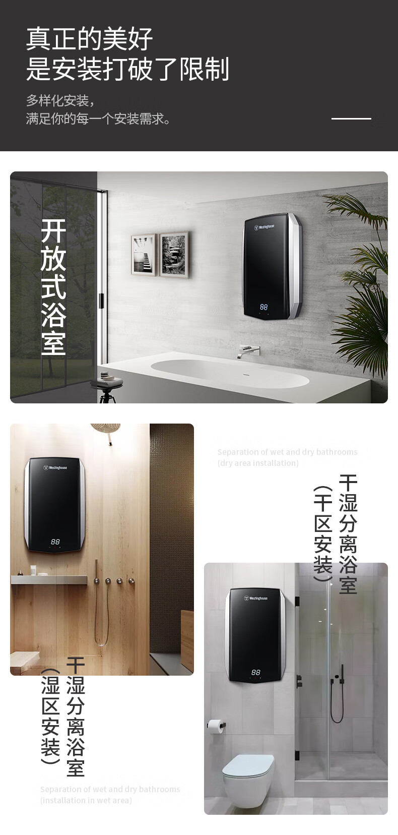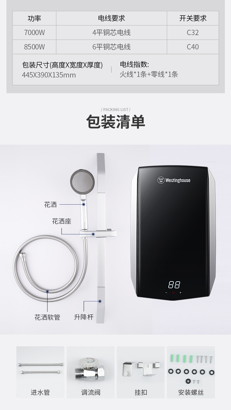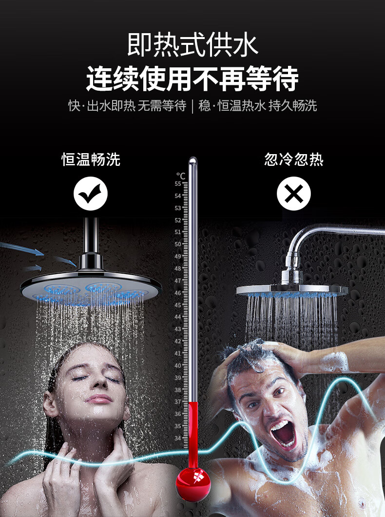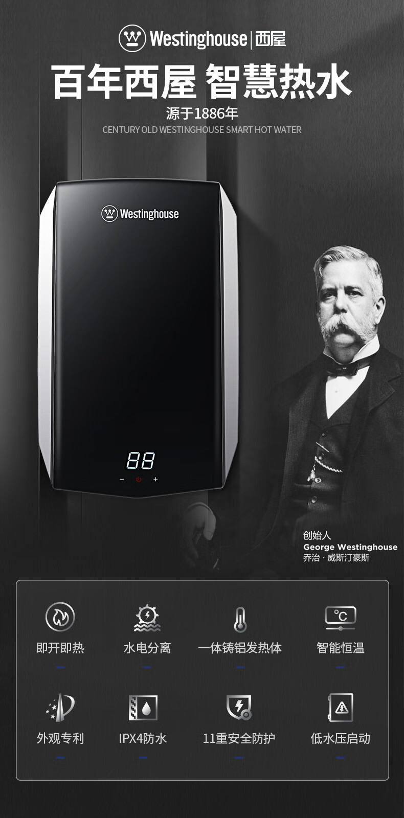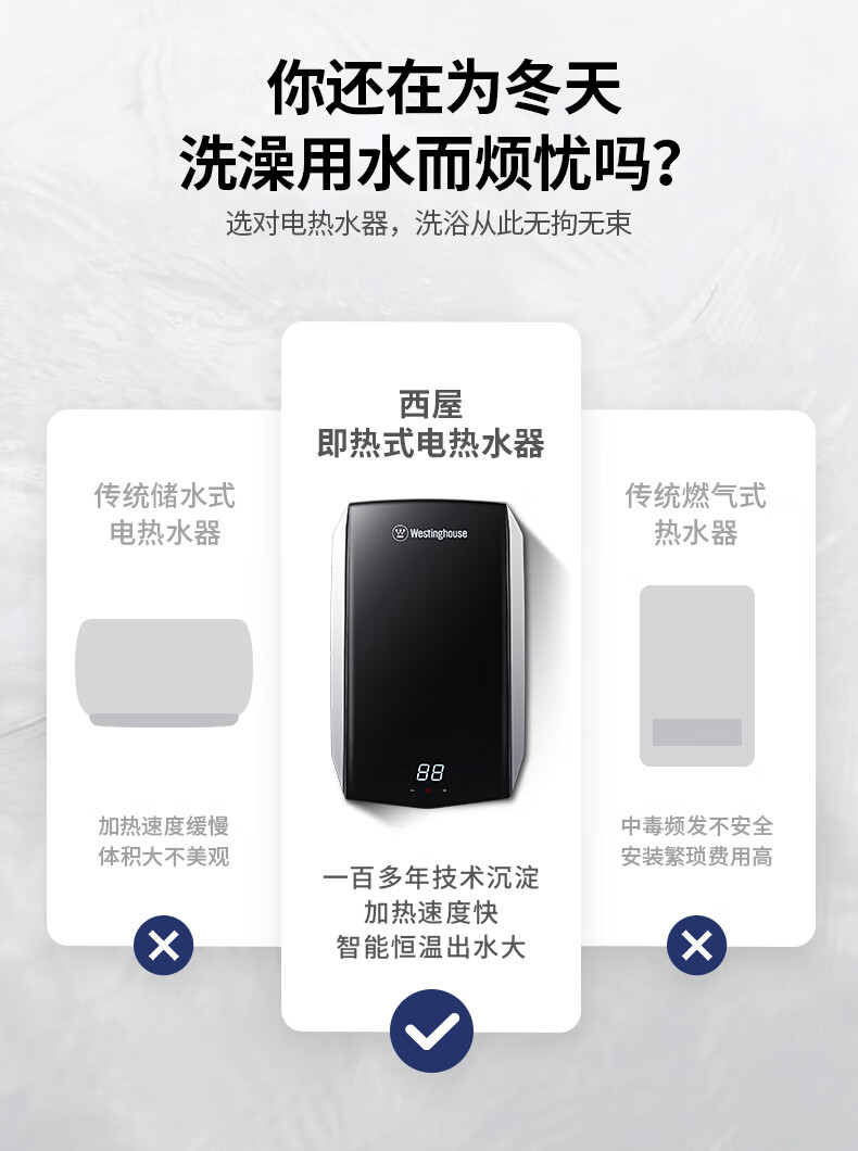 西屋(Westinghouse)即热式电热水器 智能恒温过水热速热扁桶免储水无内胆 淋浴洗澡黑 7000W 【免储水】典雅黑