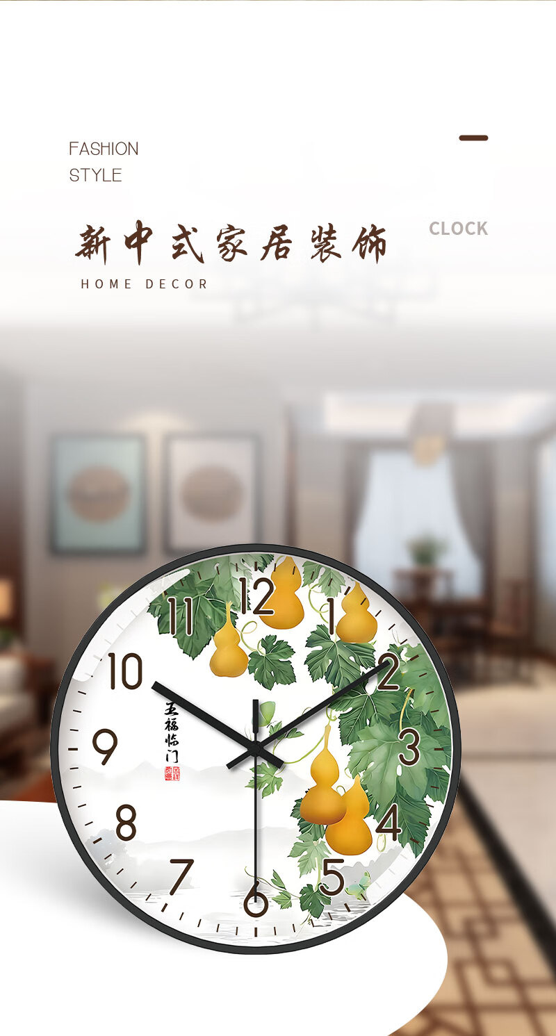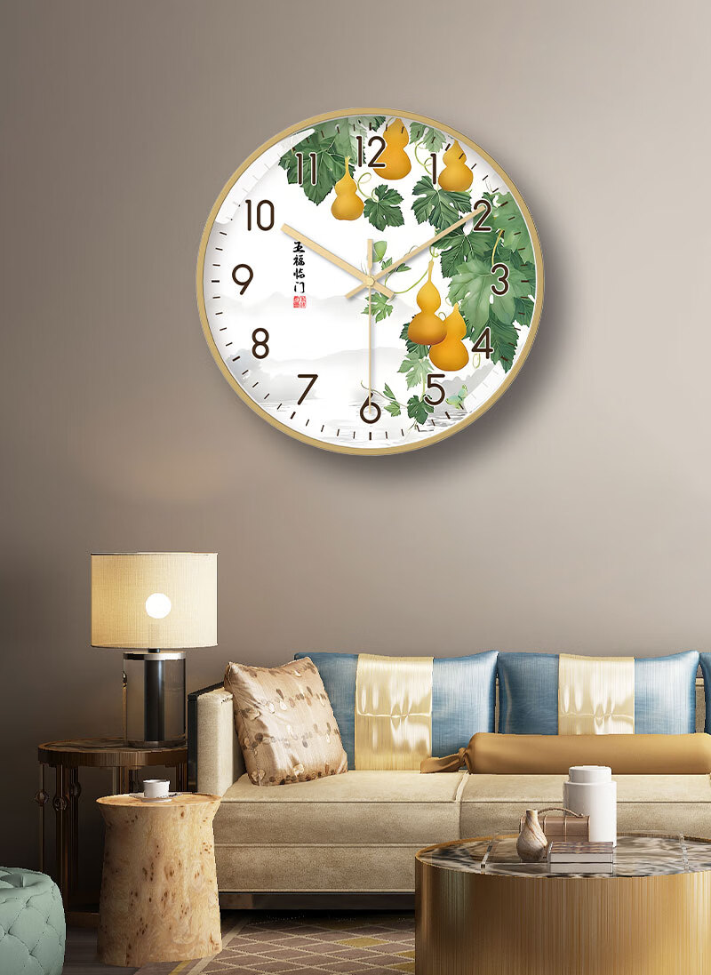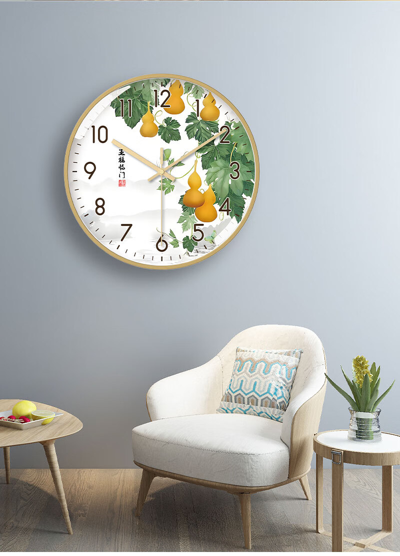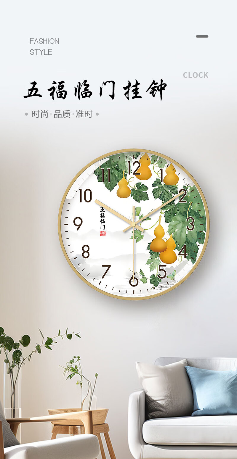 Tazxin现代轻奢五福临门家用挂钟客厅新中式高档石英钟表挂墙静音时钟 TWFLM-金框金针 25cm 10寸