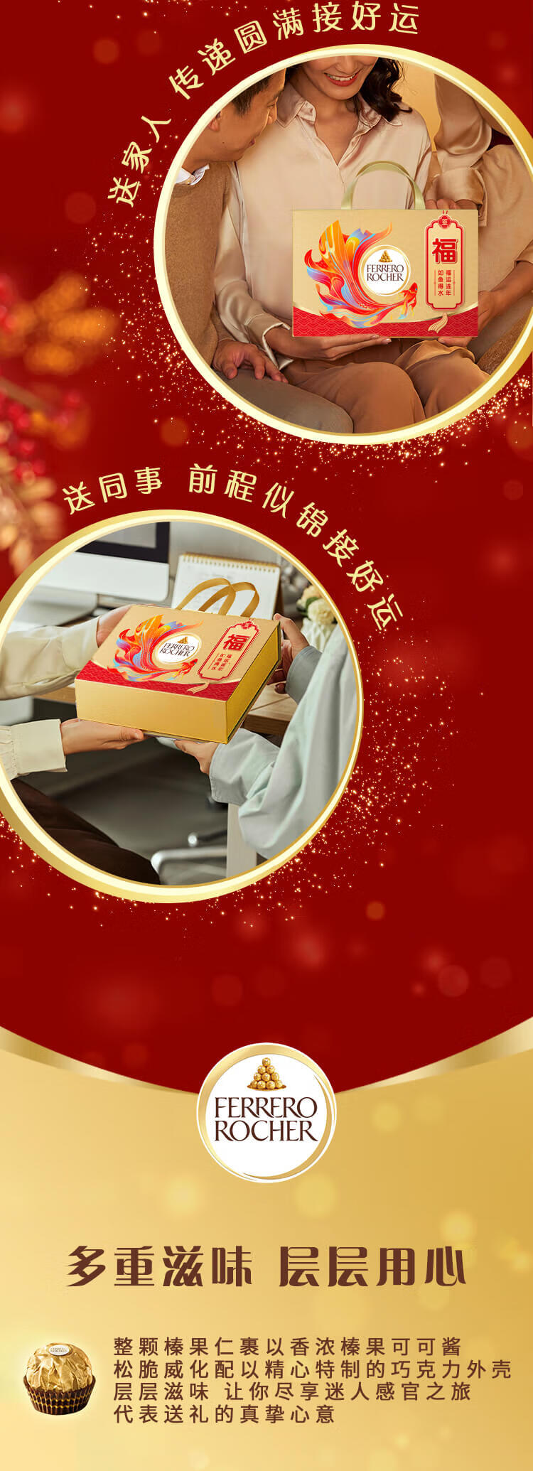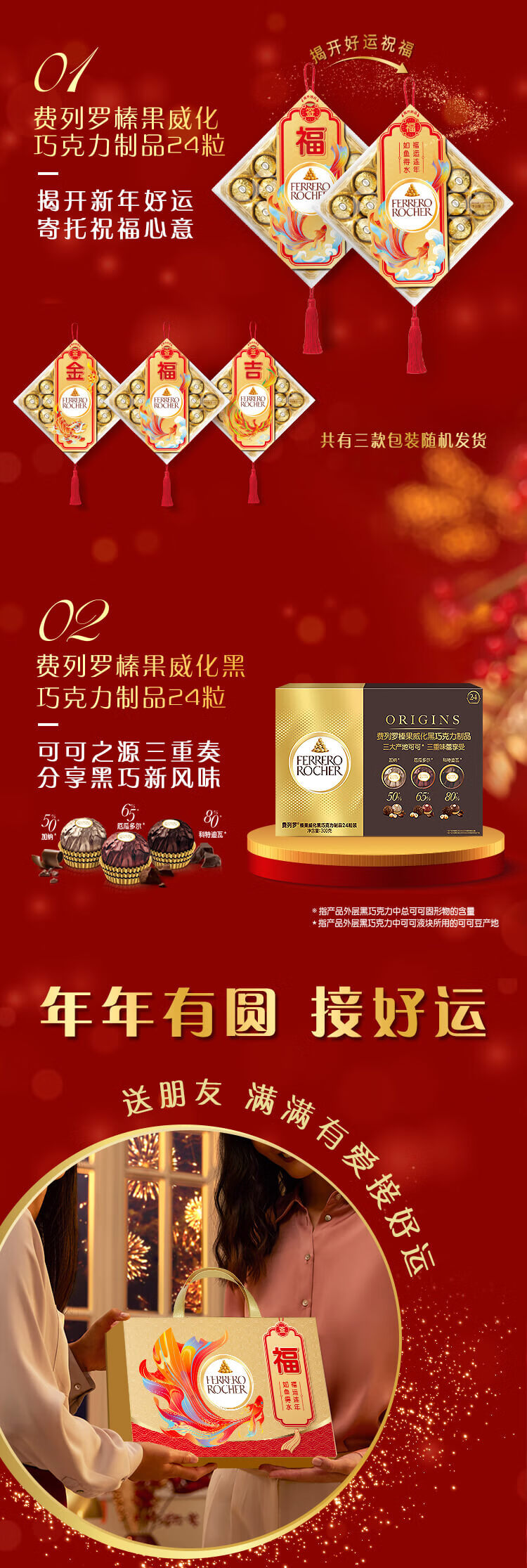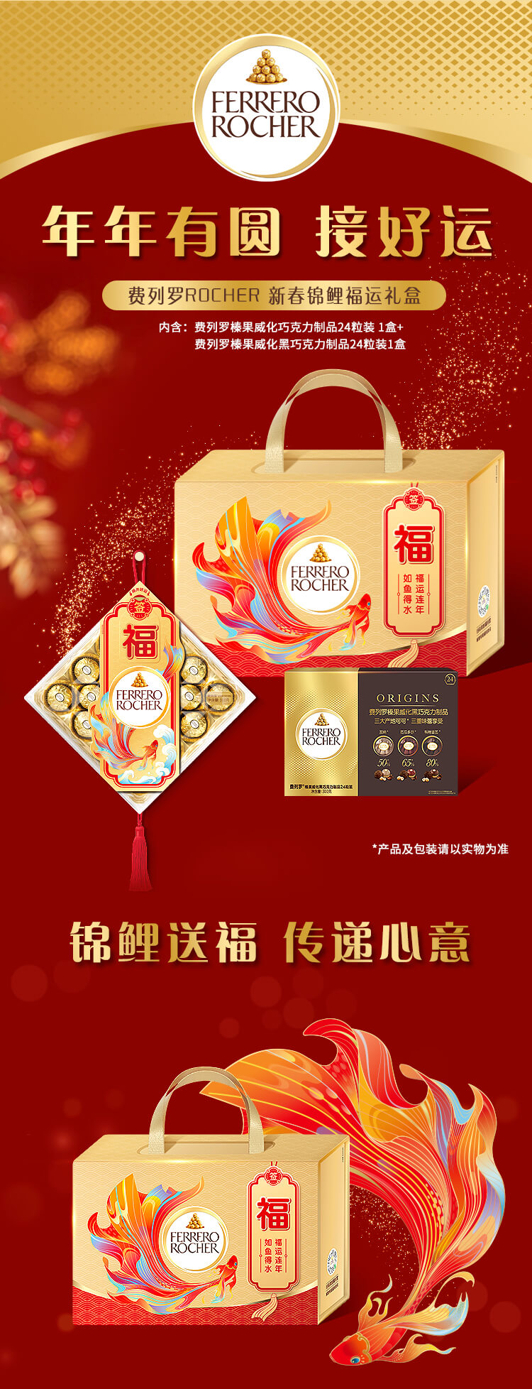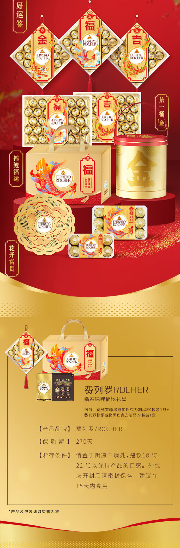 费列罗 锦鲤福运礼盒 黑巧24粒+金球巧克力24粒600g 糖果年货礼盒