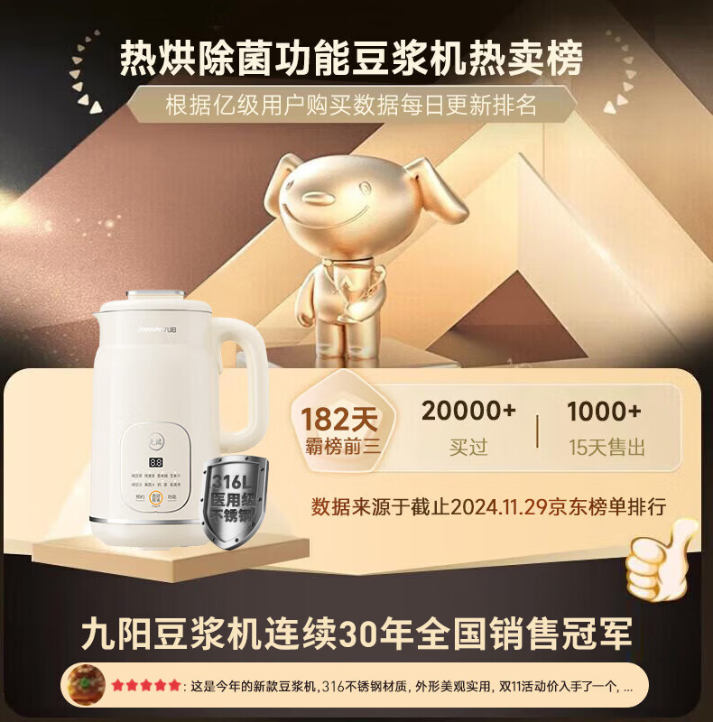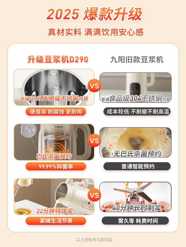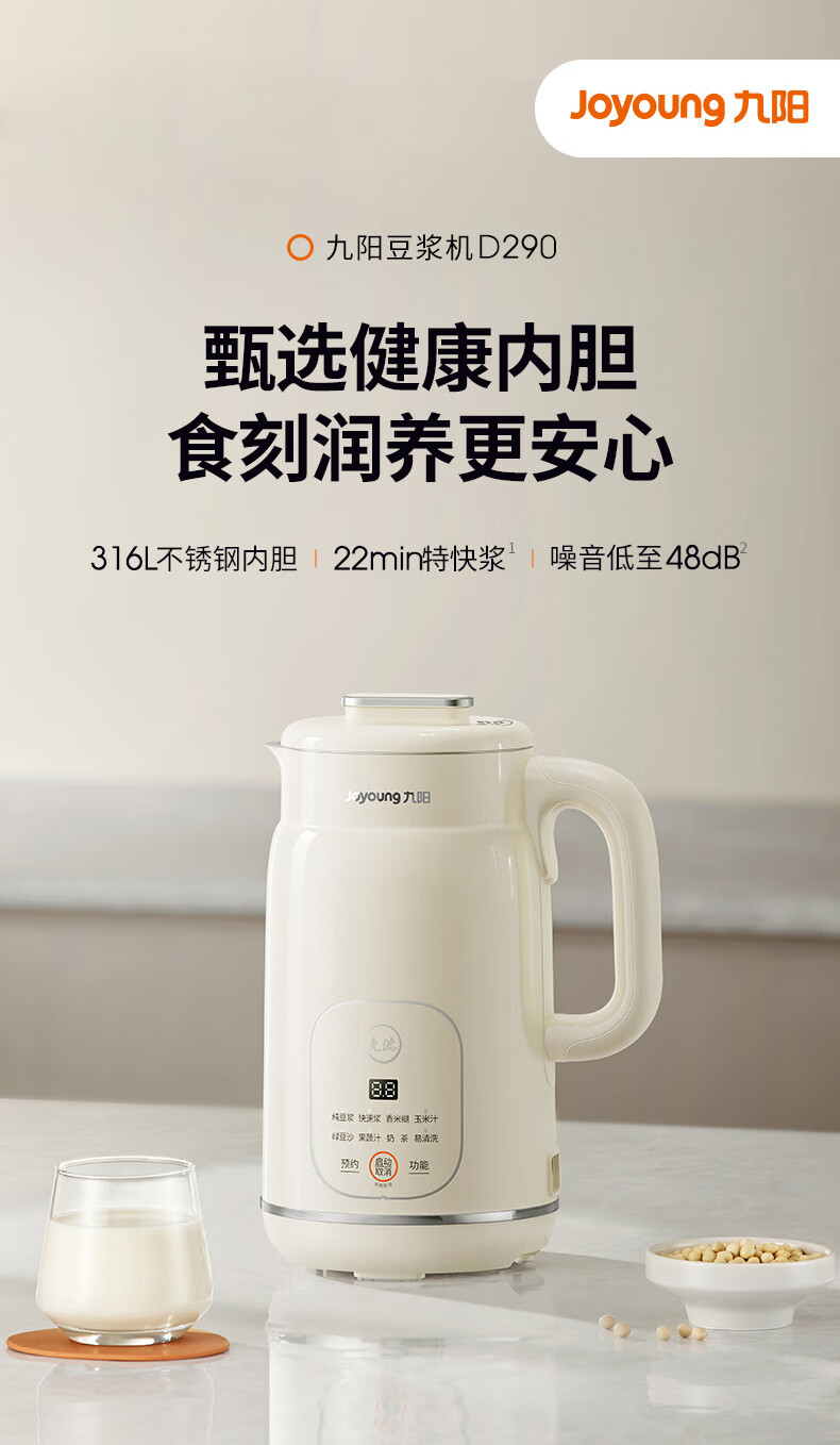 九阳(Joyoung)豆浆机316L家用1L破壁机免滤 巴氏杀菌预约 多功能防溢易清洗升级不锈钢 全自动免煮2026新款 D290 国家补贴【专业快速浆轻音】- 1L
