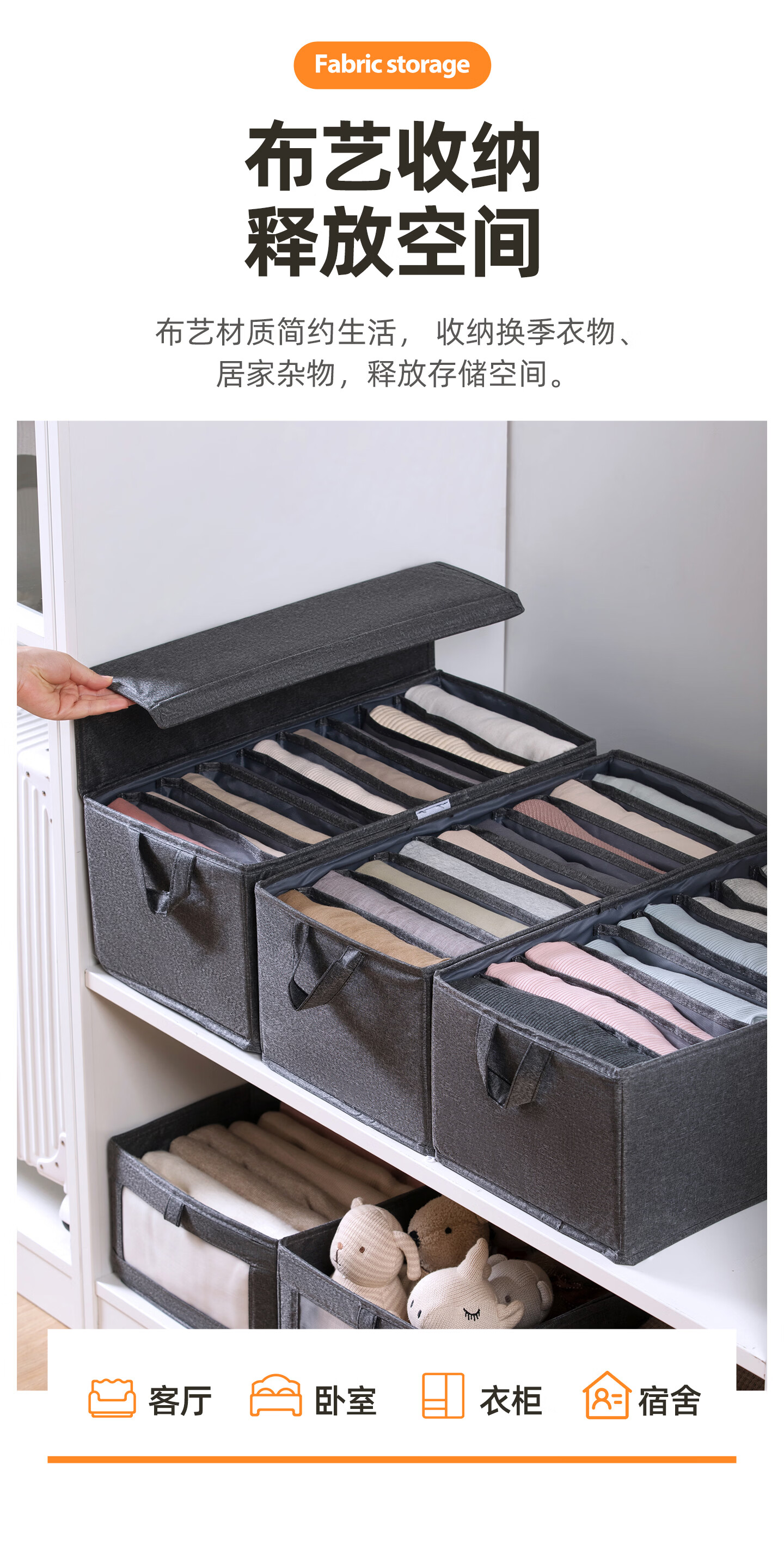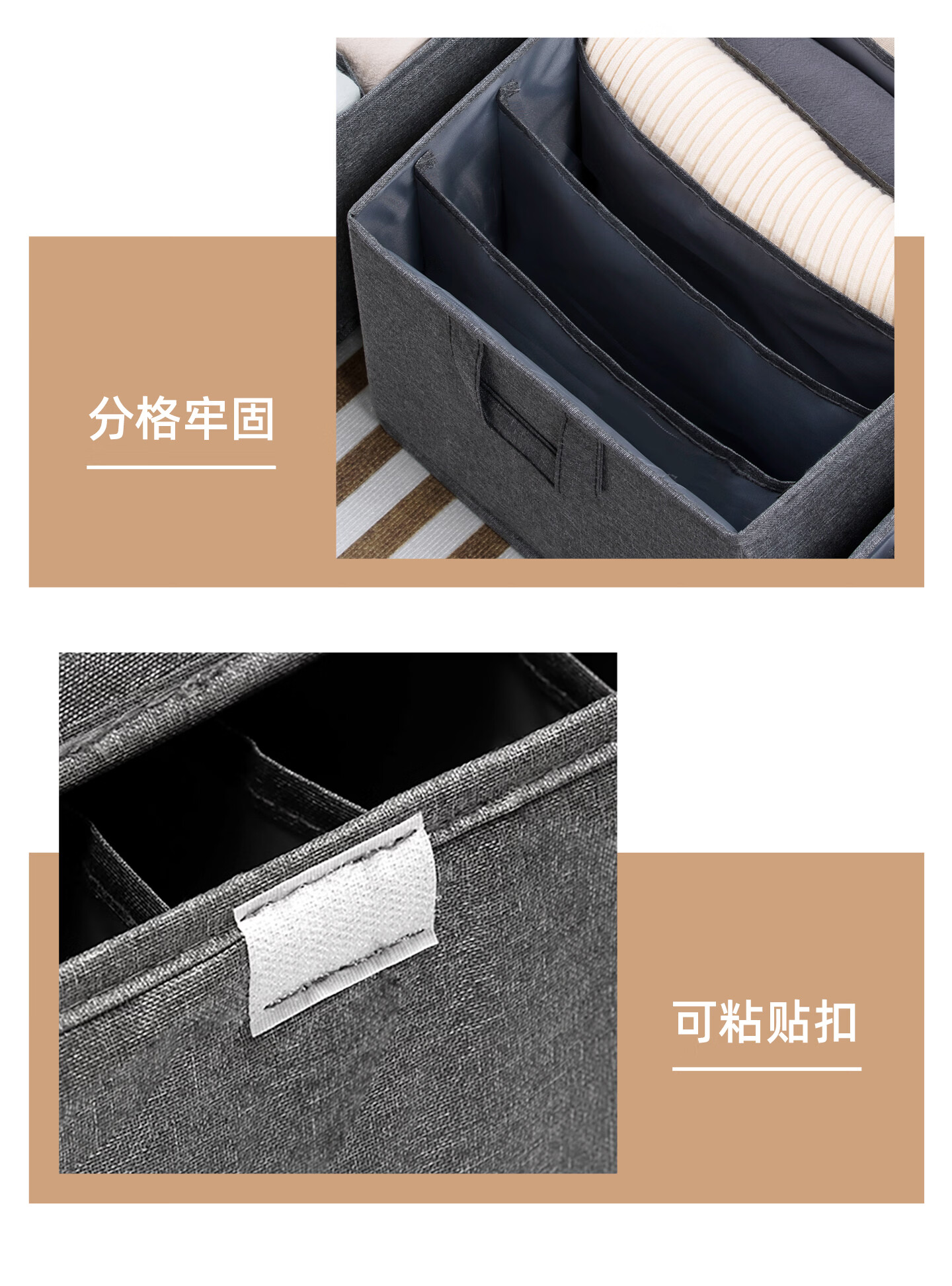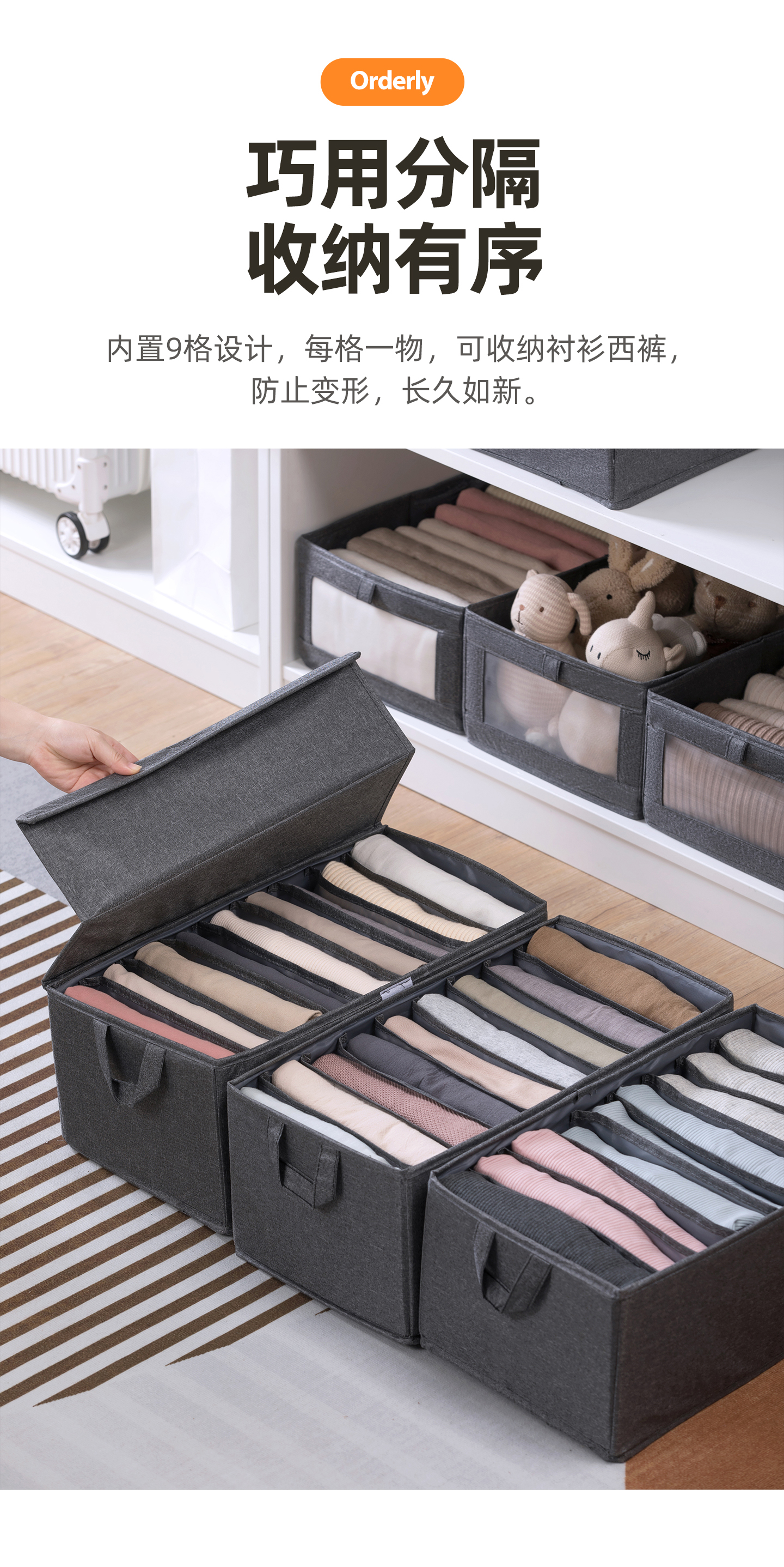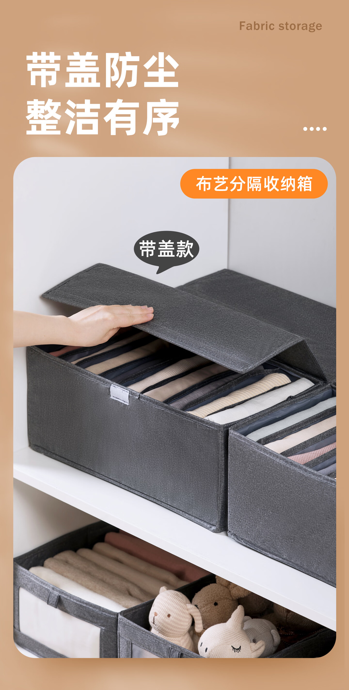茶花收纳箱布艺百纳箱衣物收纳盒衣柜整理箱家用被子棉麻收纳袋 灰色1个【9分隔】带盖布艺收纳筐