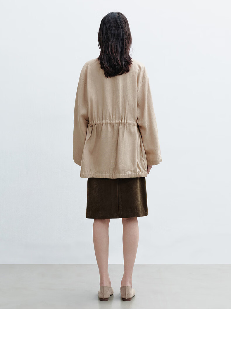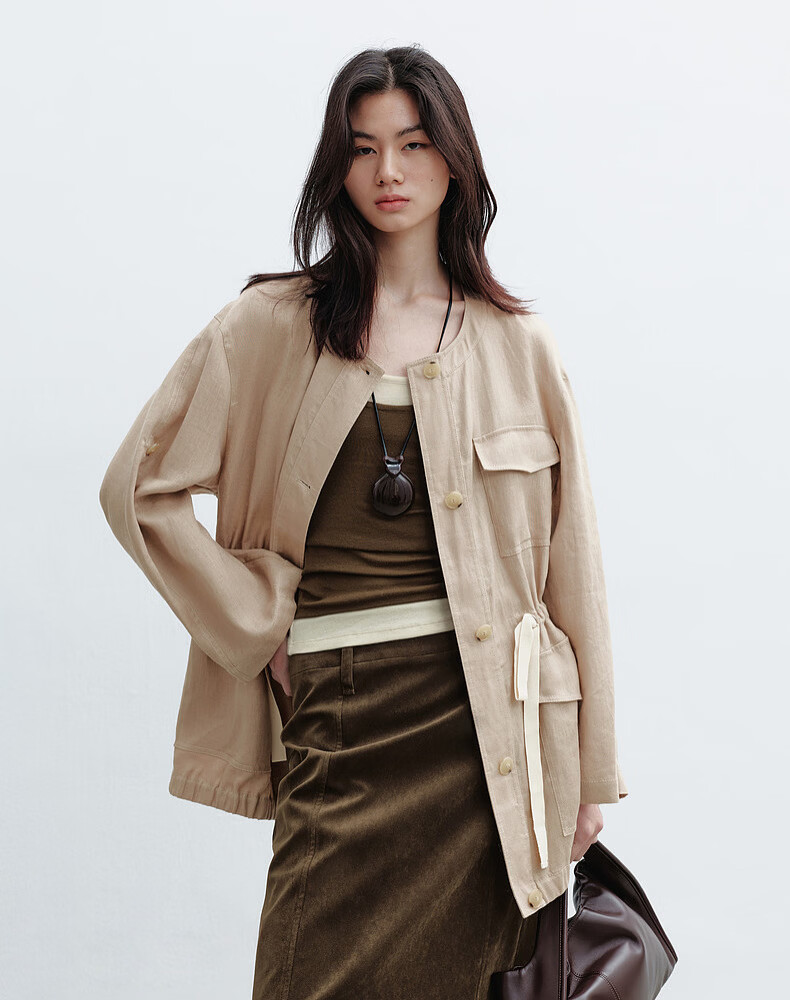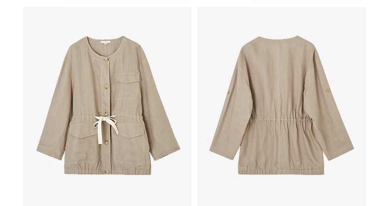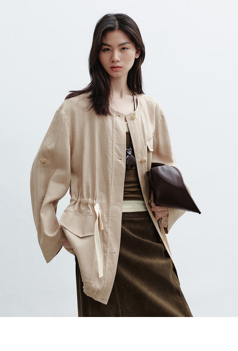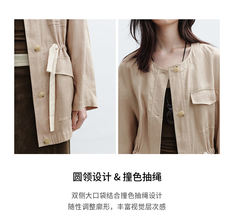 H's亚麻抽绳短外套女26年春季新款设计感圆领廓形抽绳休闲夹克上衣 沙丘色 S