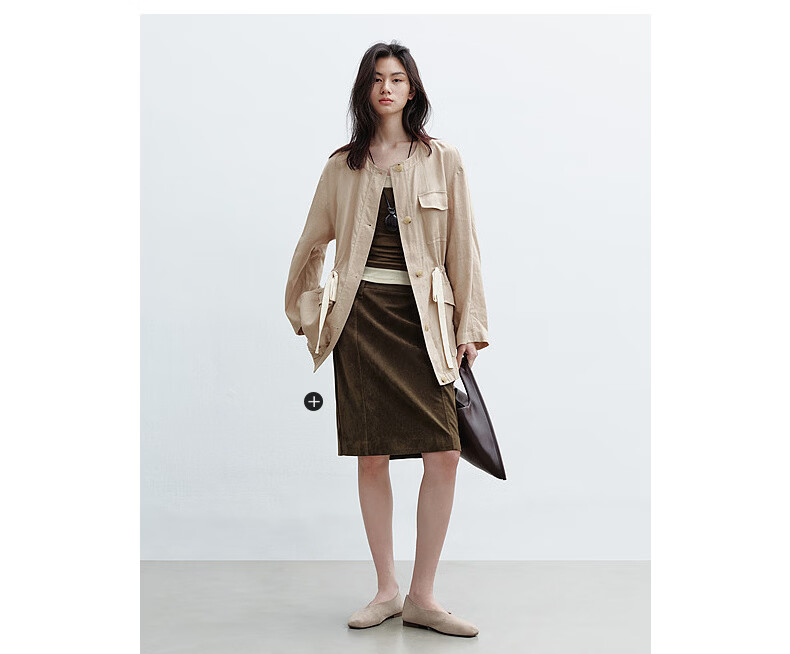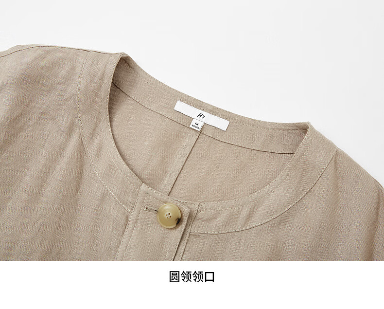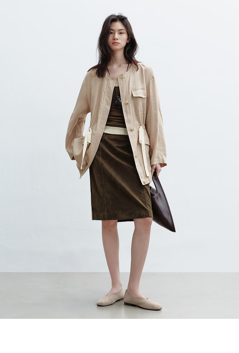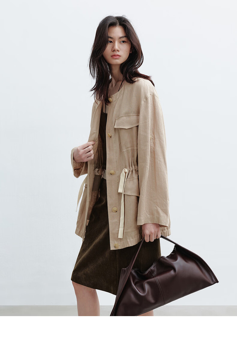 H's亚麻抽绳短外套女26年春季新款设计感圆领廓形抽绳休闲夹克上衣 沙丘色 S