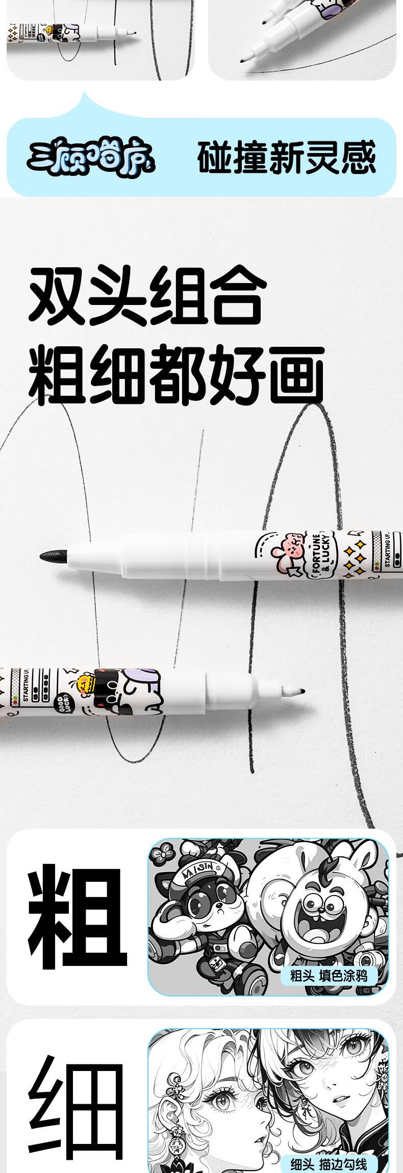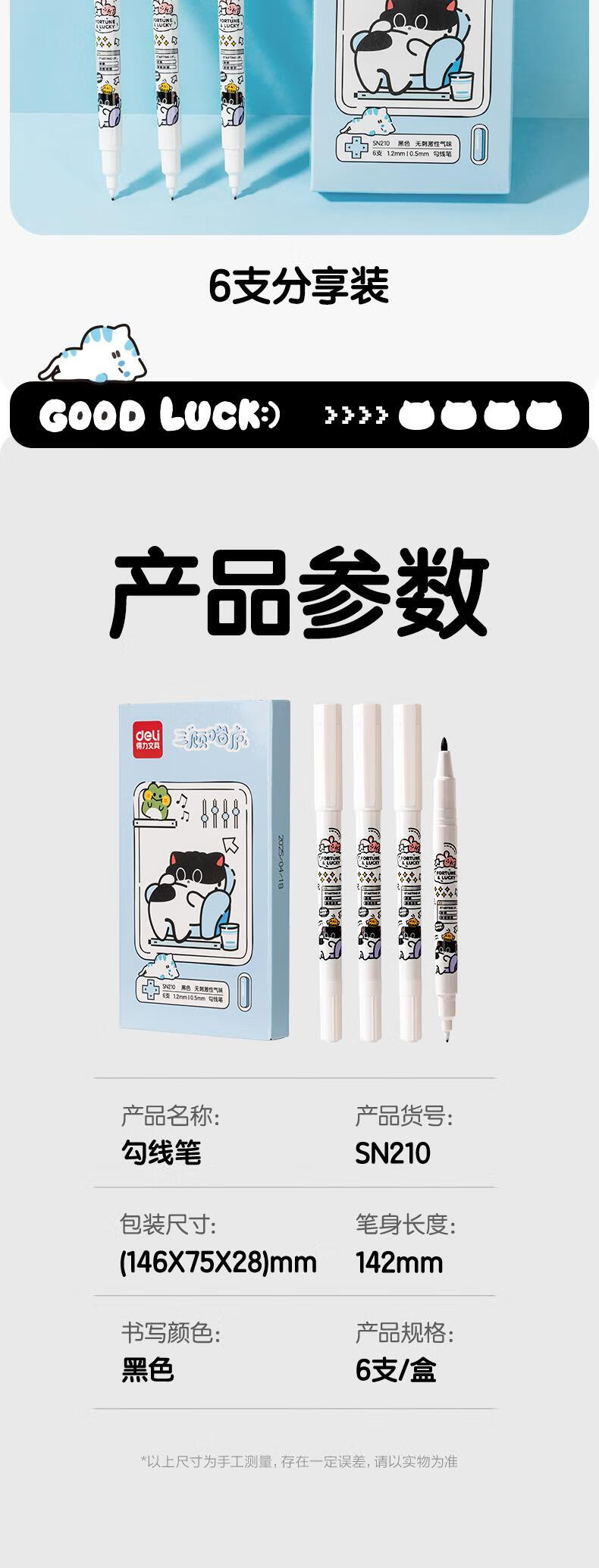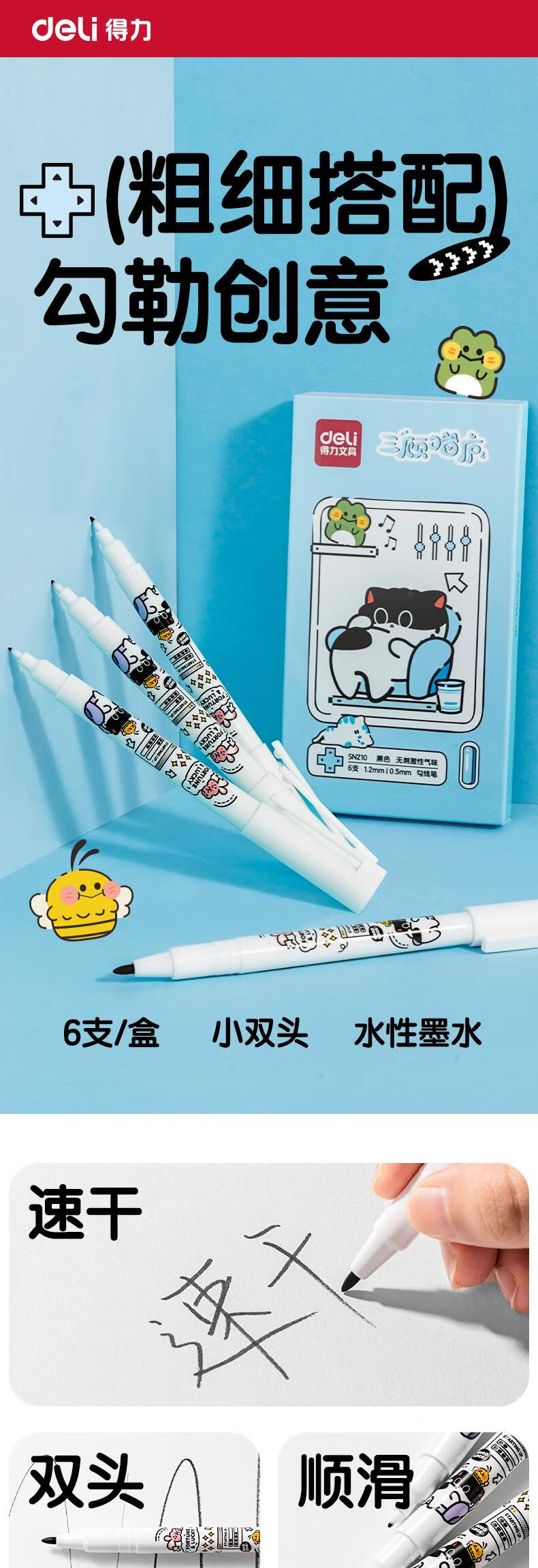 得力(deli)6支三顾喵庐双头1.2mm/0.5mm水性速干勾线笔黑色专业绘画手绘素描画画女孩儿童SN210