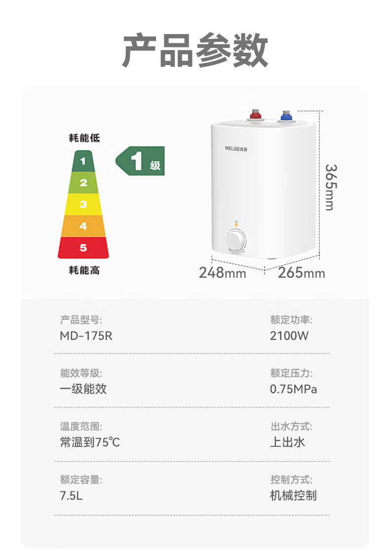 美菱【8年质保】7.5升小厨宝家用电热水器2100W连续出热水57升一级能效国家补贴15%专利防电墙MD-175R