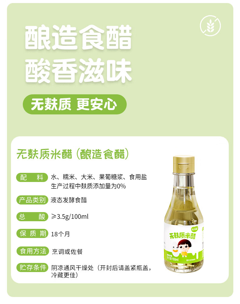 佑儿圆无麸质米醋150ml无小麦拌饭调味凉拌菜佐餐蘸饺子米醋 无麸质米醋