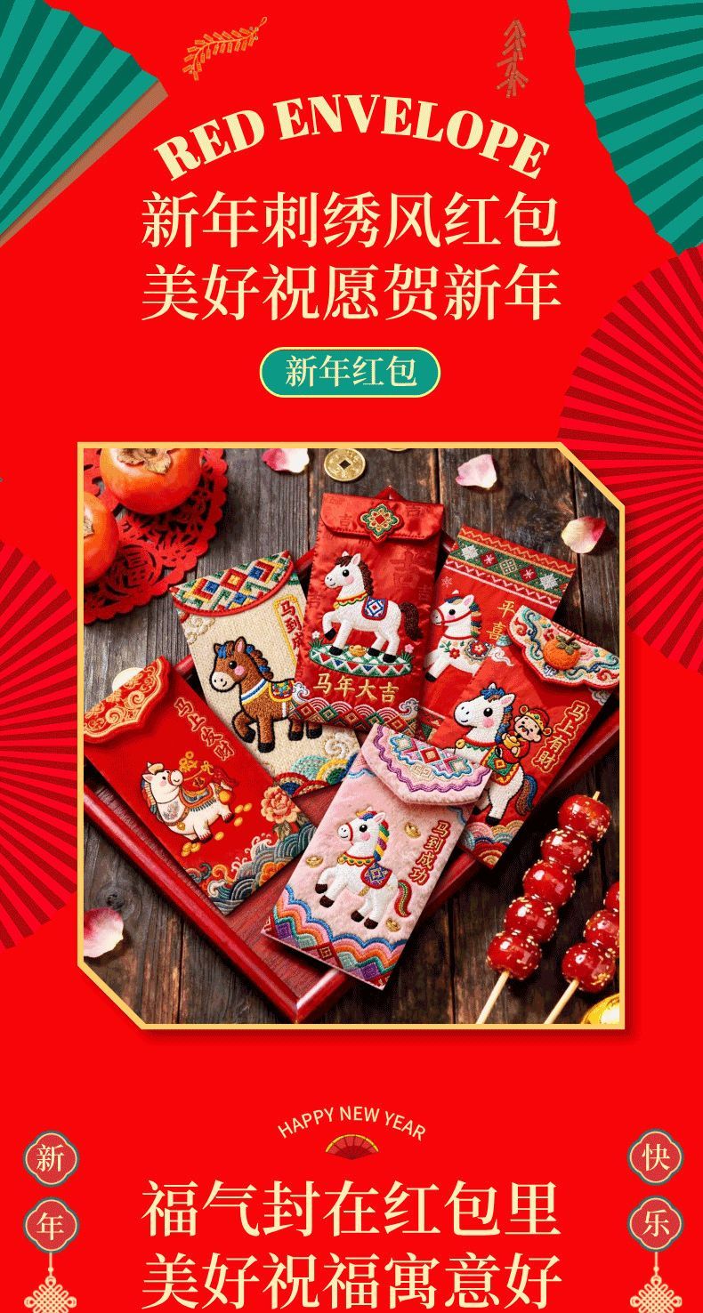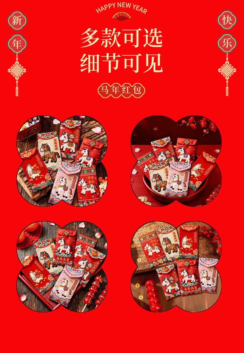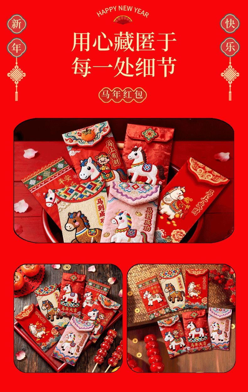 「2026爆款」马年5D立体打印小马日杂小件刺绣春节红包高颜值红包 马到成功红包【6个混装】一包