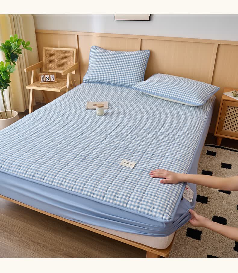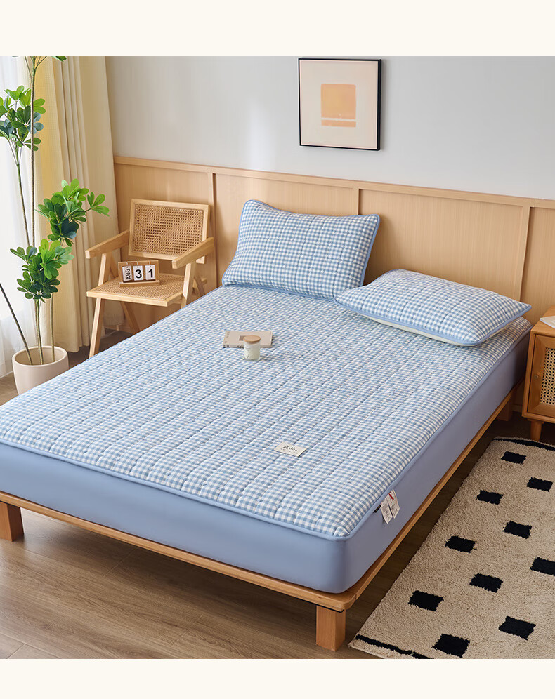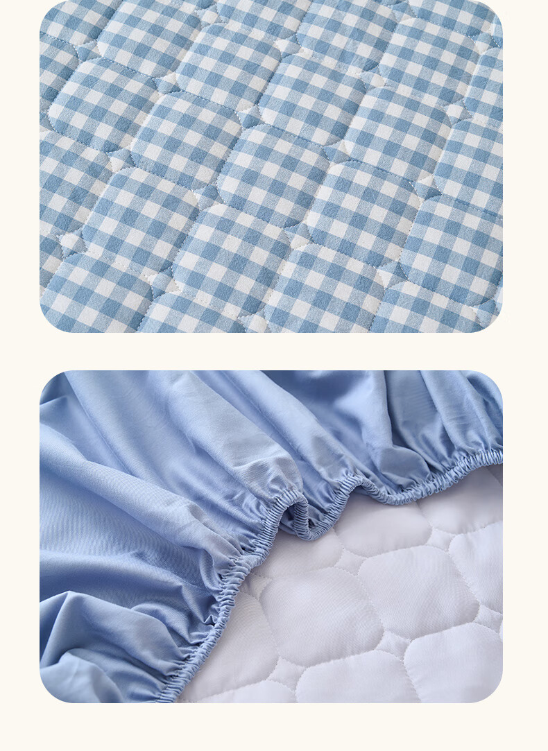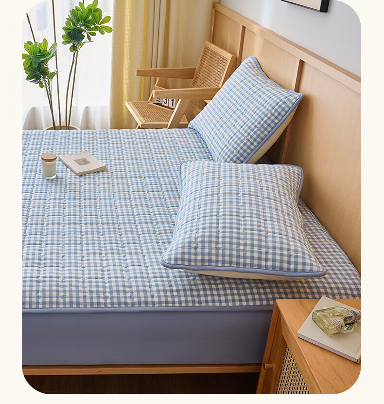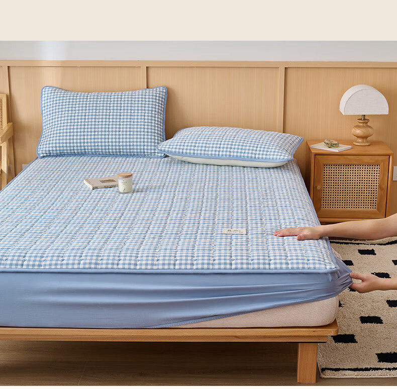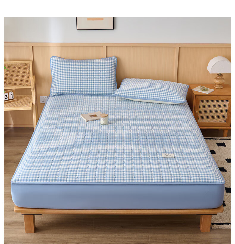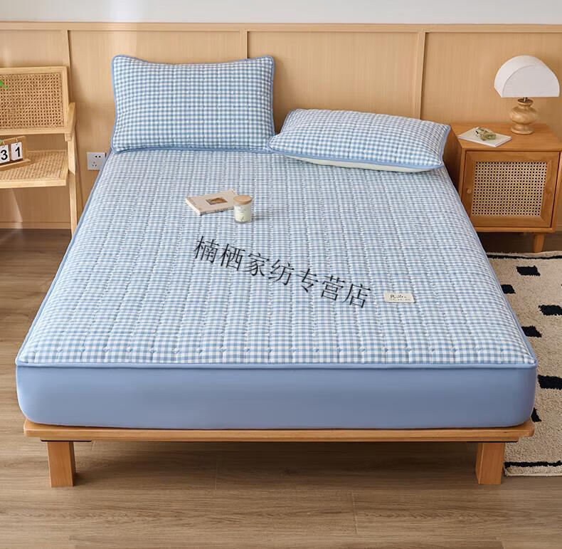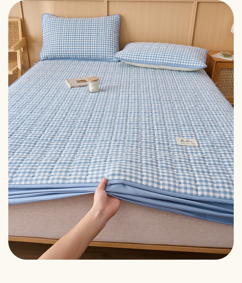 诸禄A类全棉夹棉床笠2米x2.2米2025新款四季通用床罩单件床垫保护隔脏 天蓝小格 床笠三件套 200cm*220cm