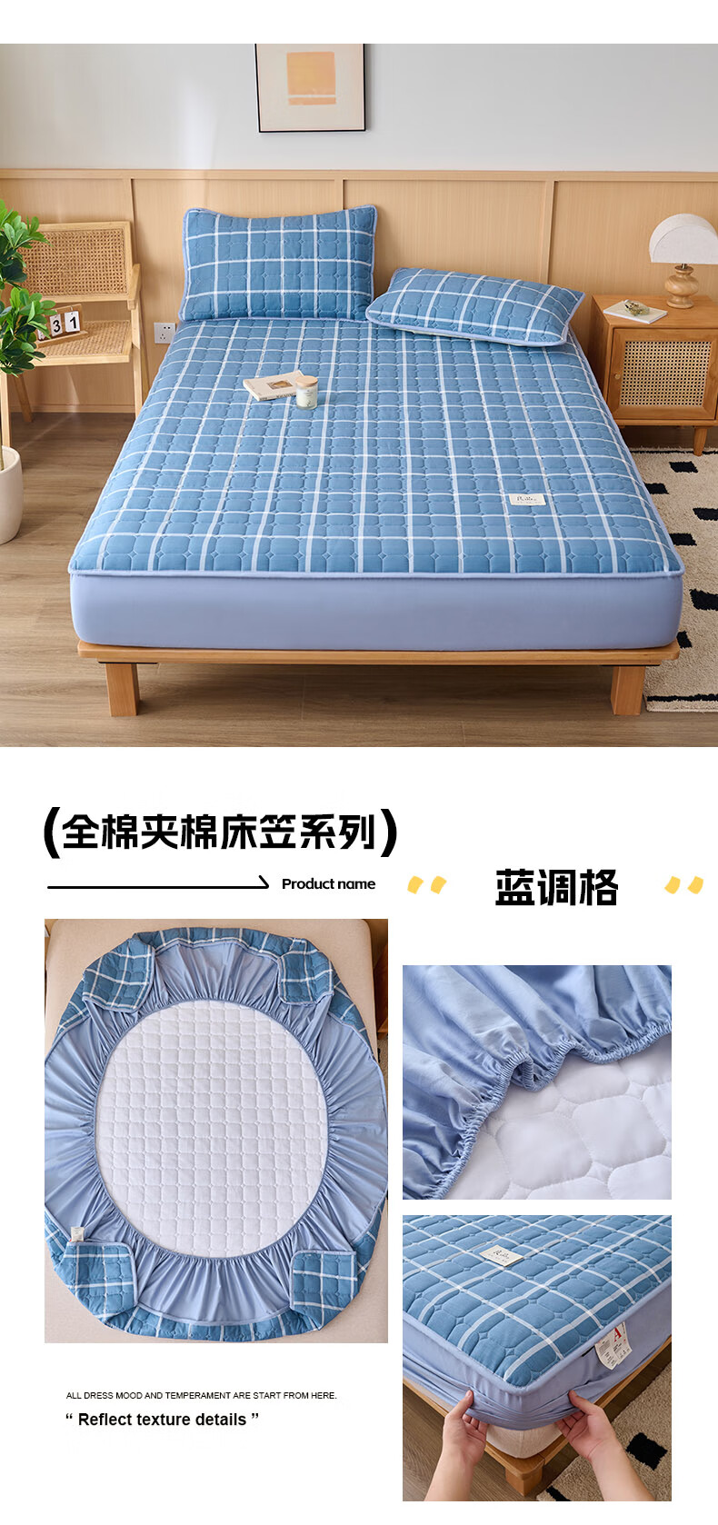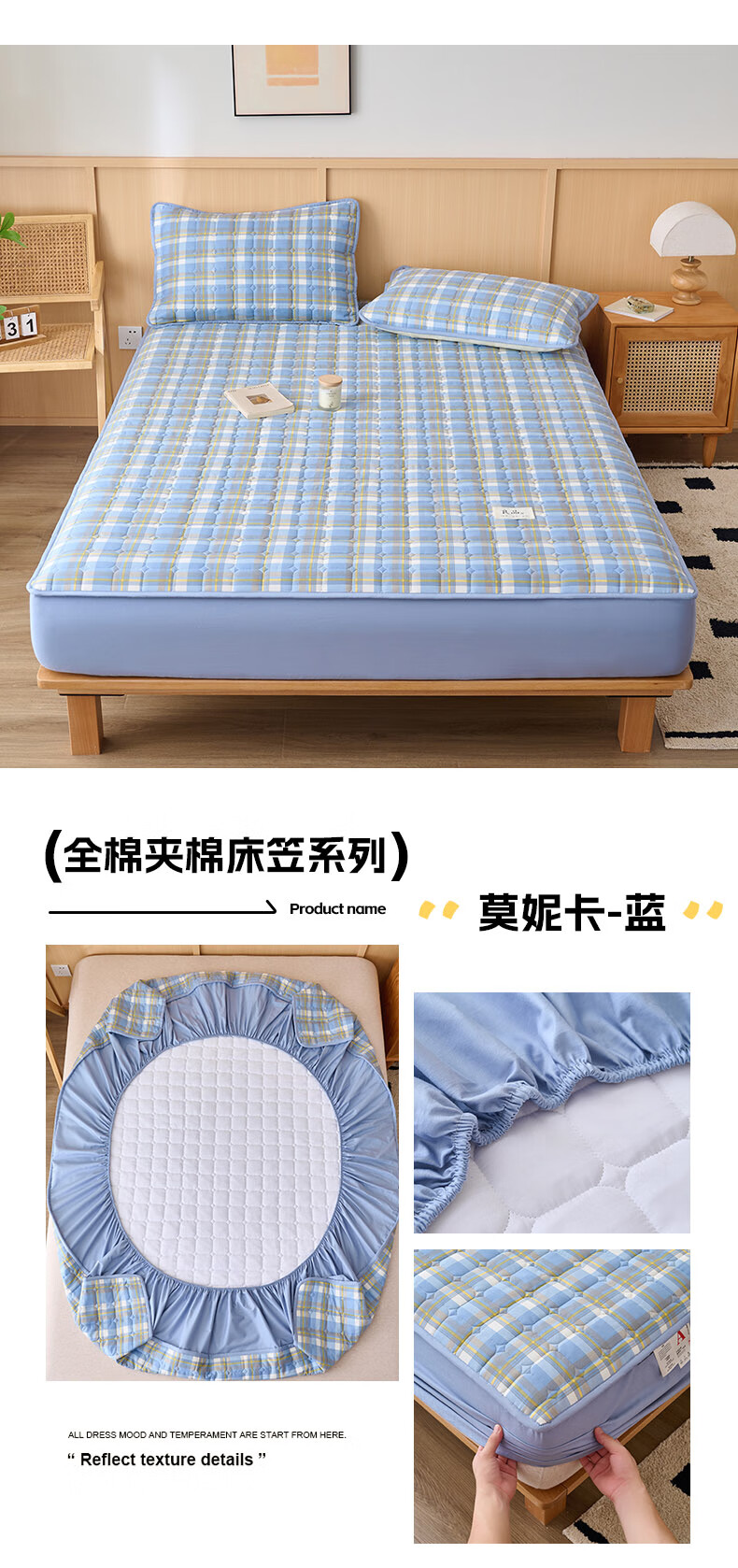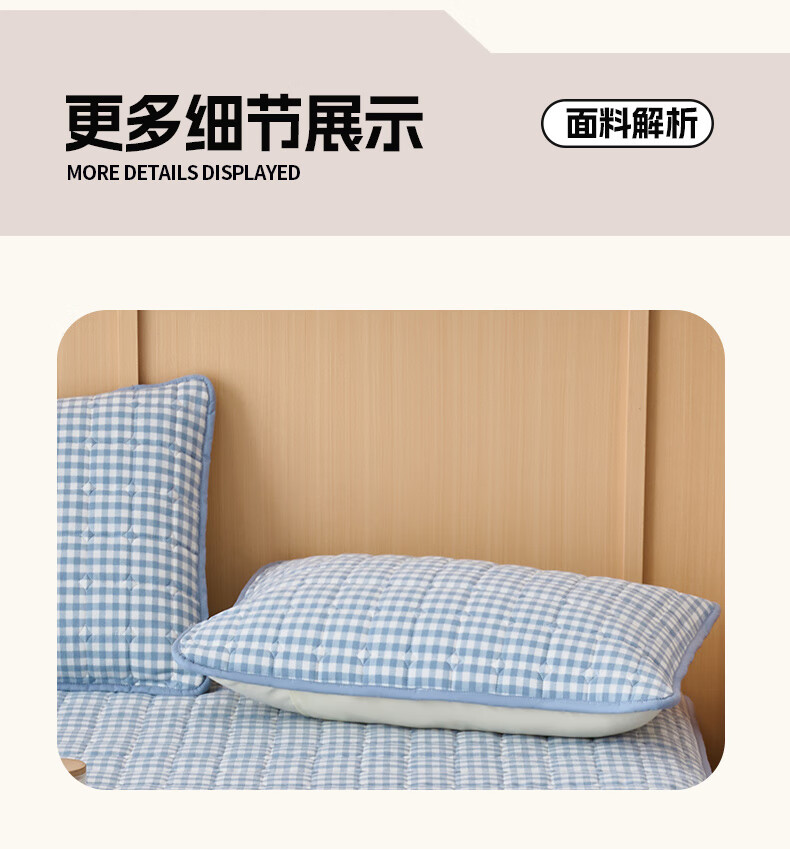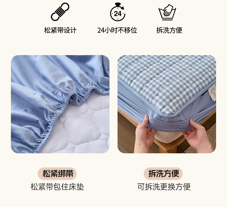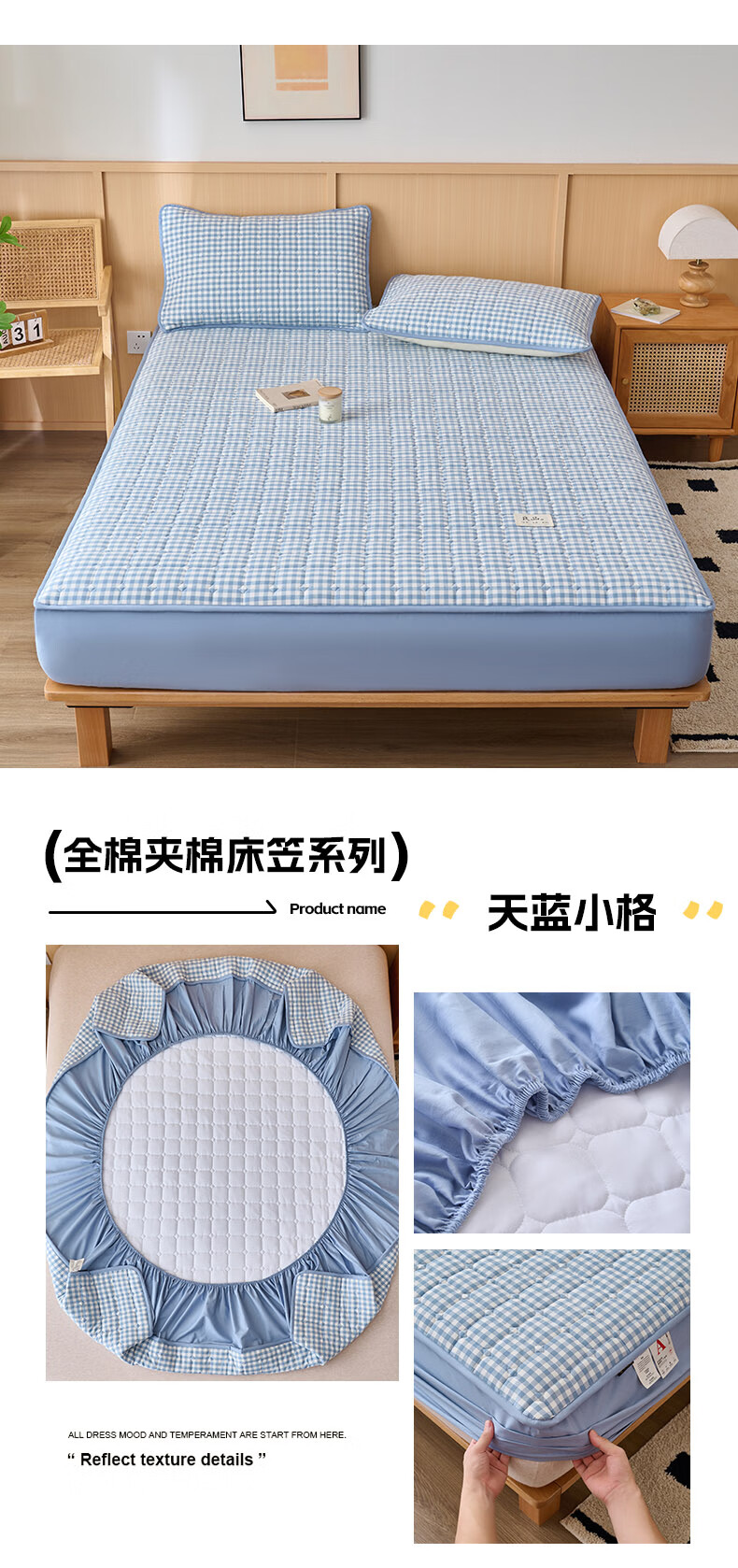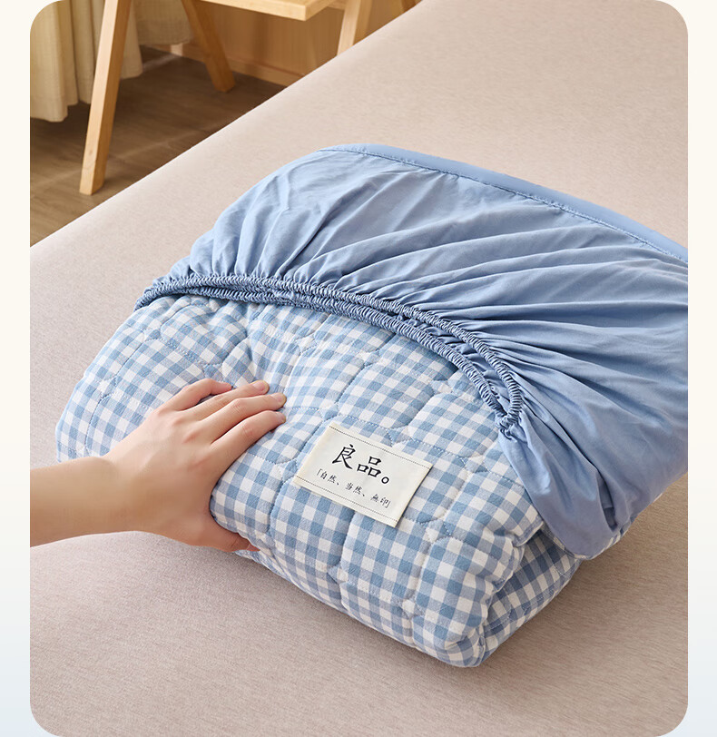 诸禄A类全棉夹棉床笠2米x2.2米2025新款四季通用床罩单件床垫保护隔脏 天蓝小格 床笠三件套 200cm*220cm