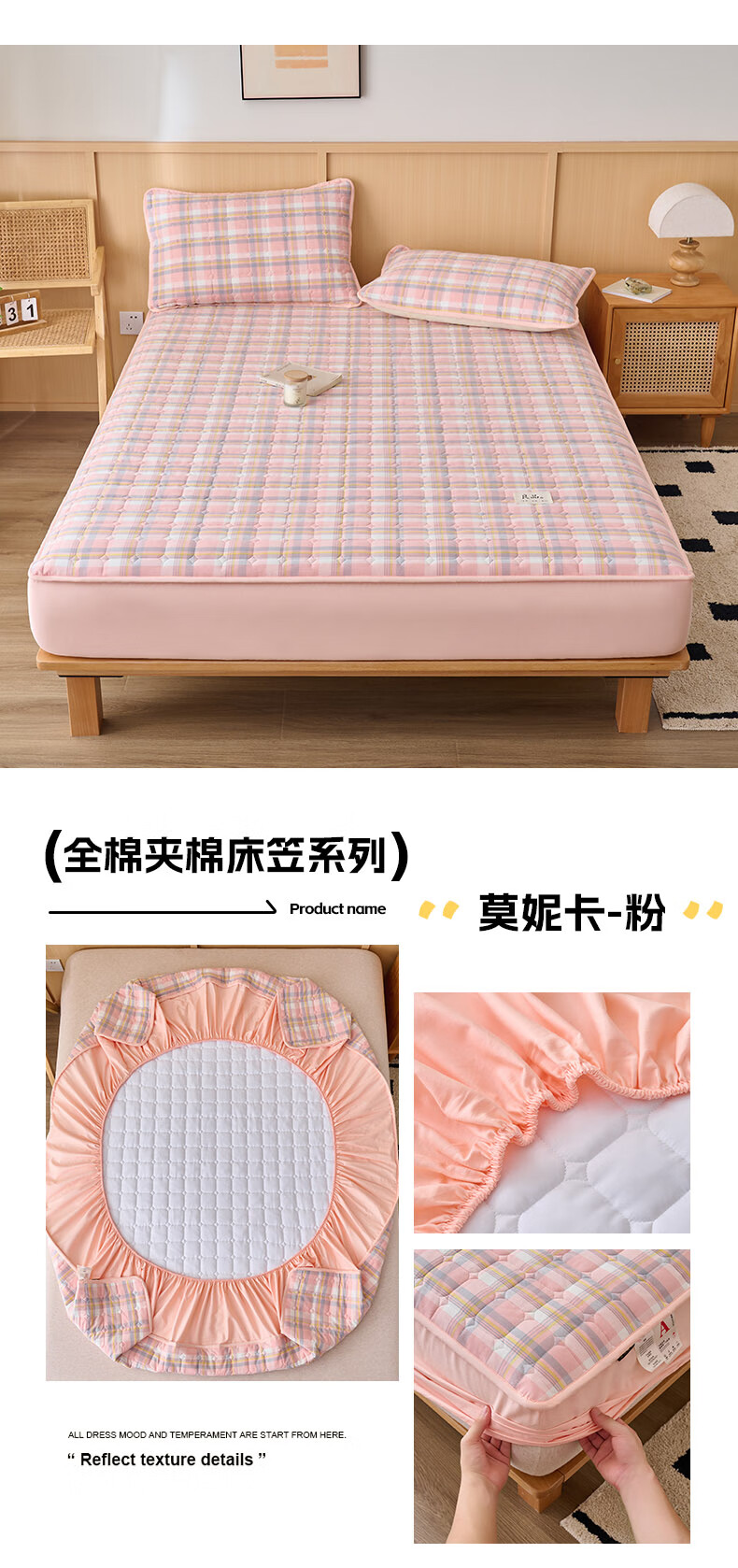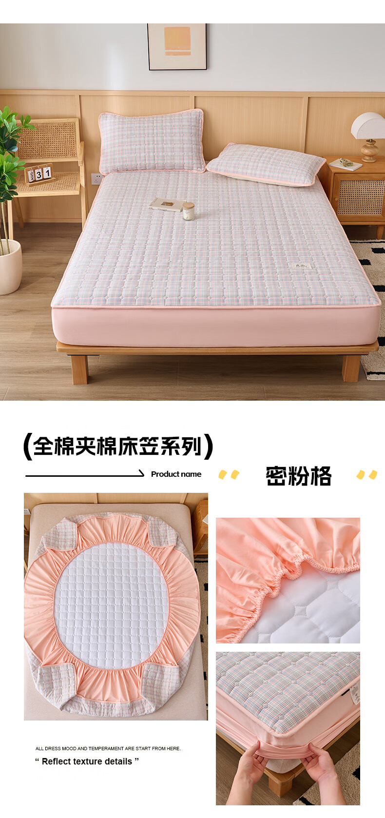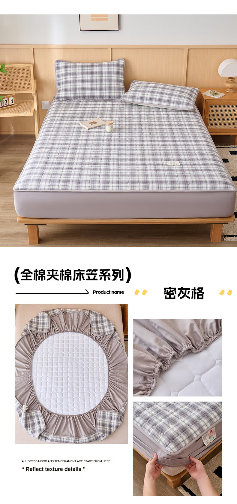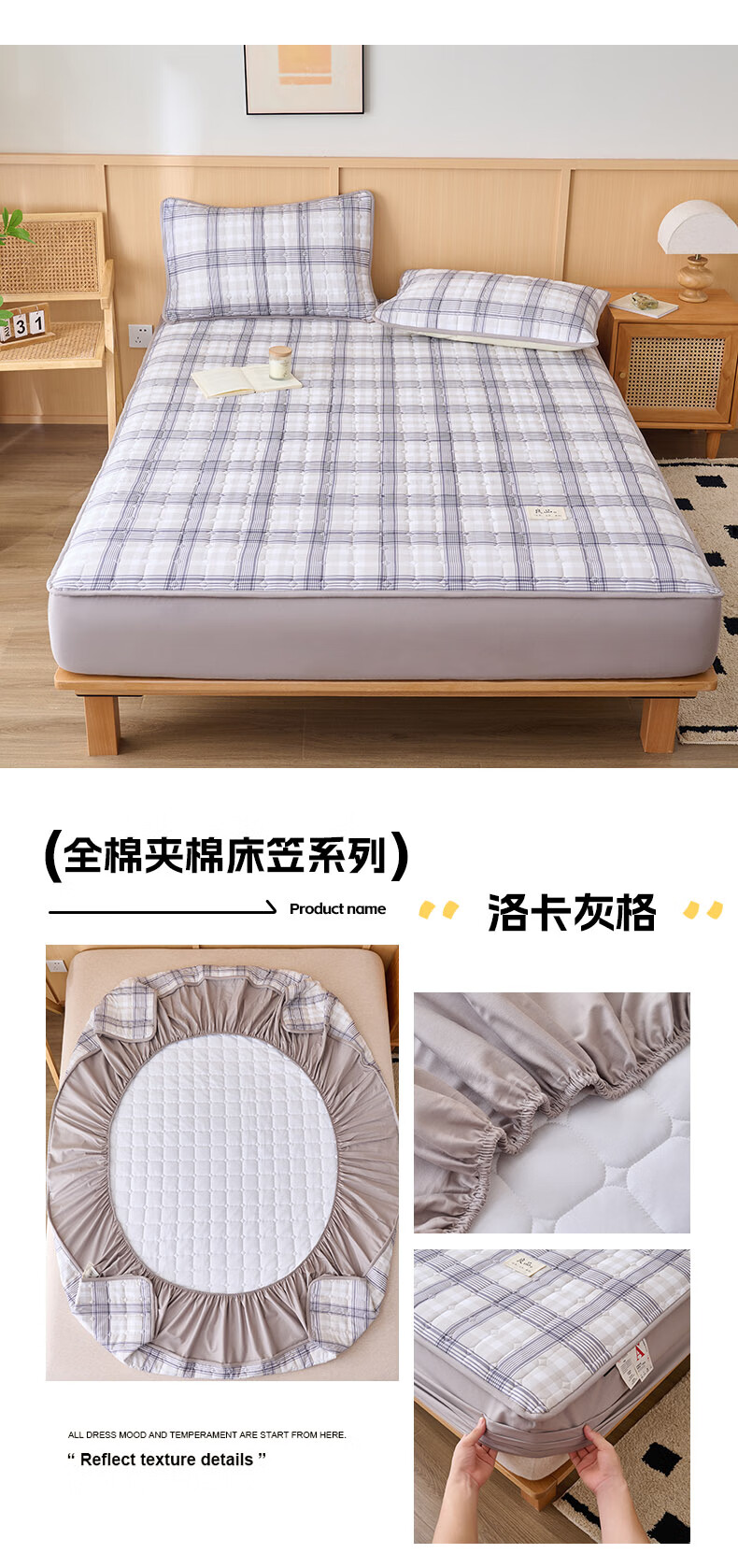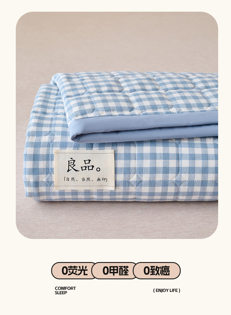 诸禄A类全棉夹棉床笠2米x2.2米2025新款四季通用床罩单件床垫保护隔脏 天蓝小格 床笠三件套 200cm*220cm