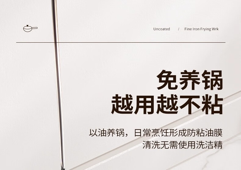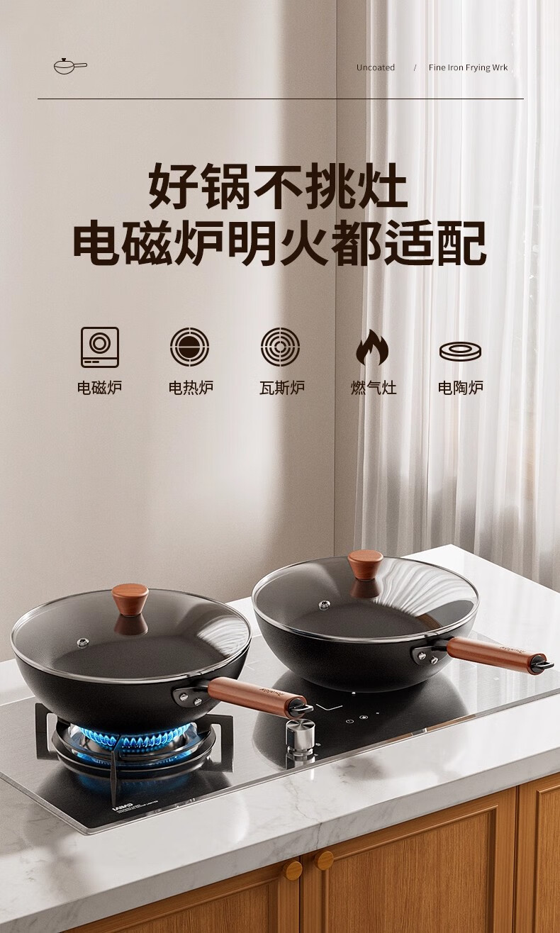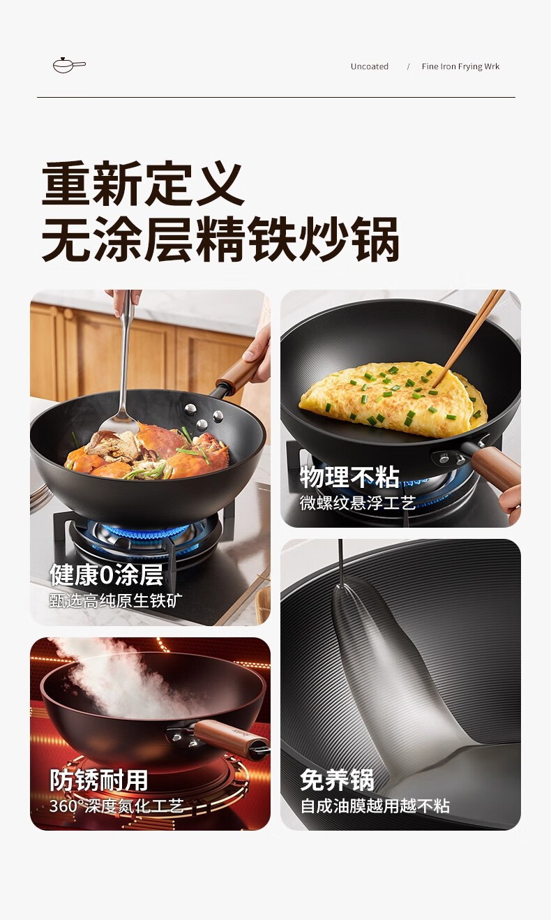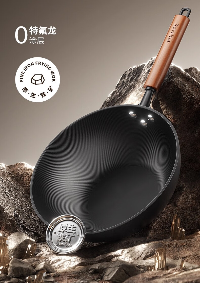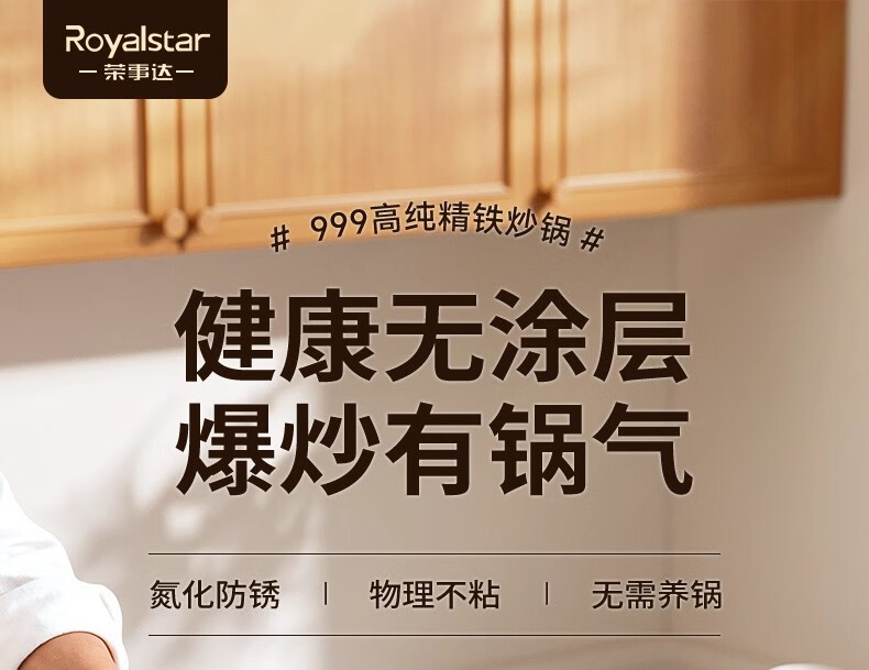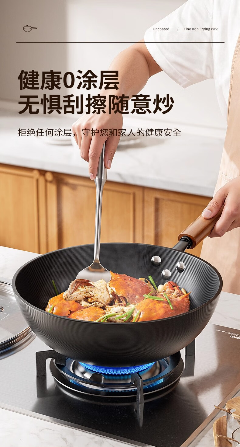 荣事达999精铁锅炒锅家用不锈无涂层免开锅电磁炉燃气通用炒菜锅 平底款丨带盖】不粘不锈免开锅 粘锅包退 34cm