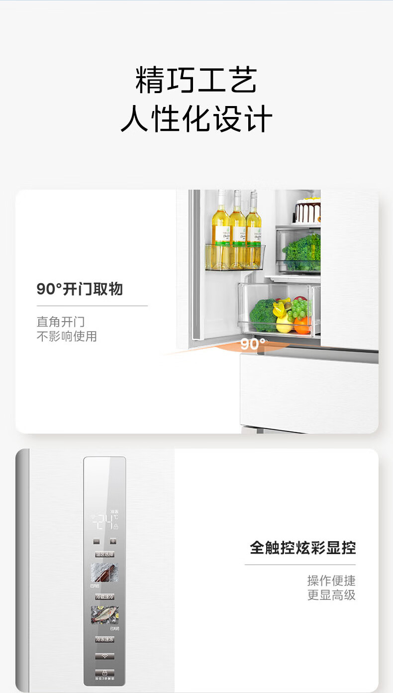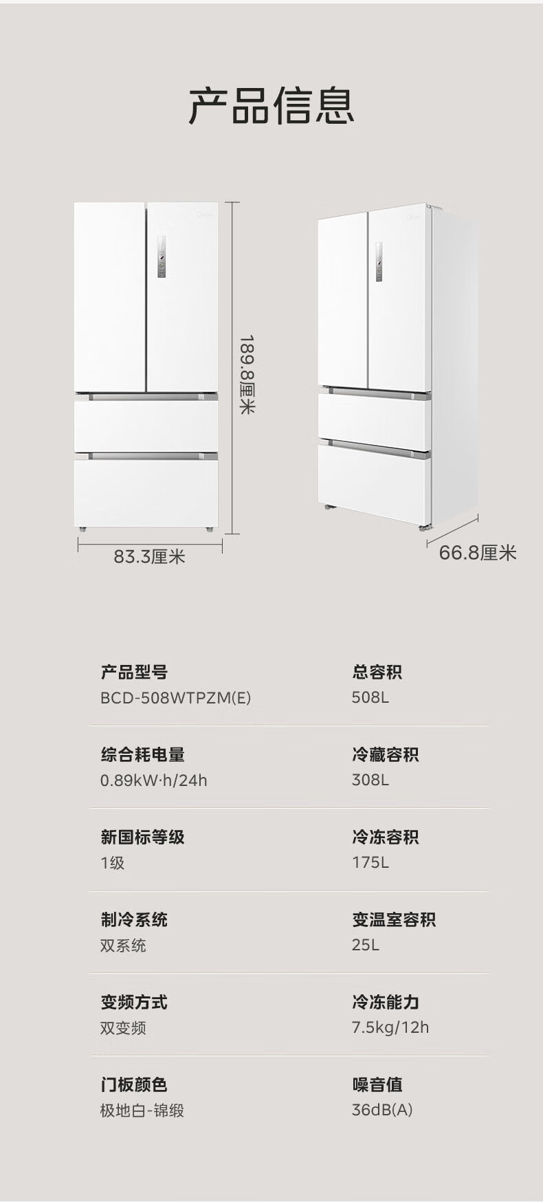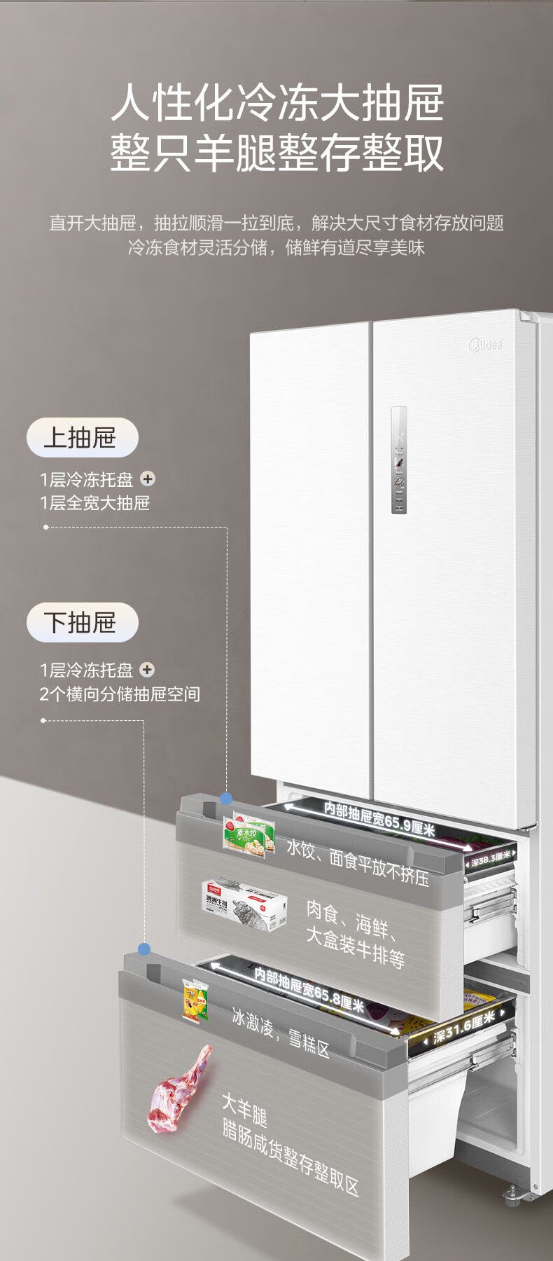 美的(Midea)508L法式四开门冰箱双系统循环一级能效除菌净味风冷大容量以旧换新白色BCD-508WTPZM(E) 国家补贴