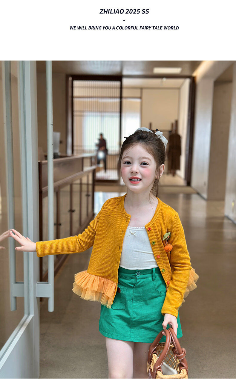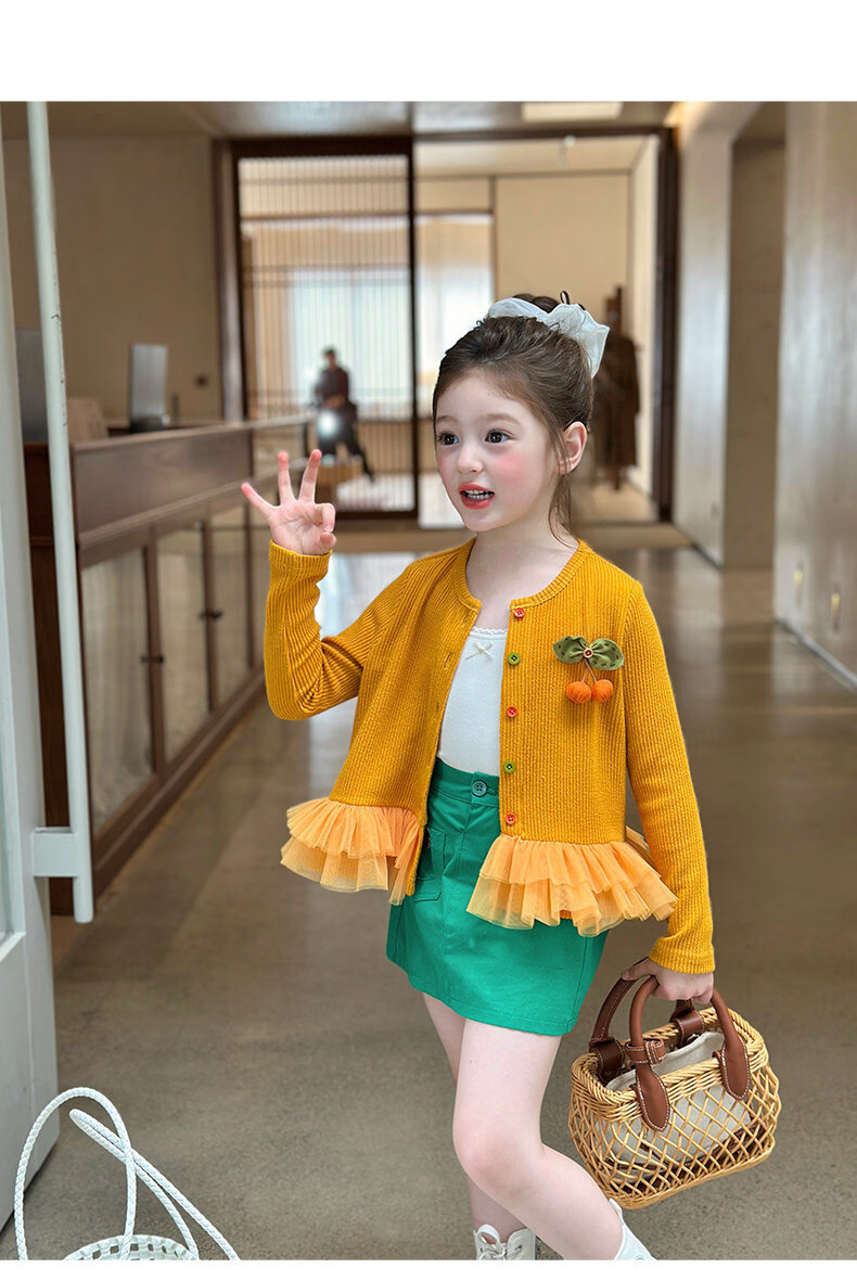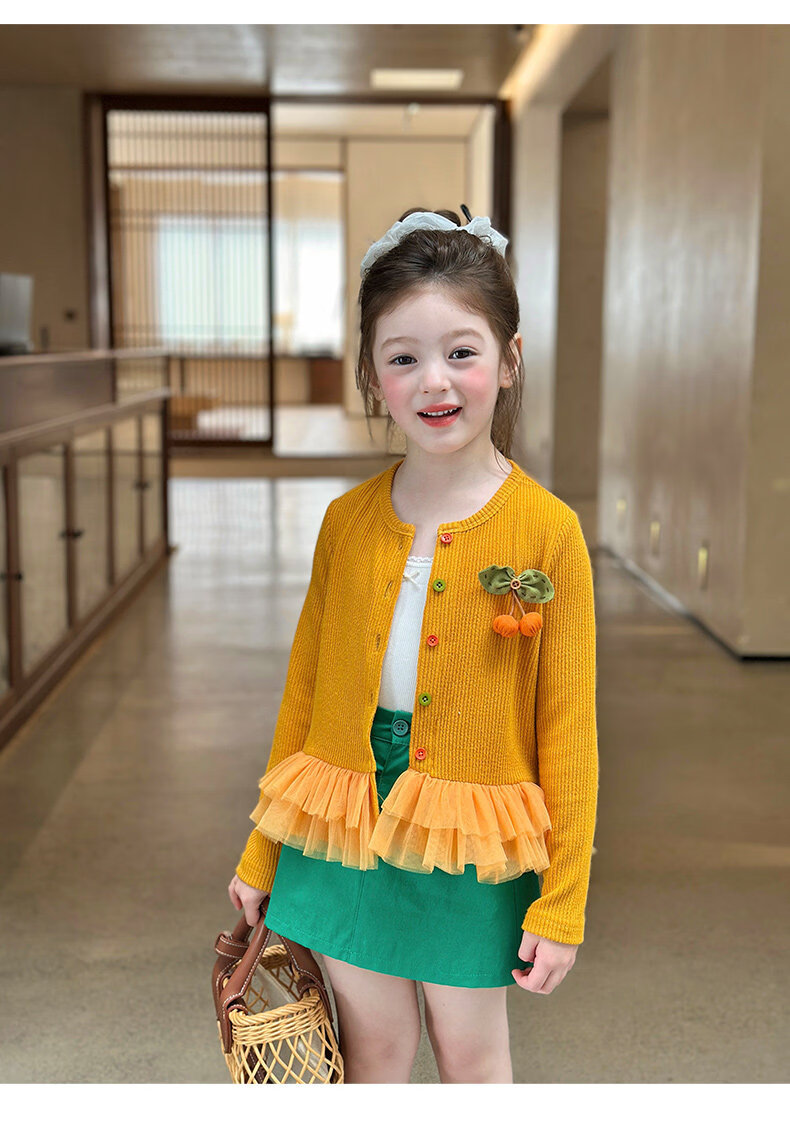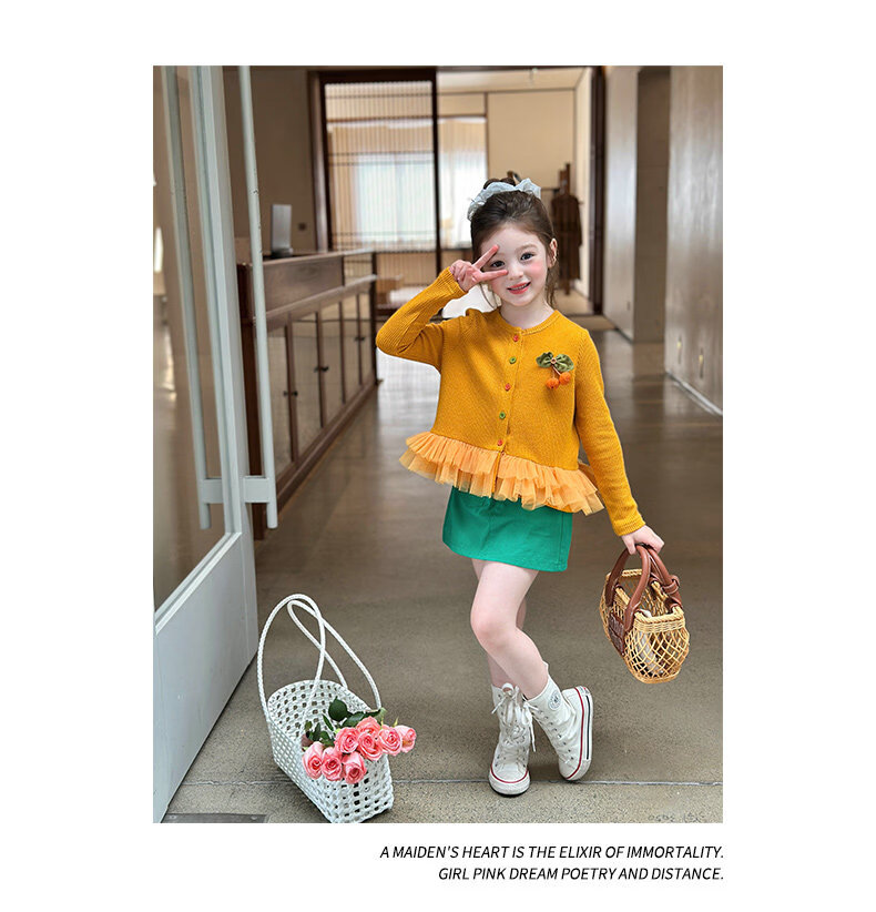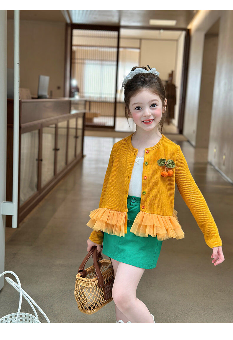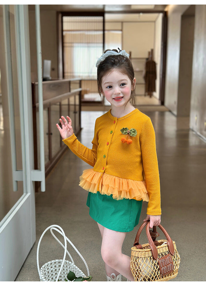 栀了成长记女童装百搭网纱拼接毛衣2026春季儿童新款休闲针织开衫 绿色 半身裙 140 cm