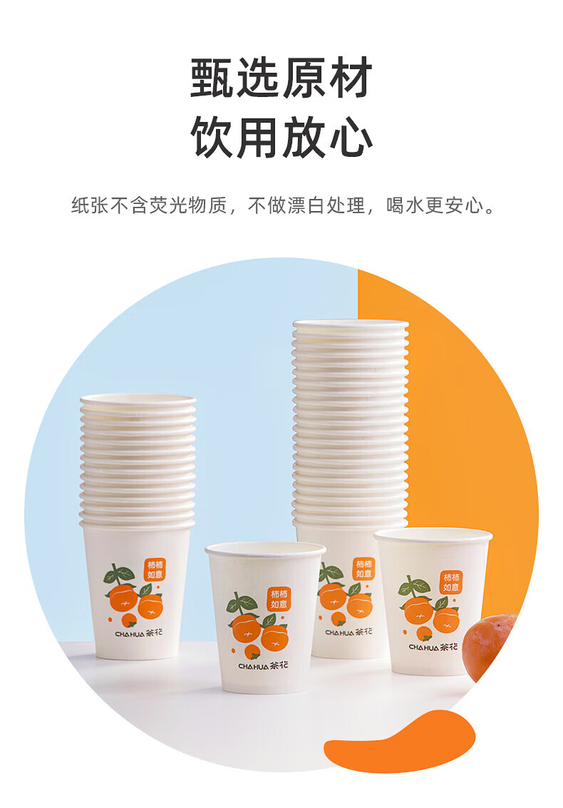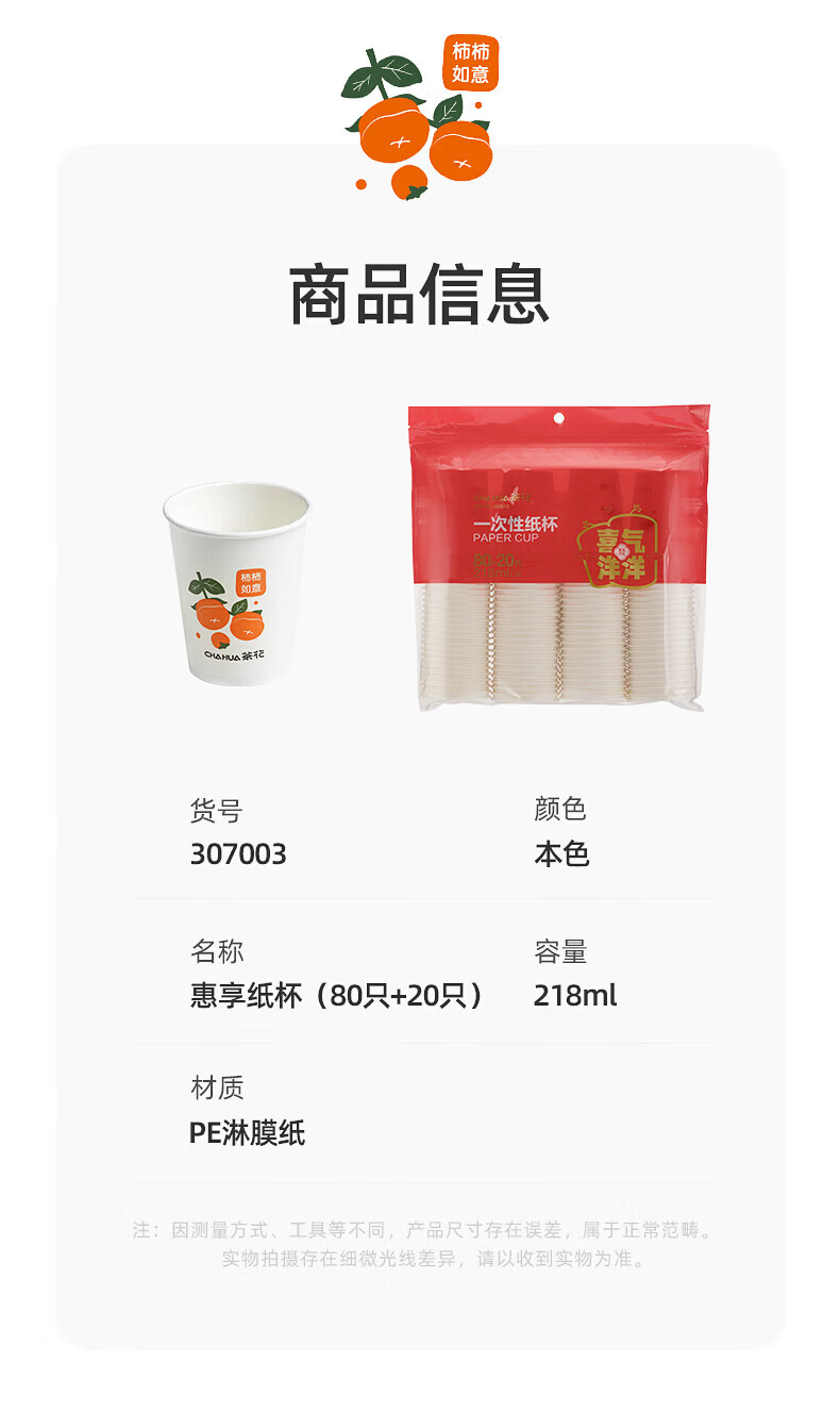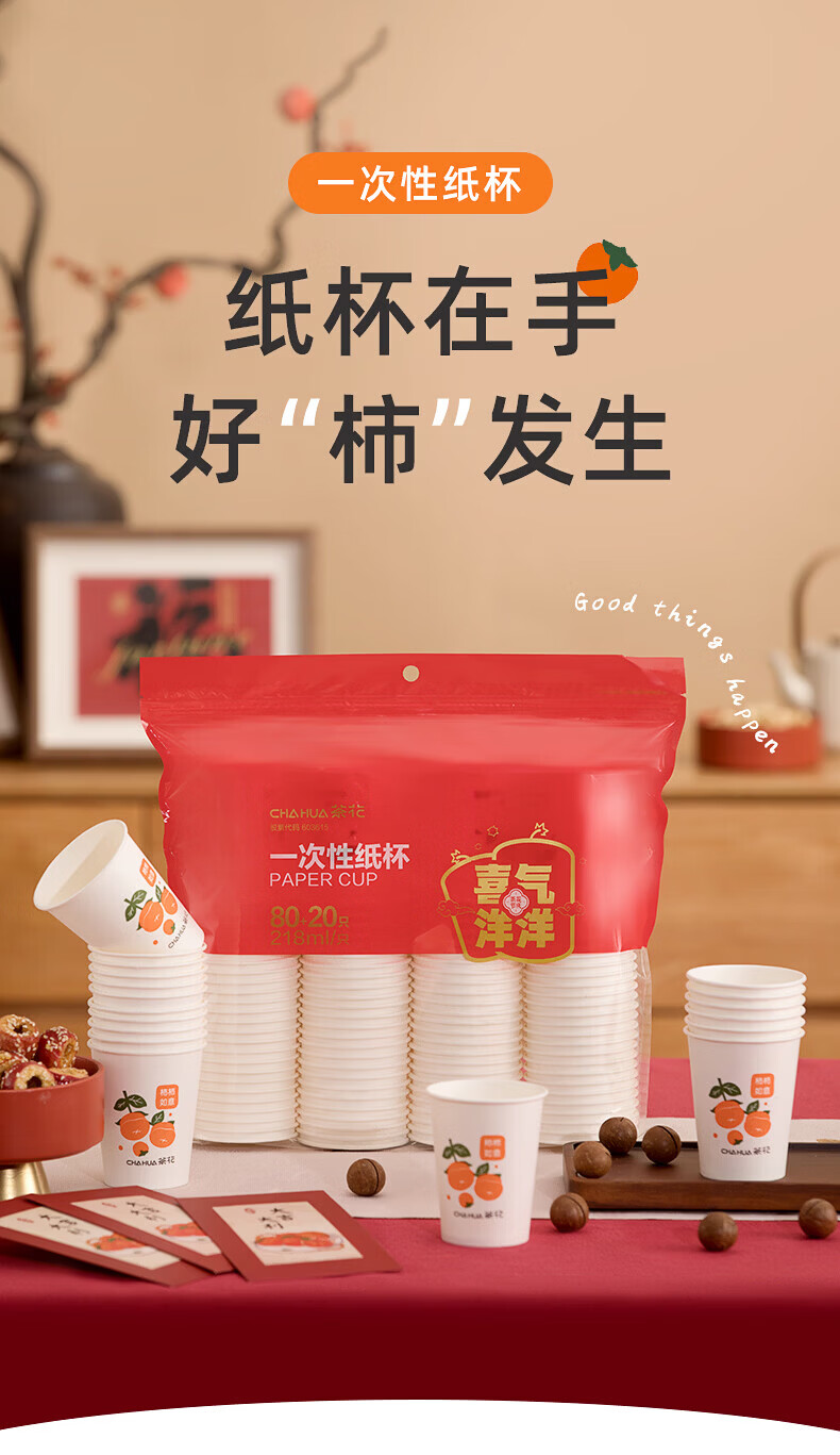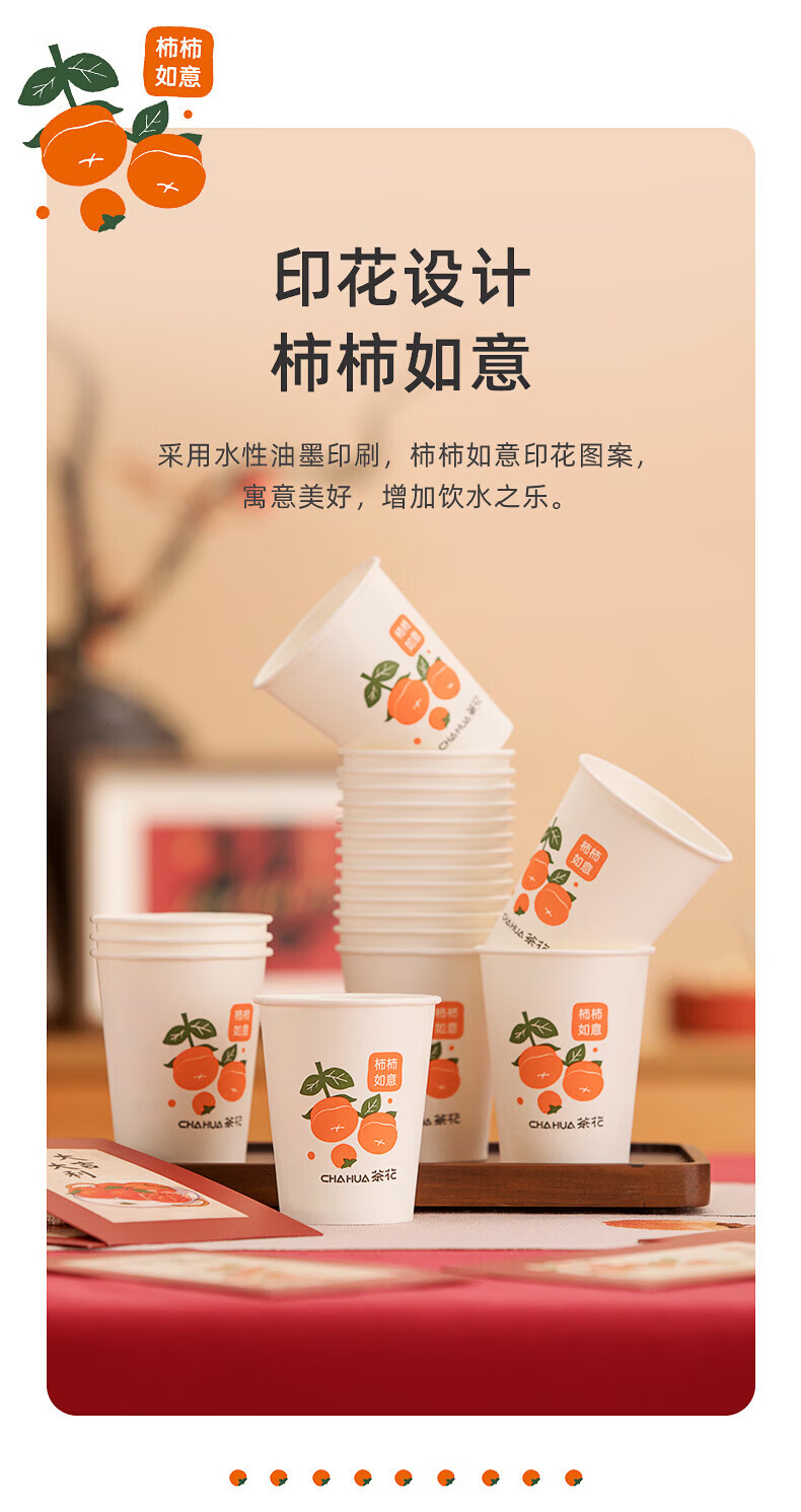 茶花(CHAHUA)一次性加厚纸杯柿柿如意咖啡杯奶茶杯饮料杯新年过年节庆包装 柿柿如意 100只 单只218ML