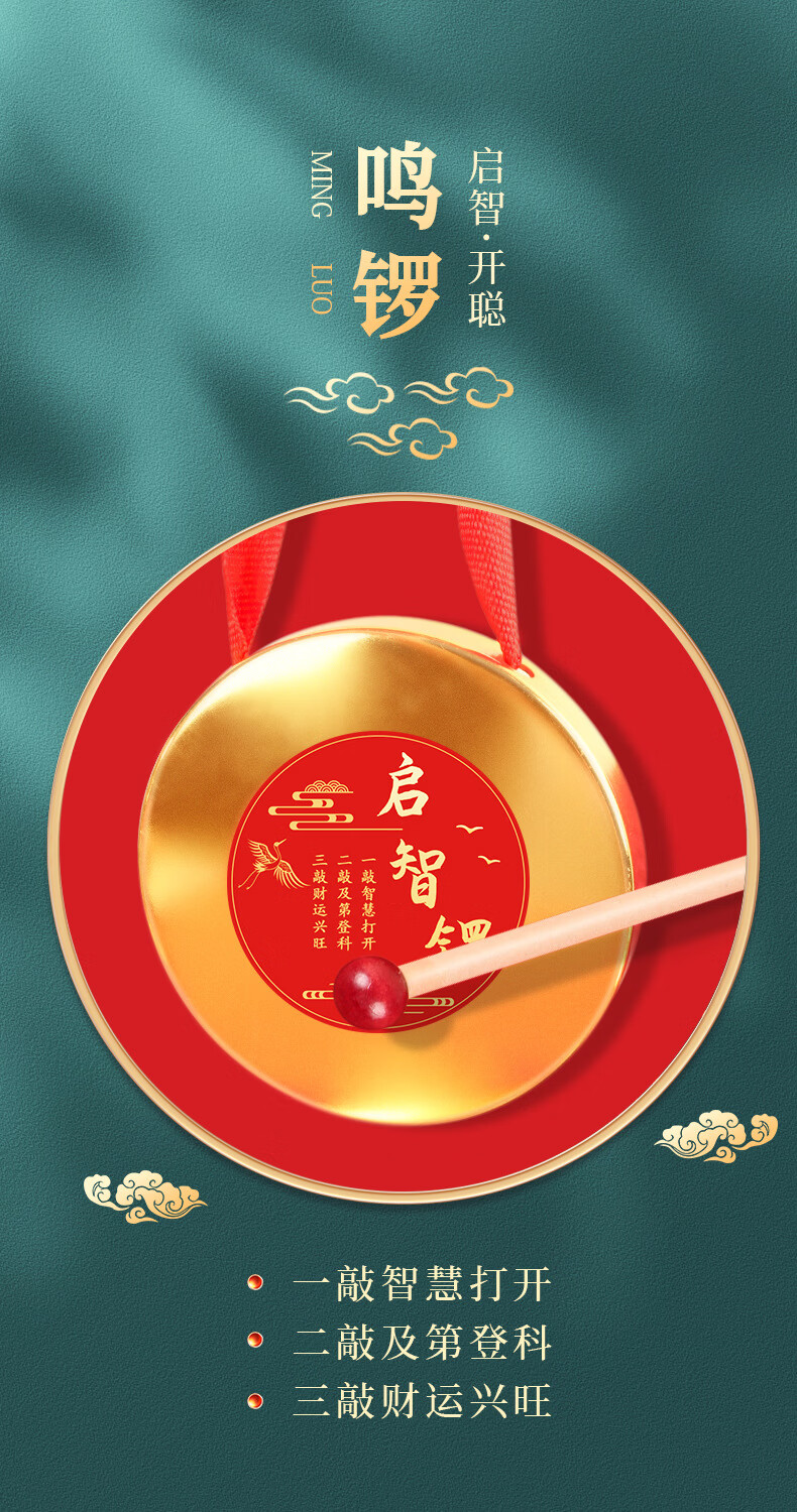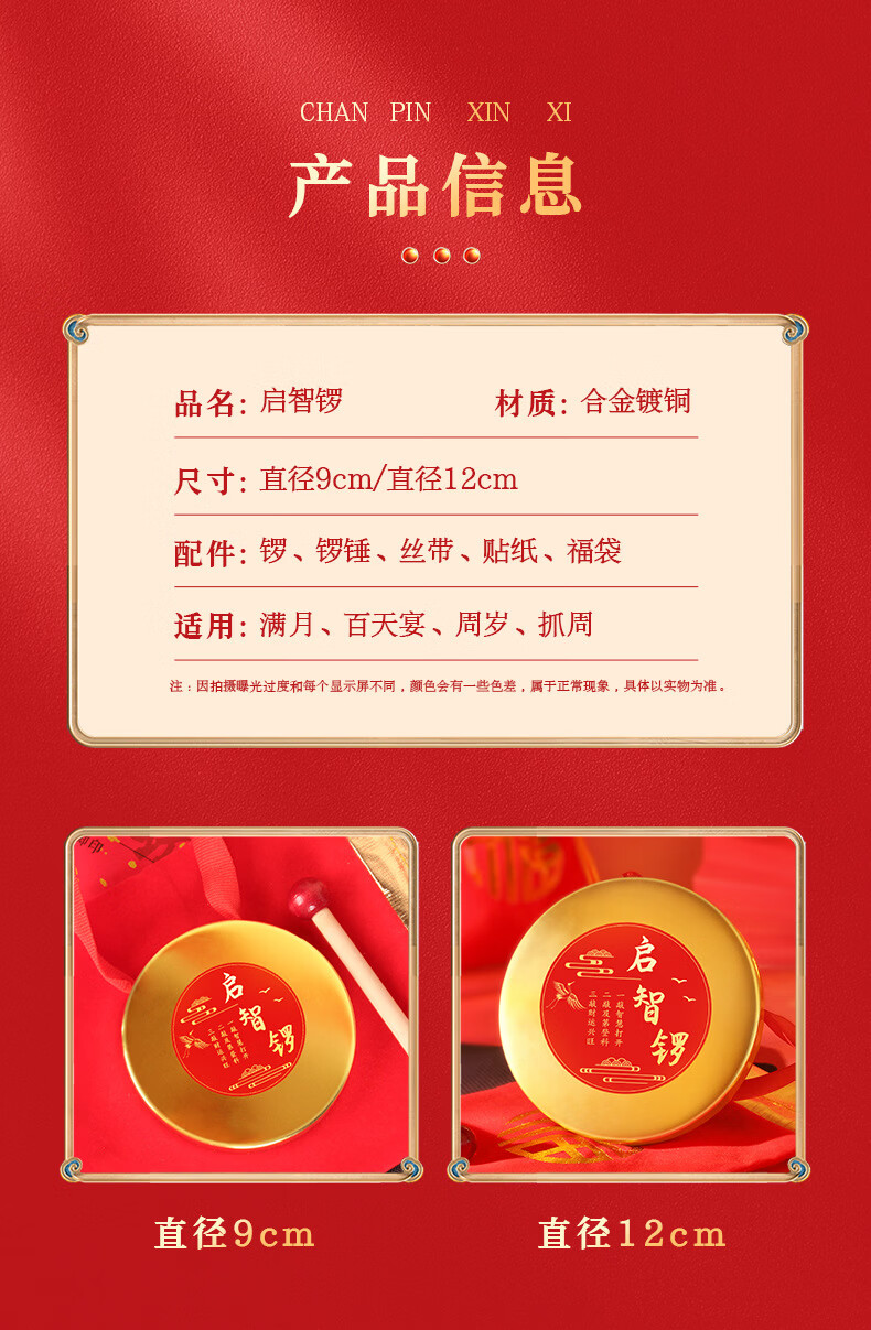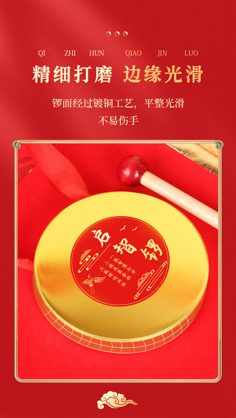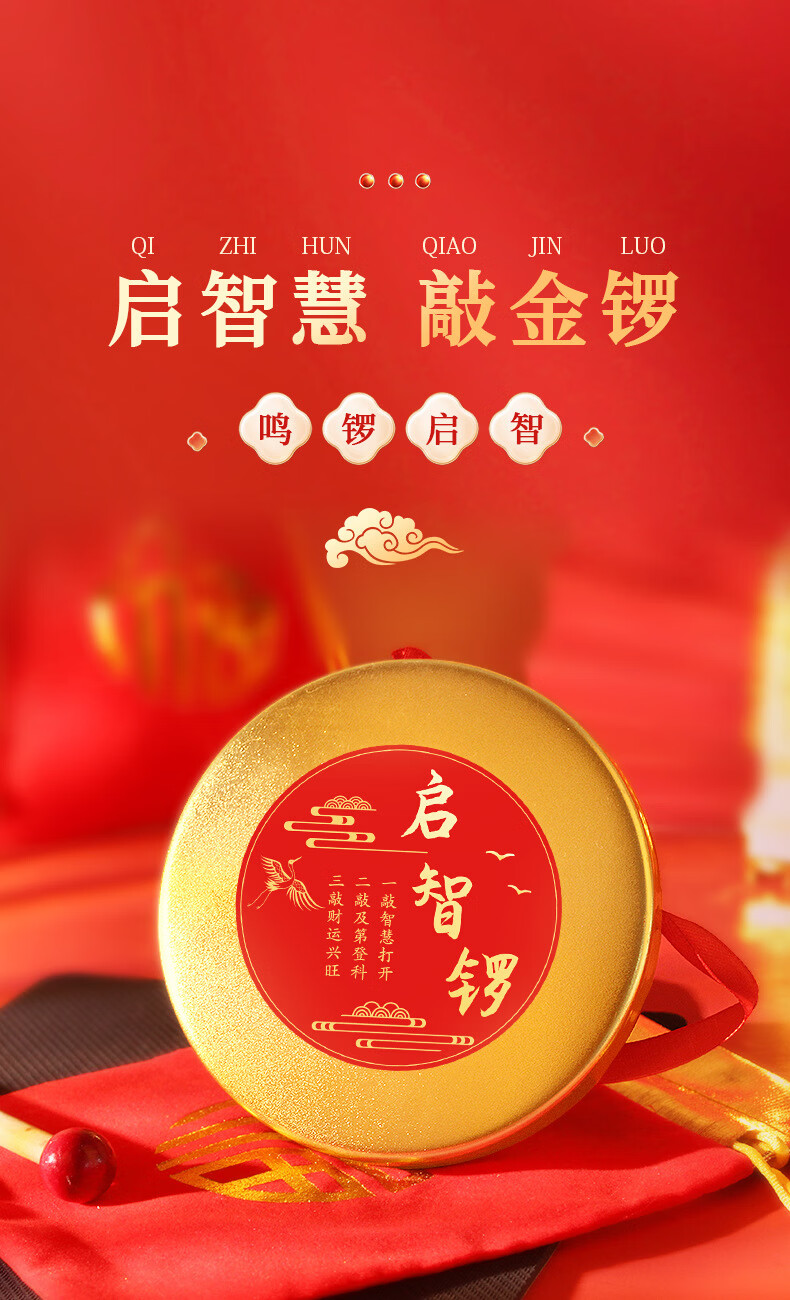 沃有家抓周用品套装抓阄道具敲启智慧金锣鼓周岁生日礼物仪式宴场景装饰 启智锣(大号12cm)+锣锤+丝带+福袋