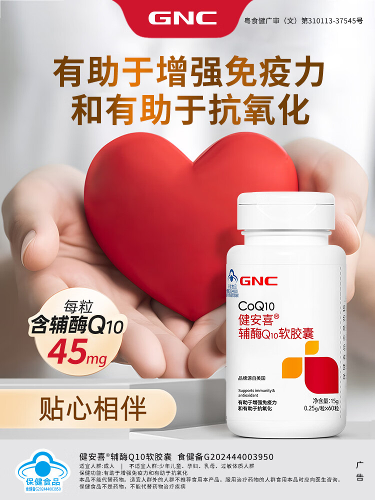 健安喜(GNC)辅酶Q10软胶囊60粒 含维生素E VE 有助于增强免疫力 抗氧化 成人 60粒*1瓶