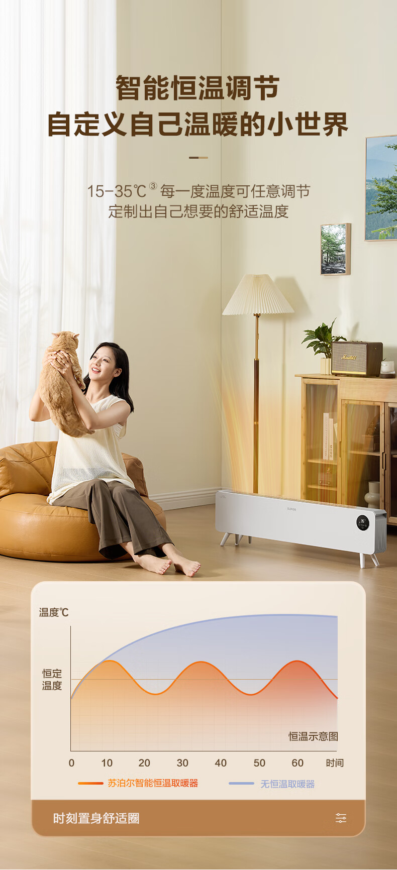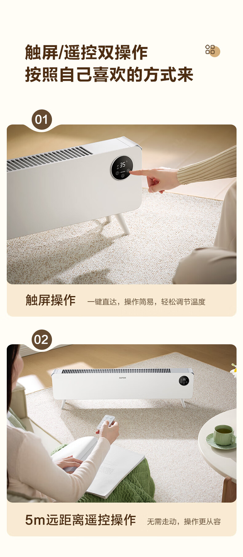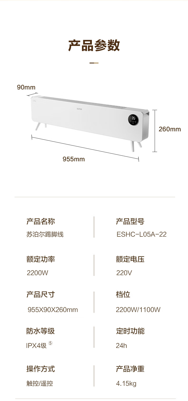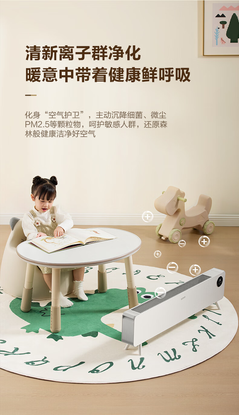 苏泊尔石墨烯踢脚线取暖器电暖气电暖器家用暖气片移动地暖IPX4级防水居浴两用对流卧室办公室暖脚 【遥控+声控】ESHC-L06A-22/珍珠白