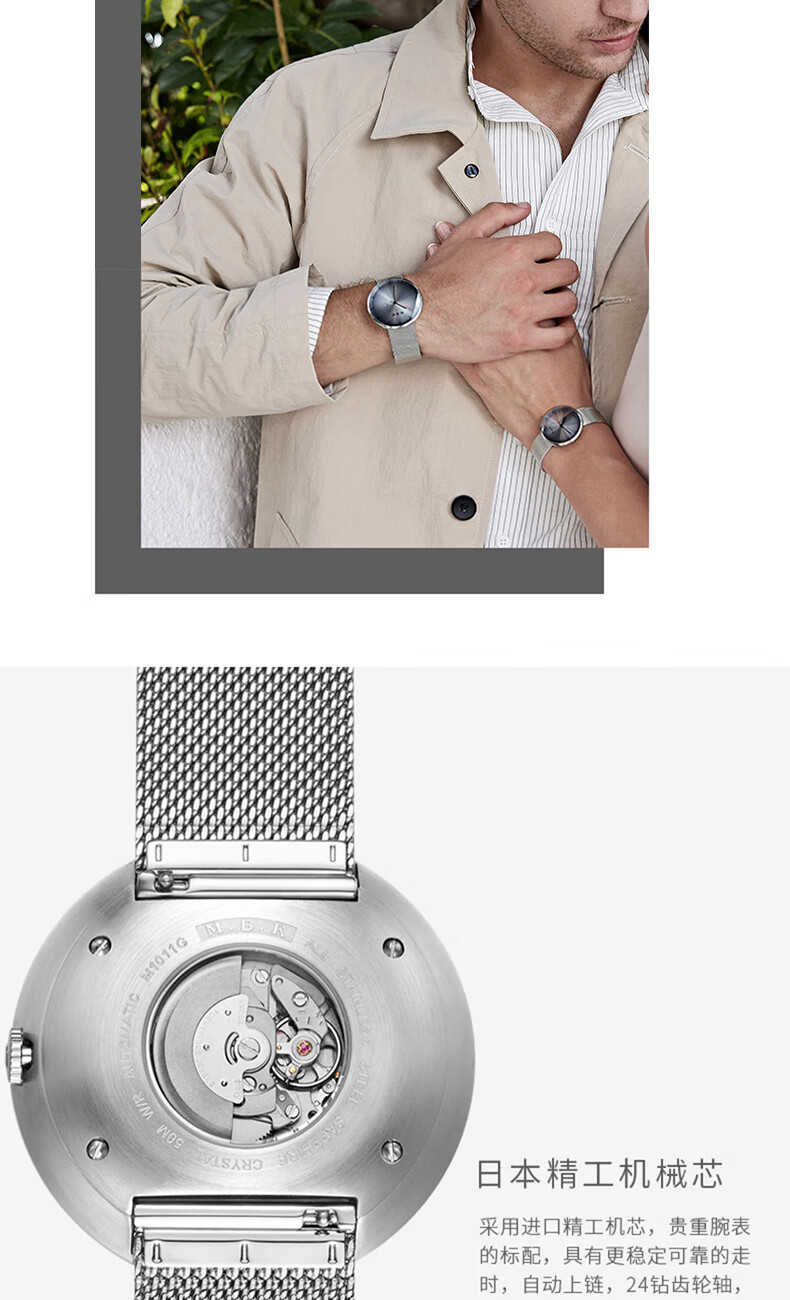 圀朗 GLOFATE GF品牌原创全自动机械手表男中文国货手表皮带钢带防水透底国潮风 白色 银色钢带 39mm