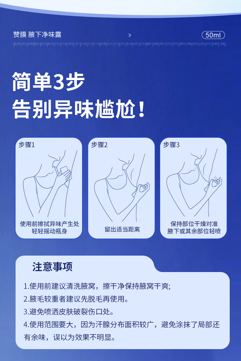 赞膜腋下净味露腋下喷剂含多种植物成分腋下清新干爽舒适止汗露正品臭 50ml 3瓶 厂家直供 正品保障