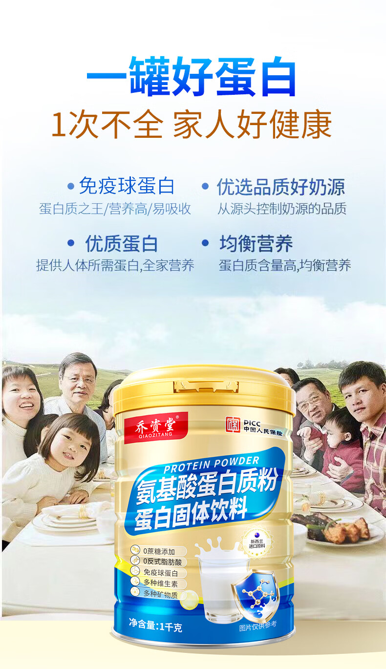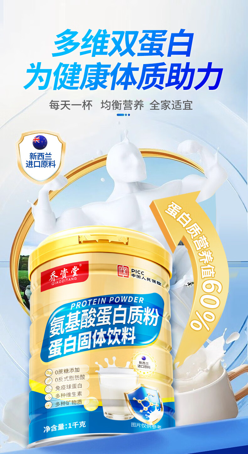 乔资堂1000克氨基酸蛋白质粉0蔗糖补充蛋白质氨基酸牛初乳维生素矿物质 1000g*2罐 【礼袋装】