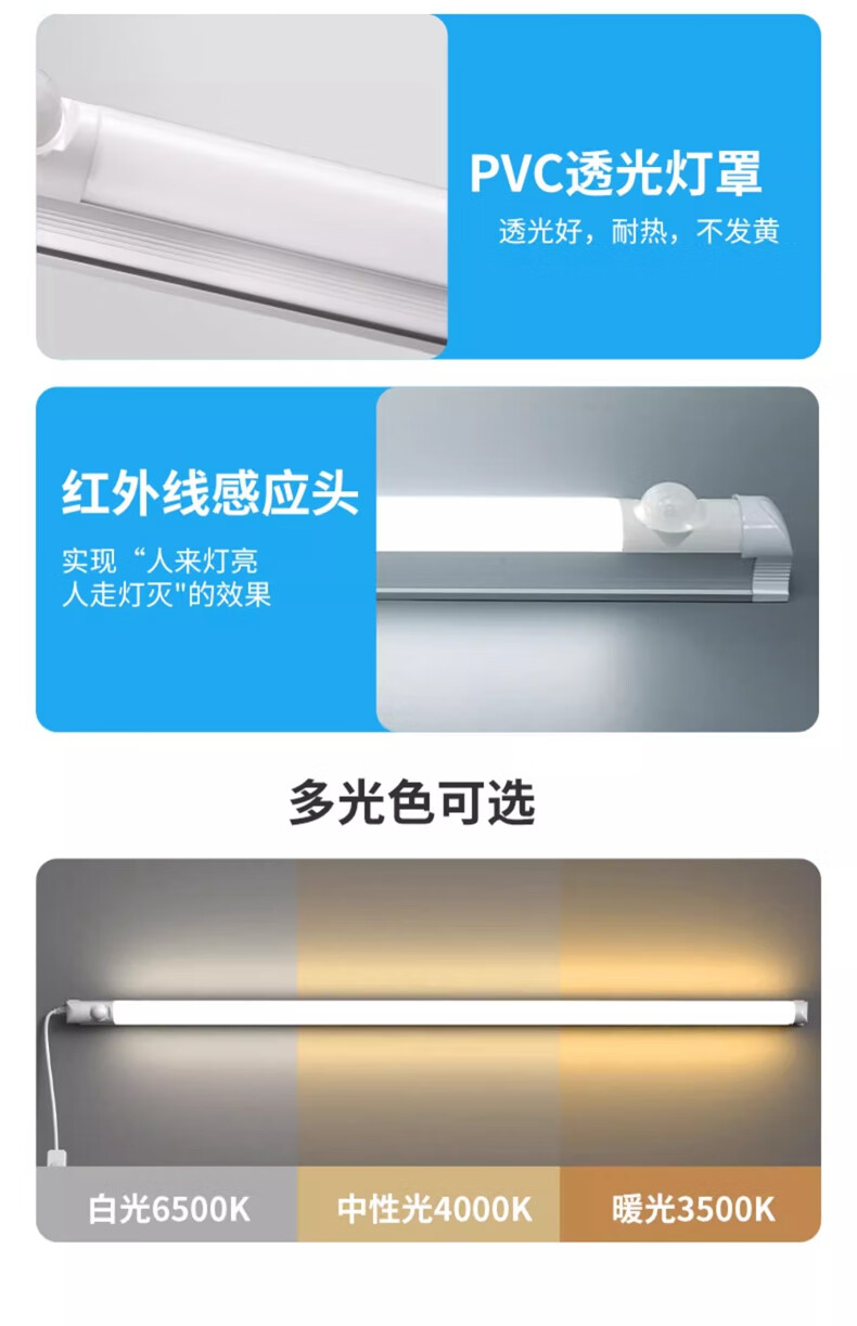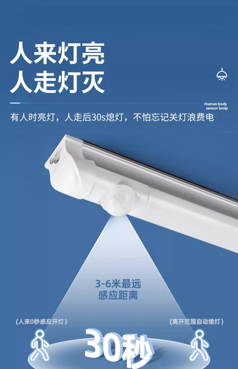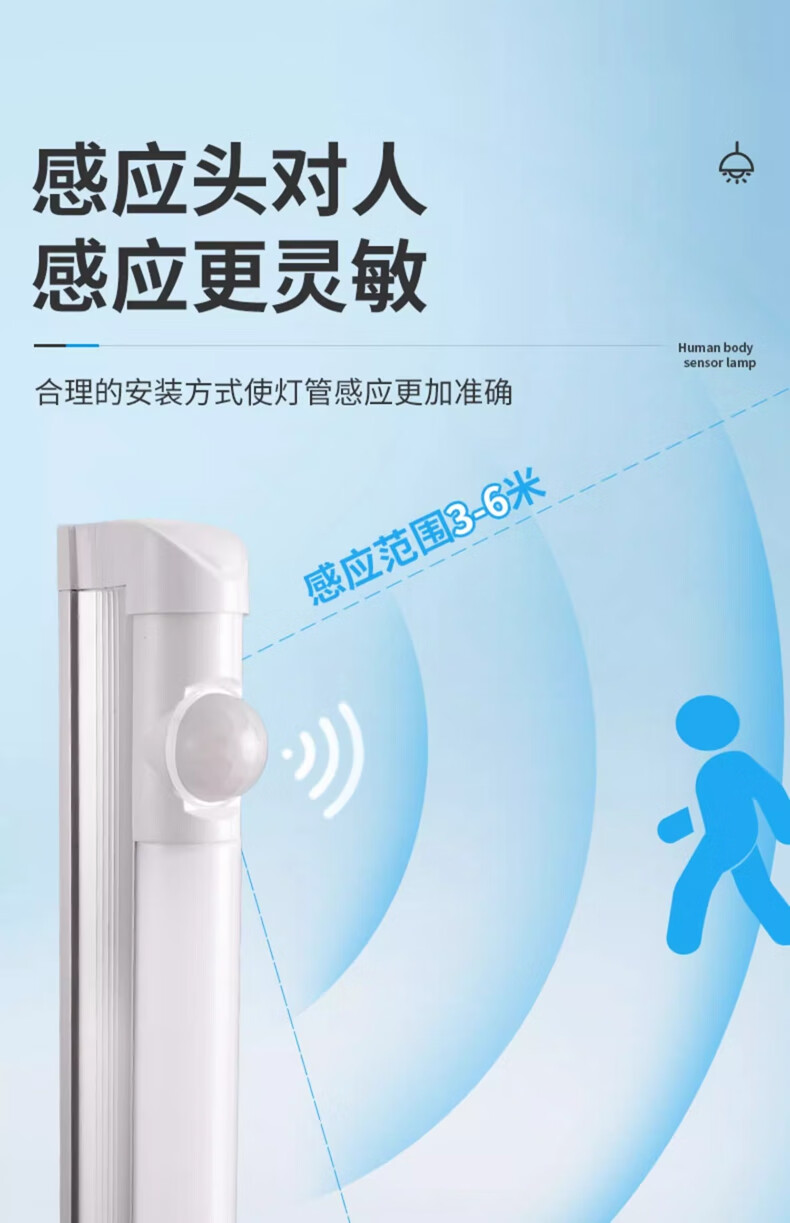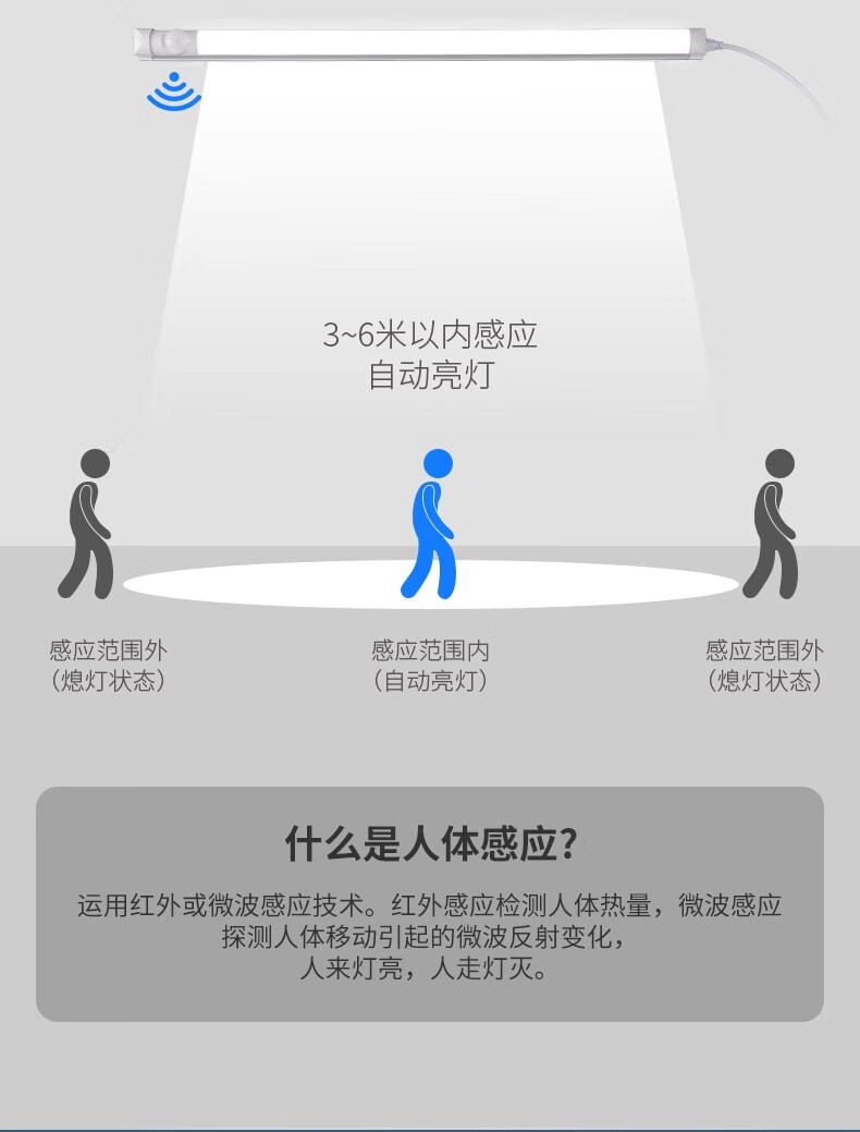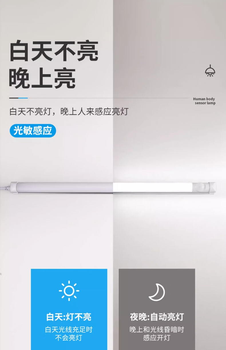 拉伯塔阳台人体感应灯管led吸顶灯厕所浴室卫生间过道走廊玄关插电壁灯 【接线款】0.6m9W-白光 人体感应灯管【全亮全灭+光控】