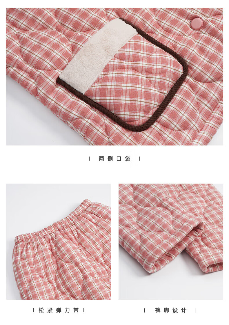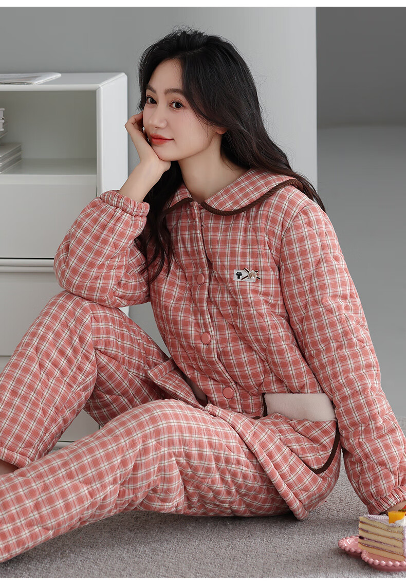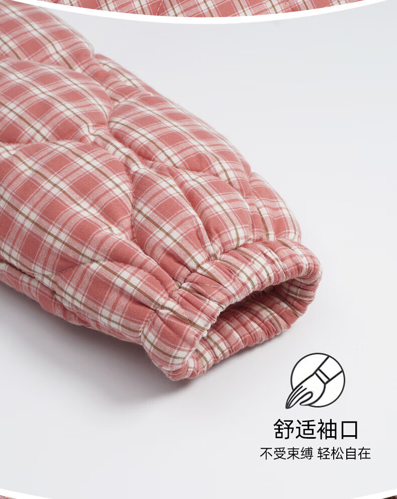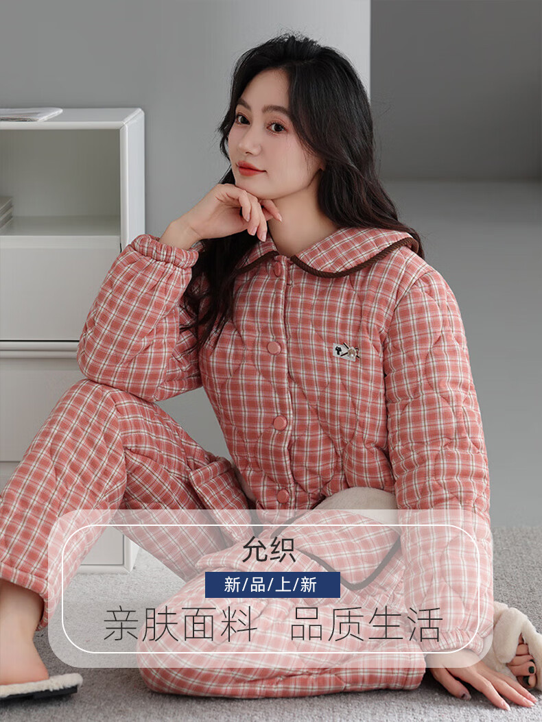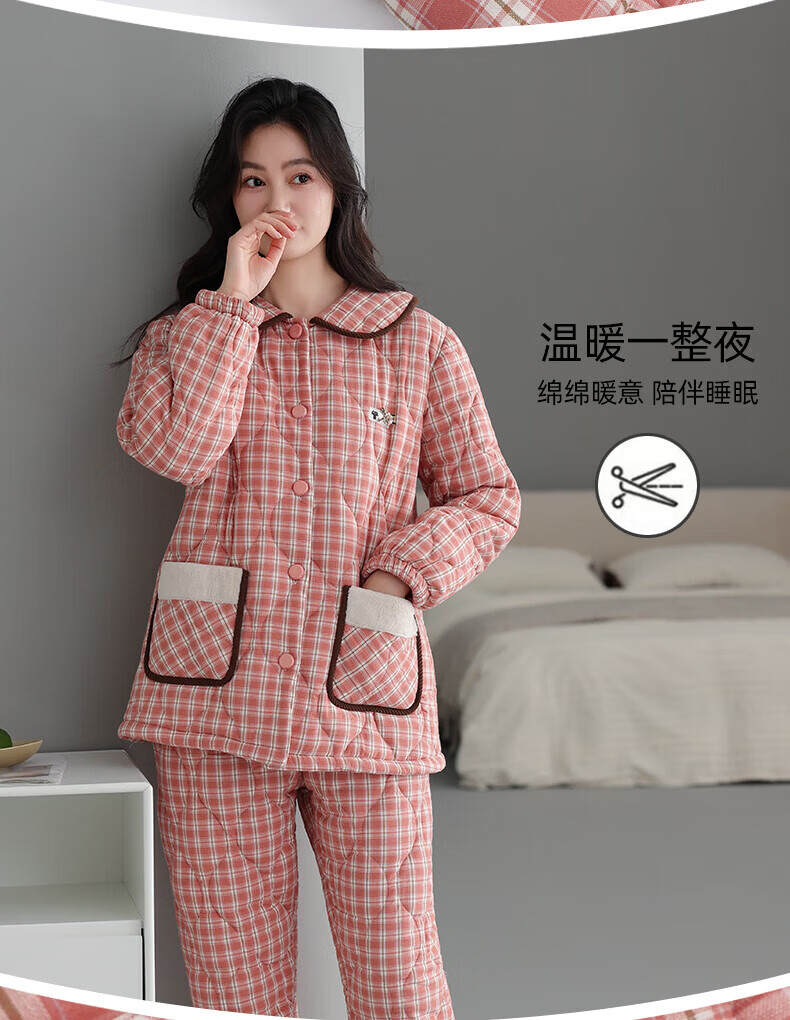 允织睡衣女冬季三层加厚加绒梭织纯棉夹棉袄秋冬款珊瑚绒高级感家居服 68045-桃粉 M (160) :建议90-110斤穿着