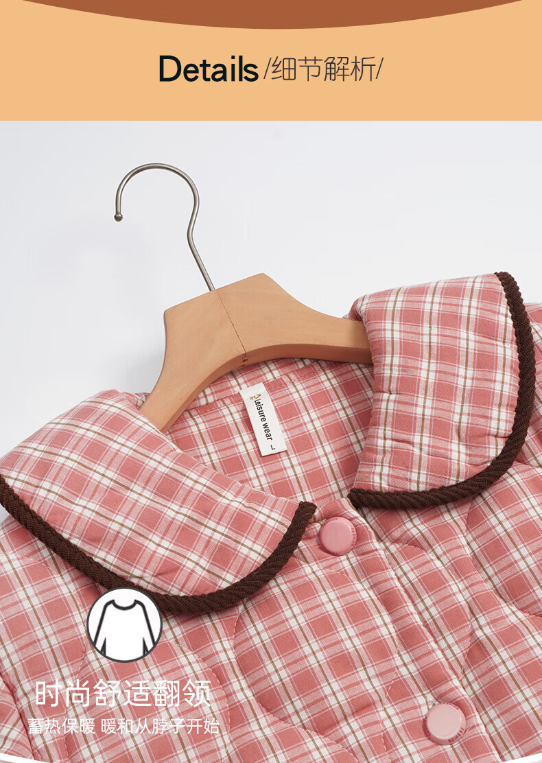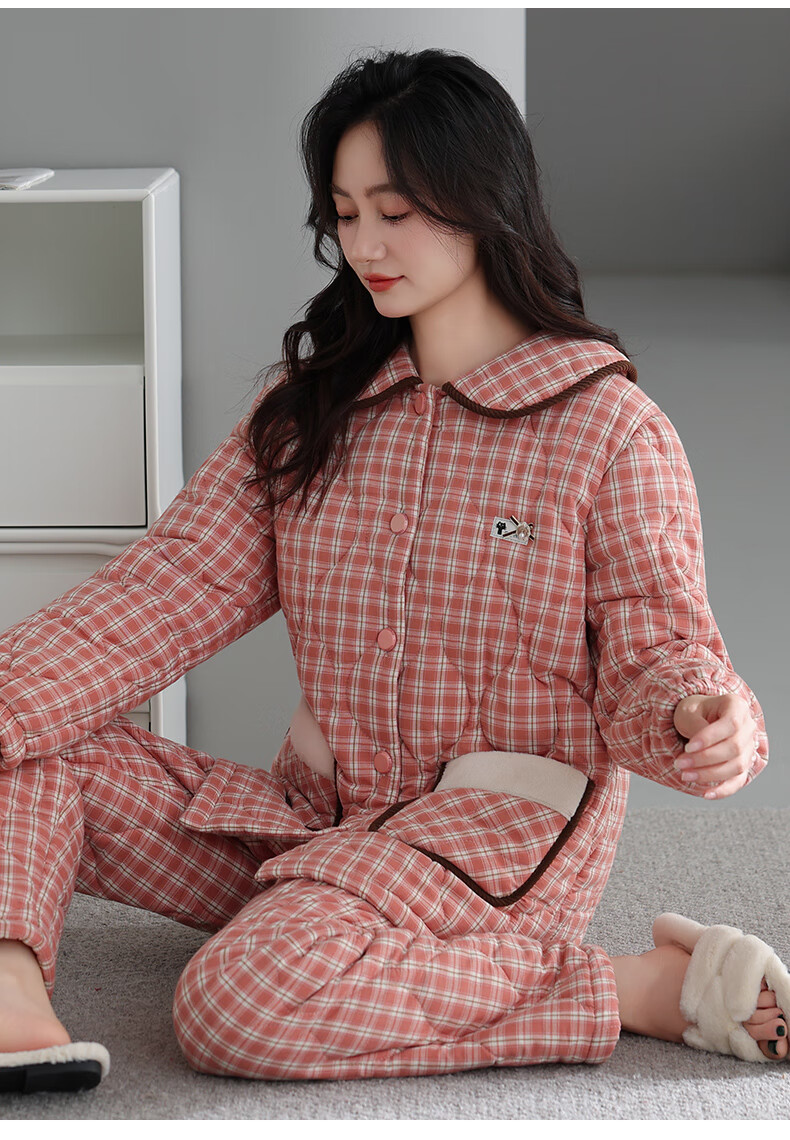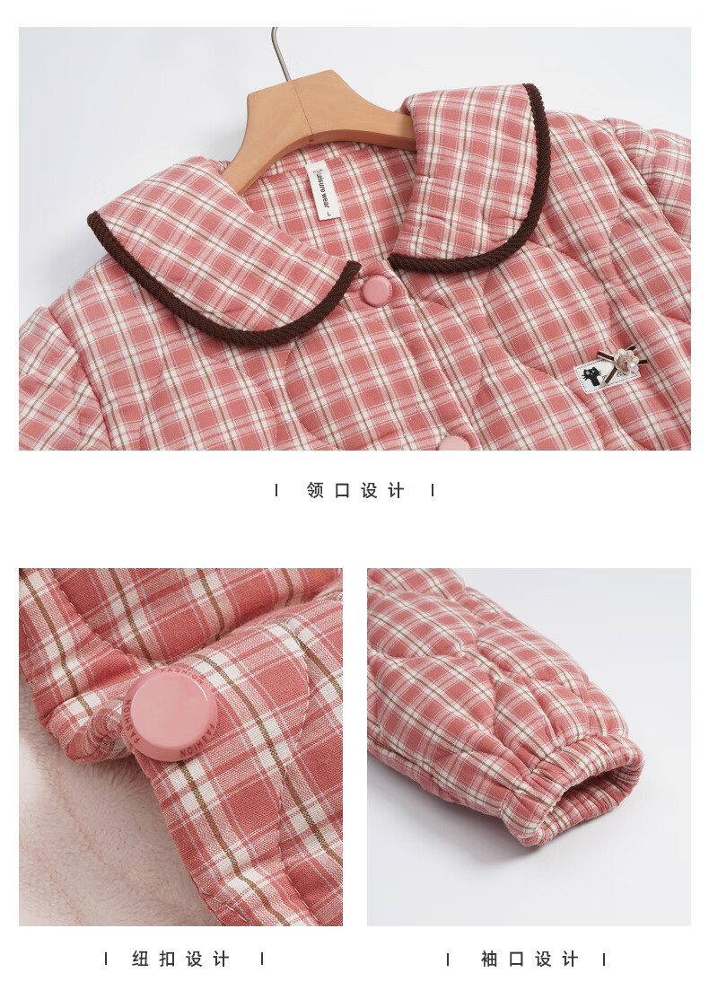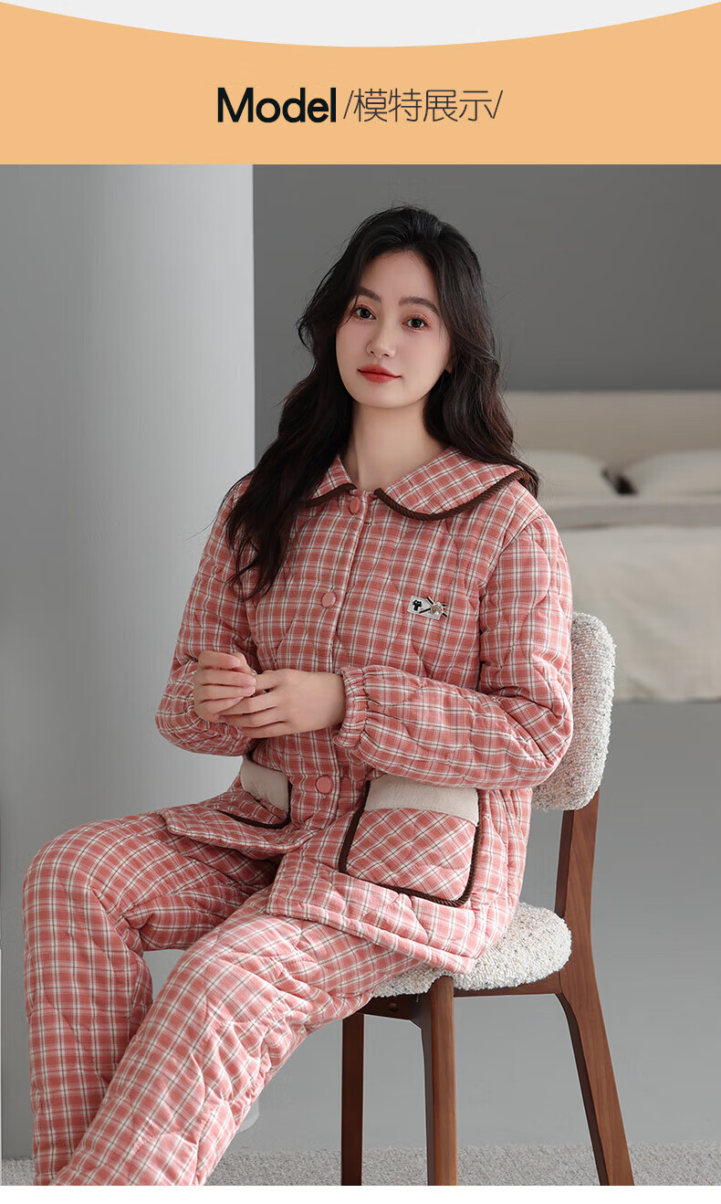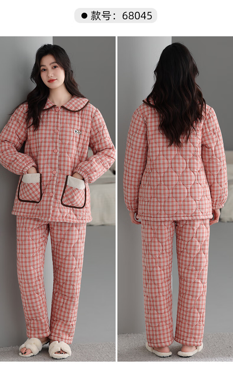 允织睡衣女冬季三层加厚加绒梭织纯棉夹棉袄秋冬款珊瑚绒高级感家居服 68045-桃粉 M (160) :建议90-110斤穿着