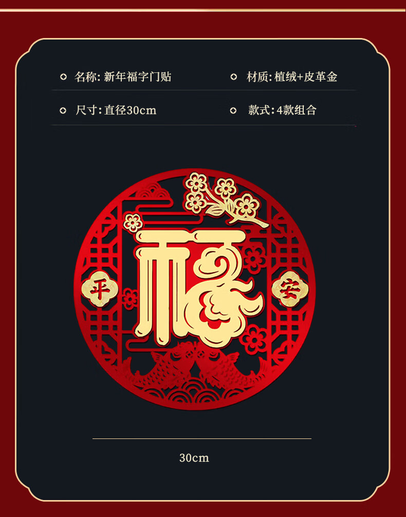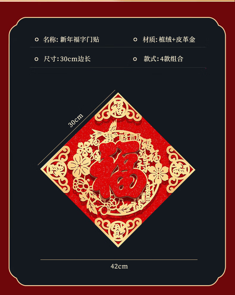 简艺饰家新年装饰福字贴4个2026马年装饰春节过年装饰立体窗花大门贴窗贴 植绒款福字4个装